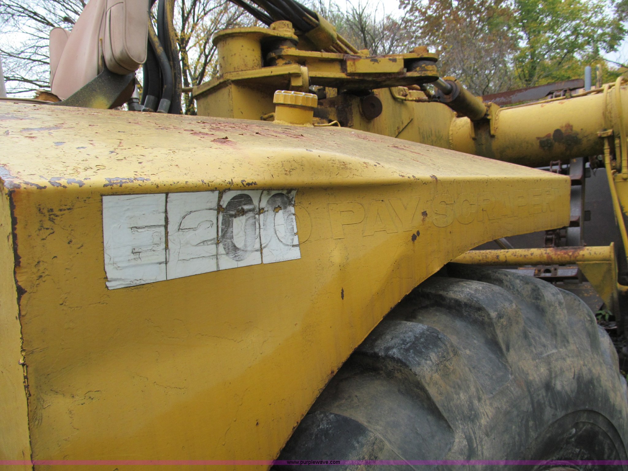 1969 International E200 Pay Scraper paddle scraper. 1,011 hours on meter, International six cylinder turbo diesel engine 135 HP, Allison two speed transmission, 9.5 cu. yd. capacity, 23.5x25 tires, 29,924 lbs. base operating weight, Operational when parked seven years ago, Serial 001775X. Shipping quotes available. 13680 S 2900 Rd. Harwood, MO 64750