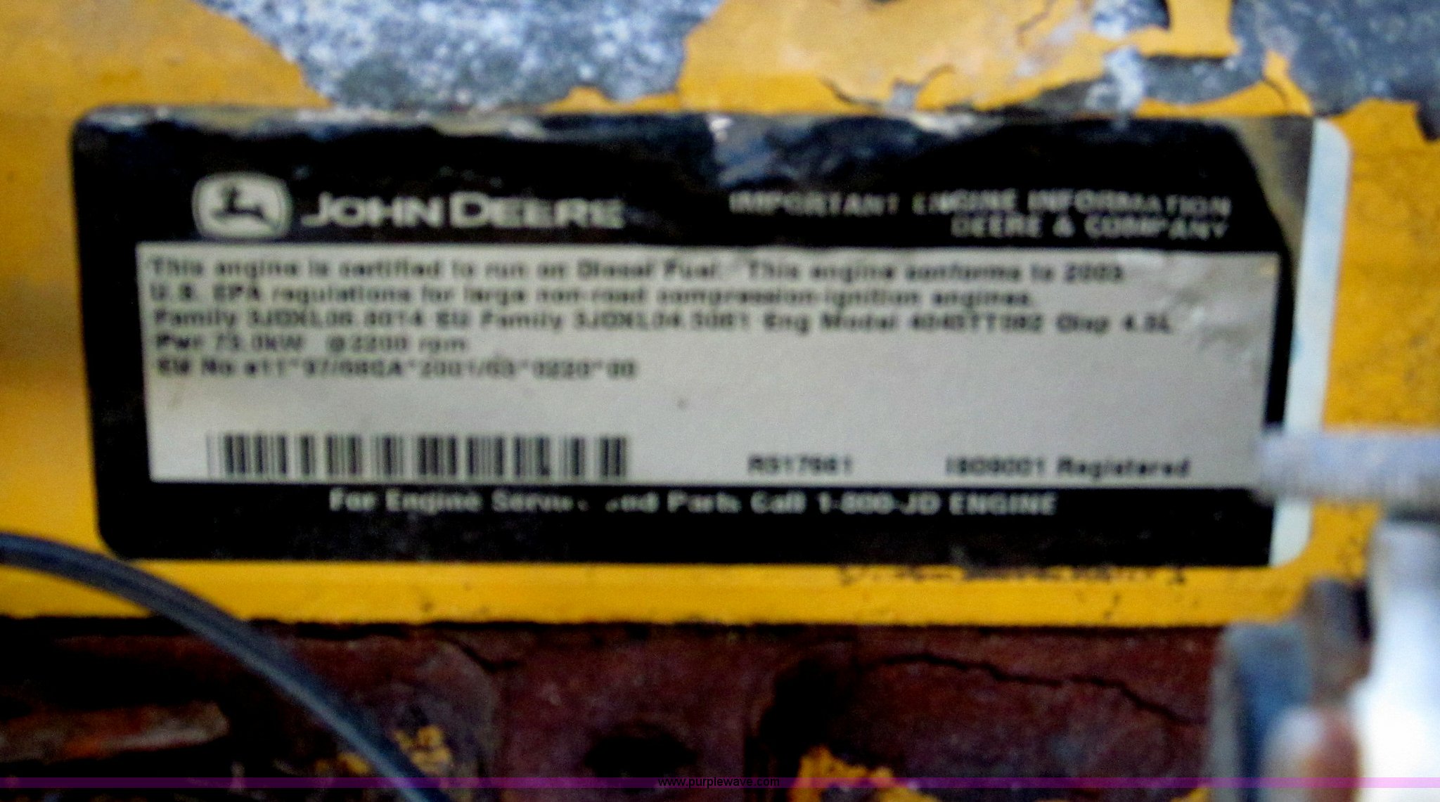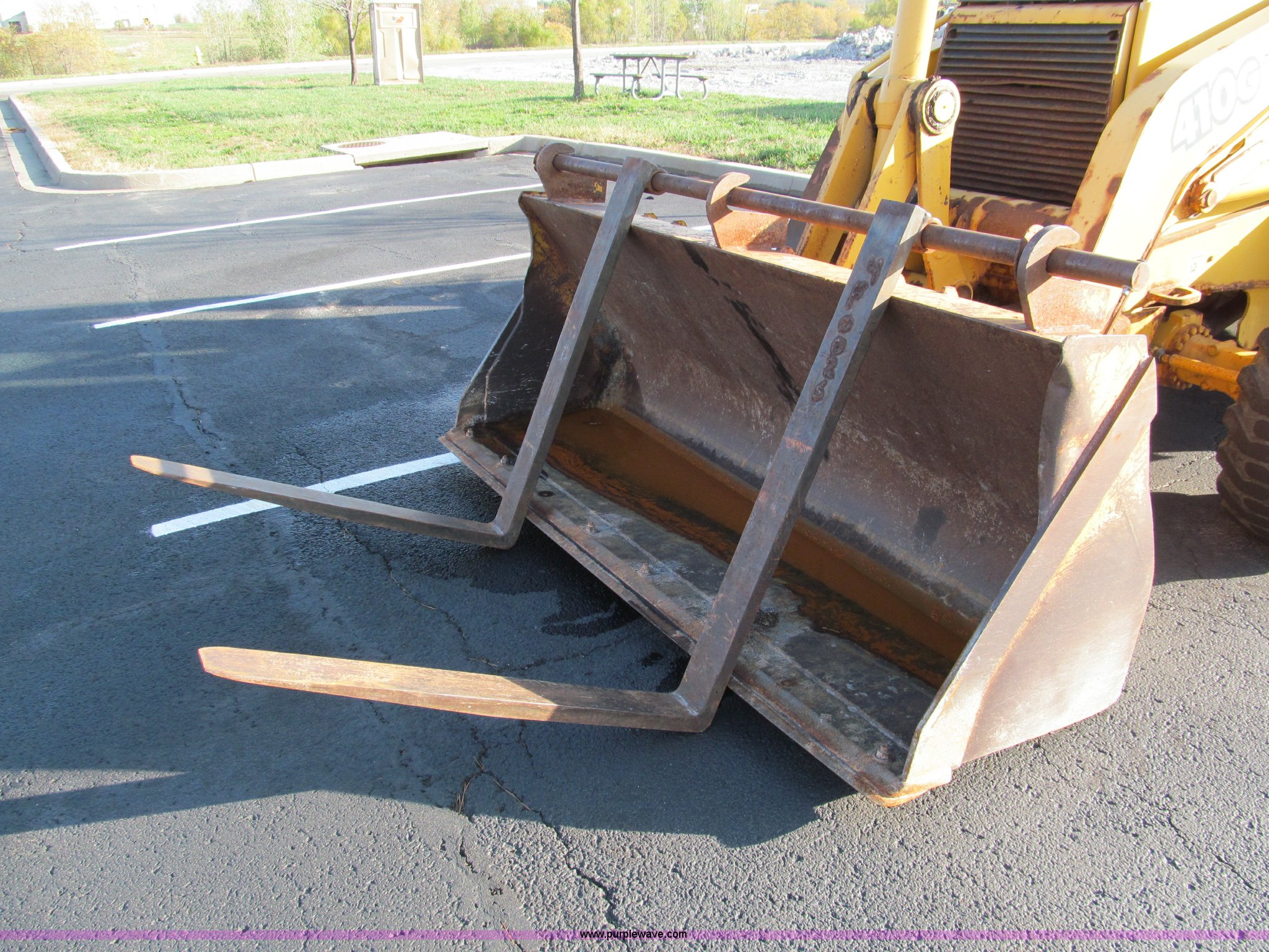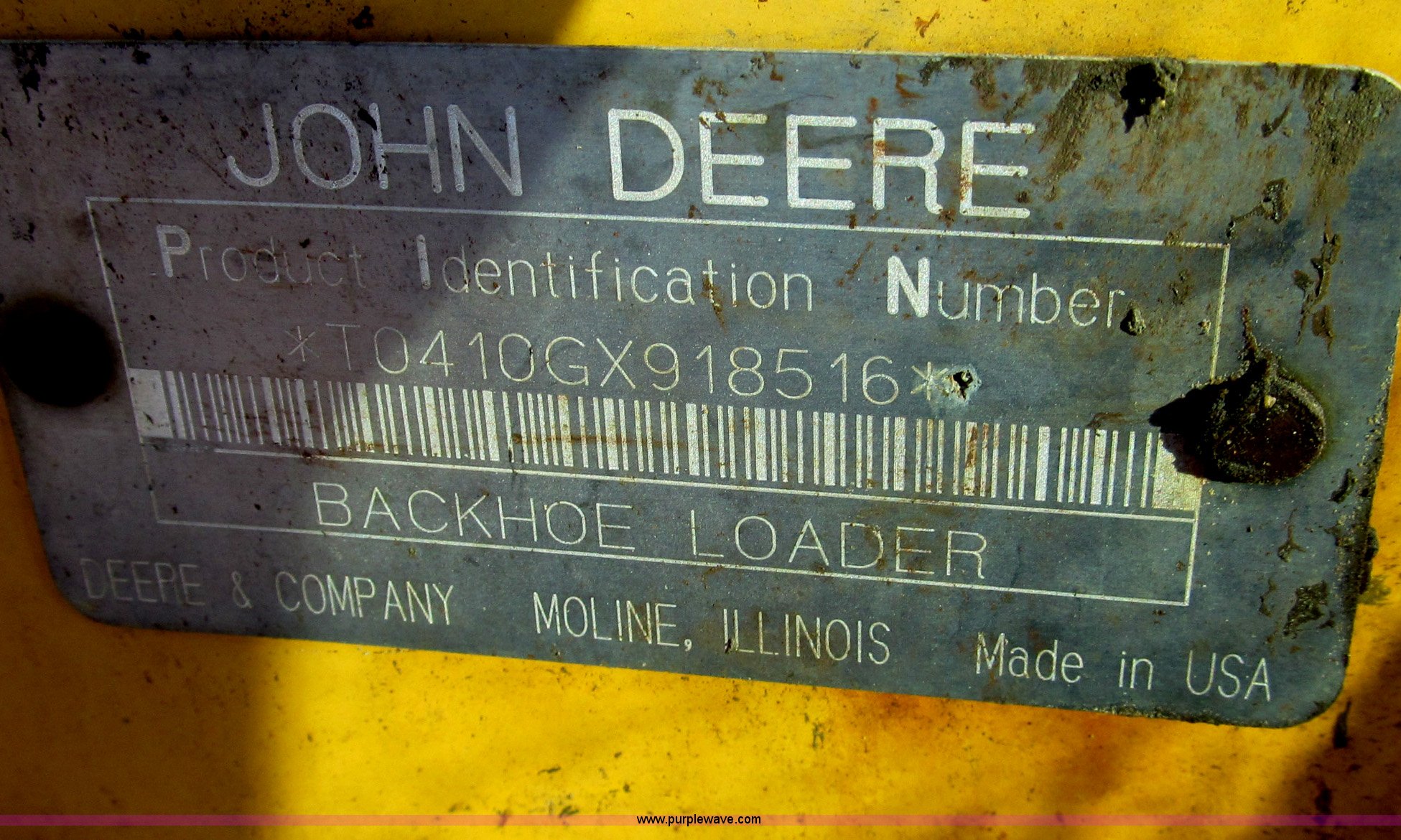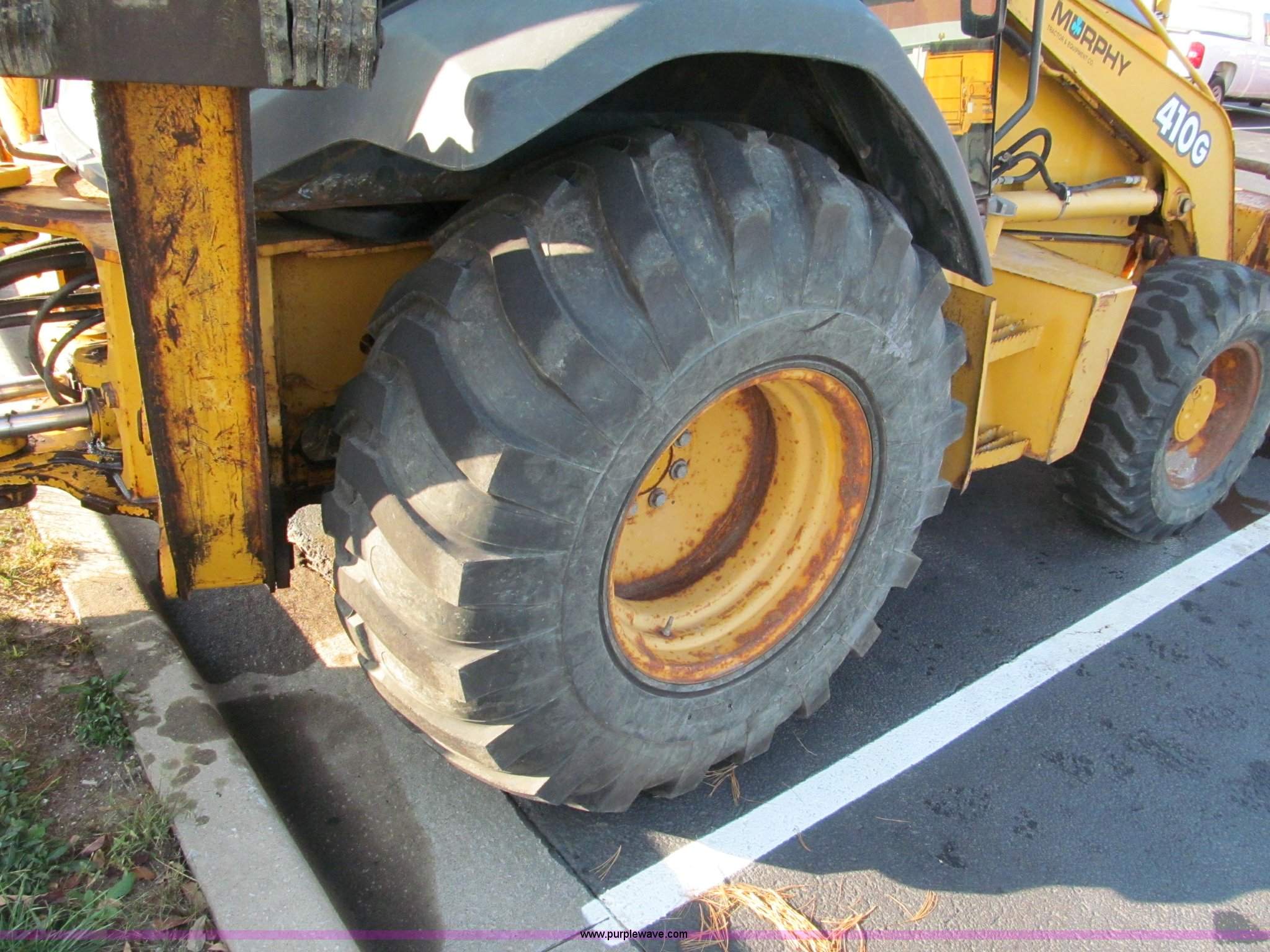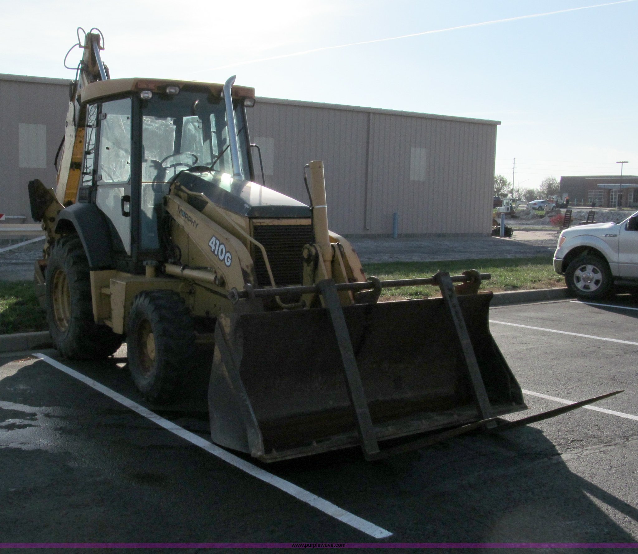 Purple Wave is selling a used Tractor Loader Backhoe in Missouri. This item is a 2003 John Deere 410G backhoe with the following: 4,224 hours on meter, John Deere 4045T 4.5L four cylinder diesel engine, 115 HP, 73 kW, Four wheel drive, Enclosed cab, AC and heat, AM/FM, Wobble stick controls, Extend-A-Hoe, 32" mechanical thumb, (2) backhoe buckets, 48"W smooth, 24"W toothed, 15'10" max dig depth, 92"W loader bucket, Bolt-on cutting edge, 42" pallet forks included, 12.5/80/18 front tires, 21L-24 rear tires, 15,000 lbs. base operating weight, Serial TD410GX918516