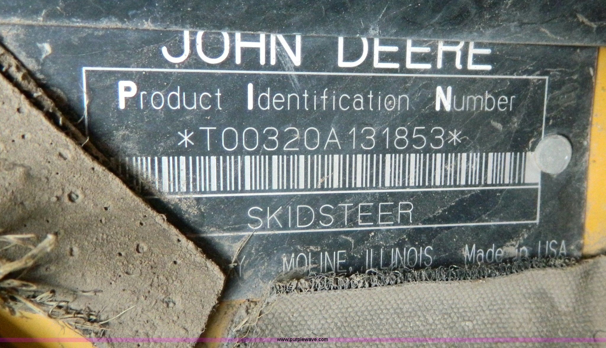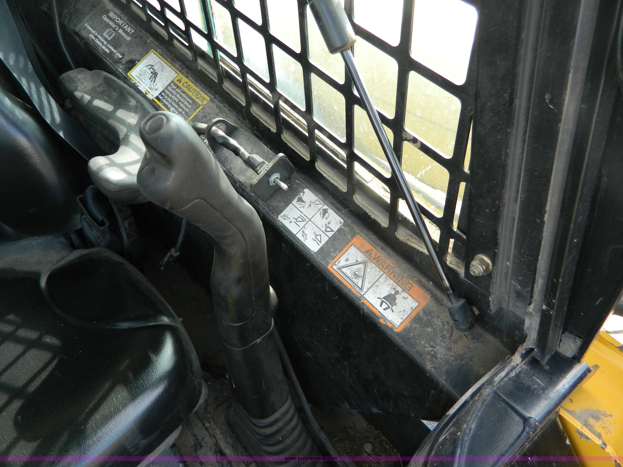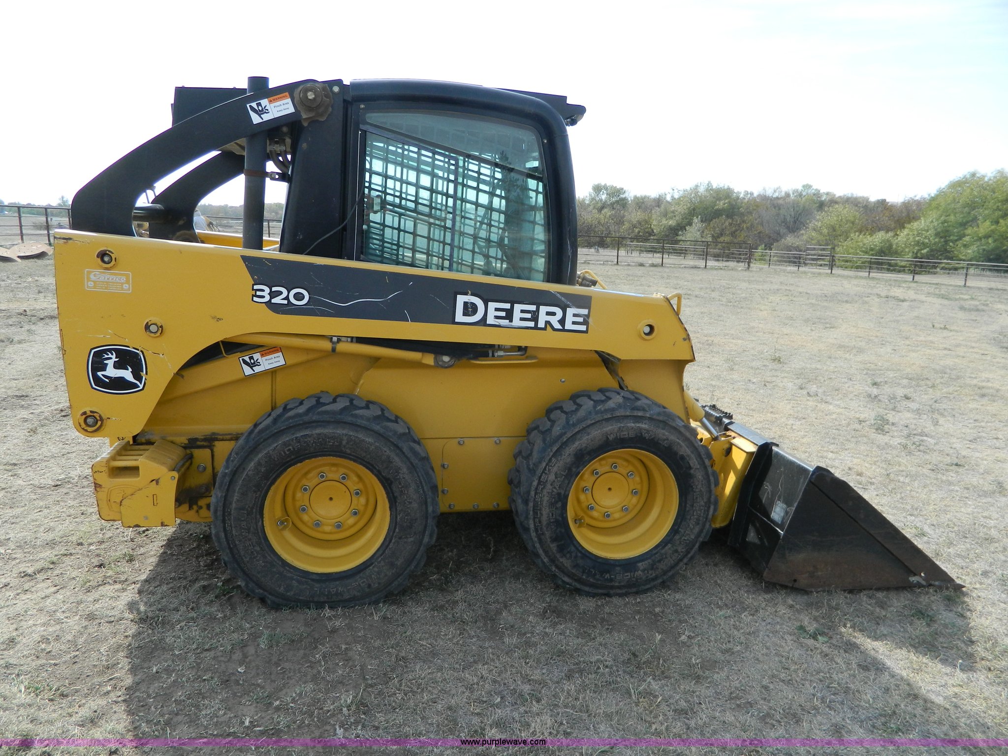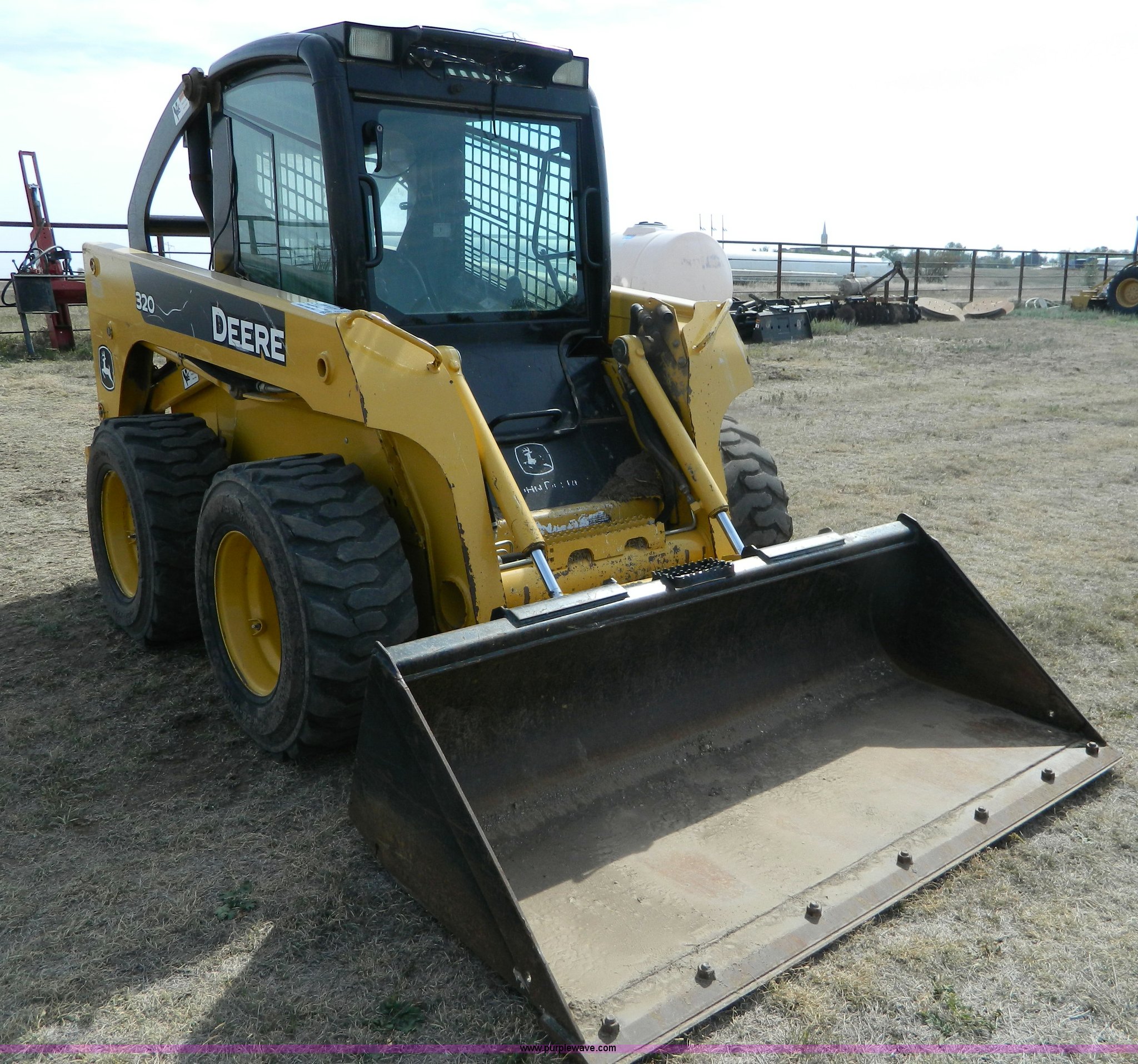 Purple Wave is selling a used Skid Steer Loader in Kansas. This item is a 2006 John Deere 320 skid steer with the following: 901 hours on meter, Hours may vary, John Deere 4024T four cylinder diesel engine, 66 HP, AC and heat, Stick and foot controls, Smooth edge bucket, C-72JD, 2,300 lb operating capacity, Rear weights, 6,435 lbs. base operating weight, 12-16.5 wide wall tires, Serial T00320A131853