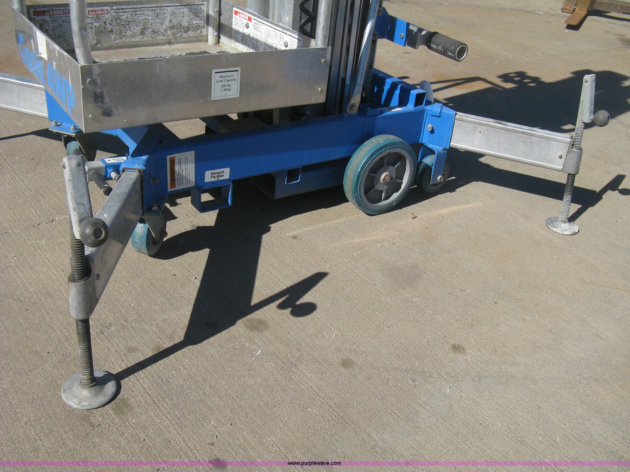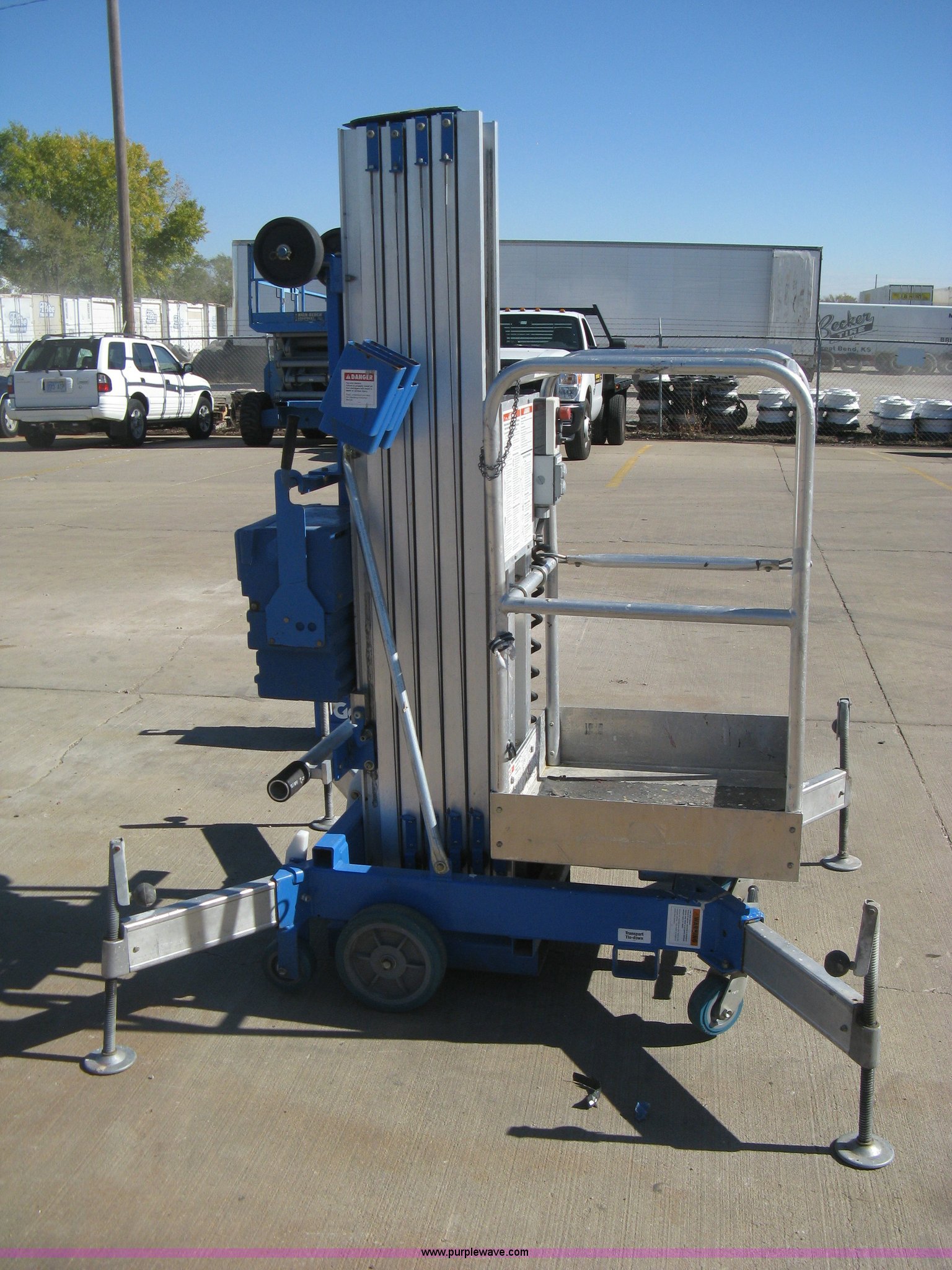 Purple Wave is selling a used Scissor or Vertical Lift in Kansas. This item is a Genie AWP-24 electric man lift with the following: 24' maximum platform height, Mast style lift, 300 lbs maximum lift capacity, (4) manual level outriggers, Weak battery, Serial 3892-369