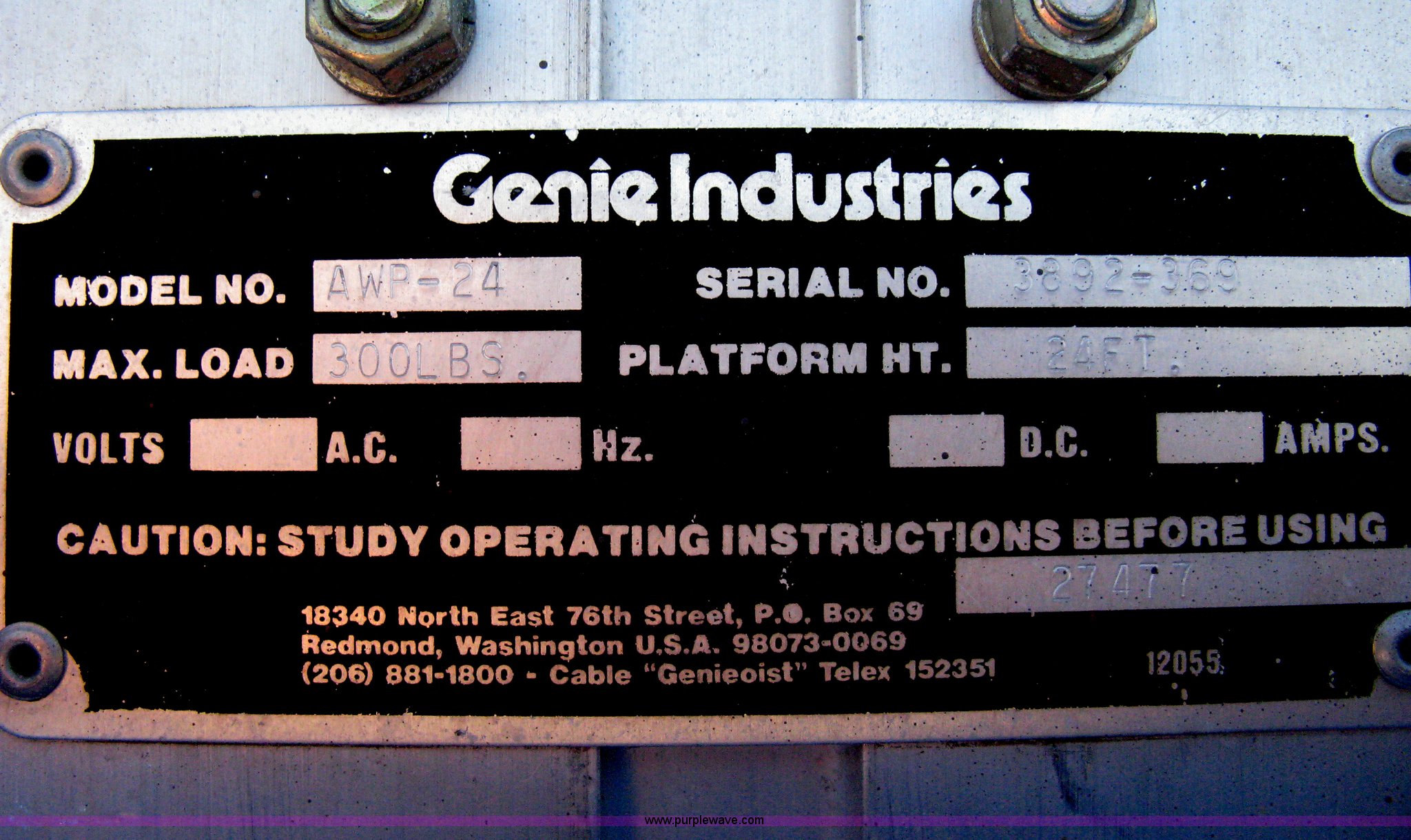 Genie AWP-24 electric man lift has sold in Wichita, Kansas for $4070. Item M9100 sold on November 15th, 2012.
