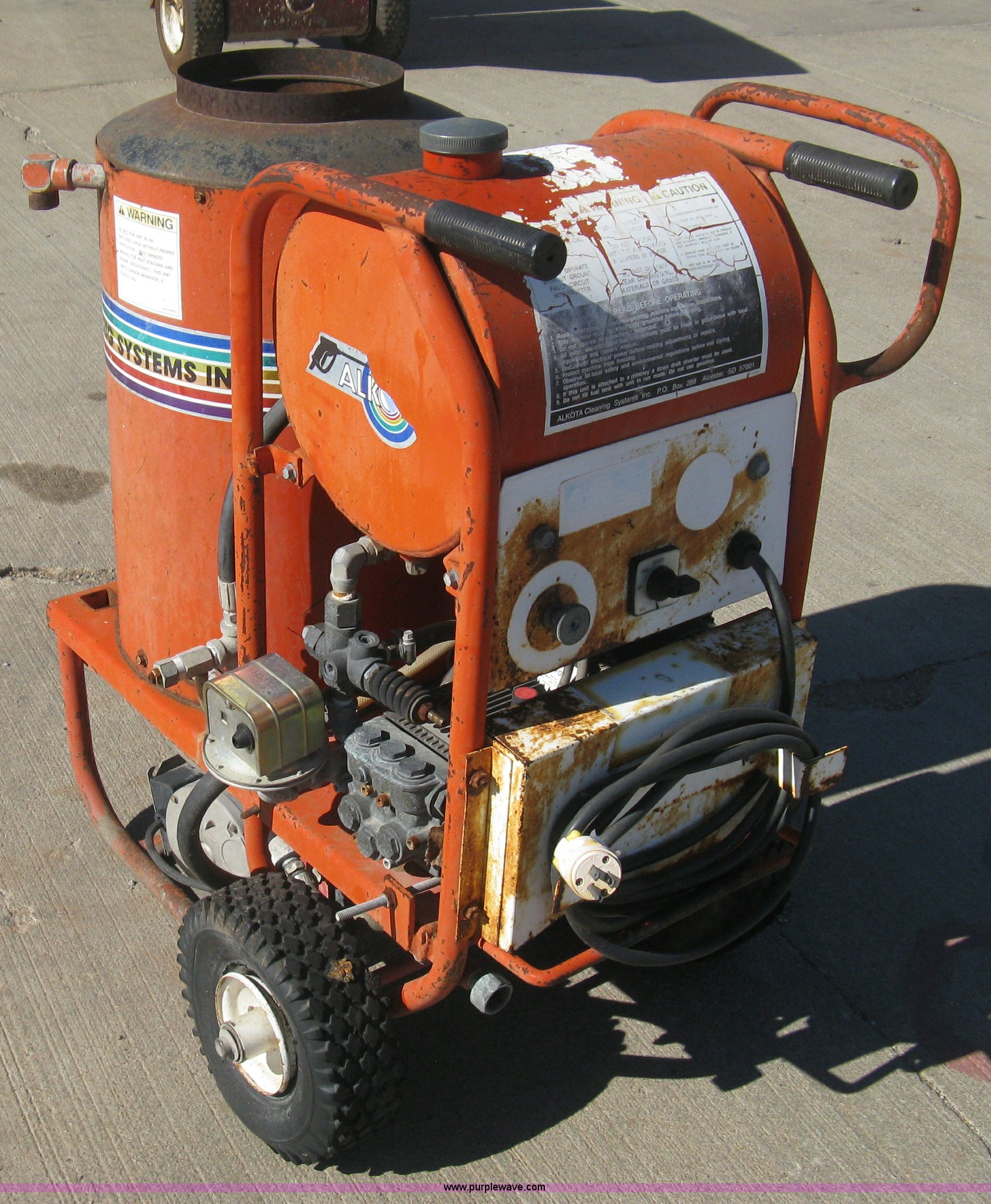 Purple Wave is selling a used Tools in Kansas. This item is a Alkota 2142AE heated pressure washer with the following: 2 HP electric motor, 110 volt, Dolly mounted, No hose or spray wand
