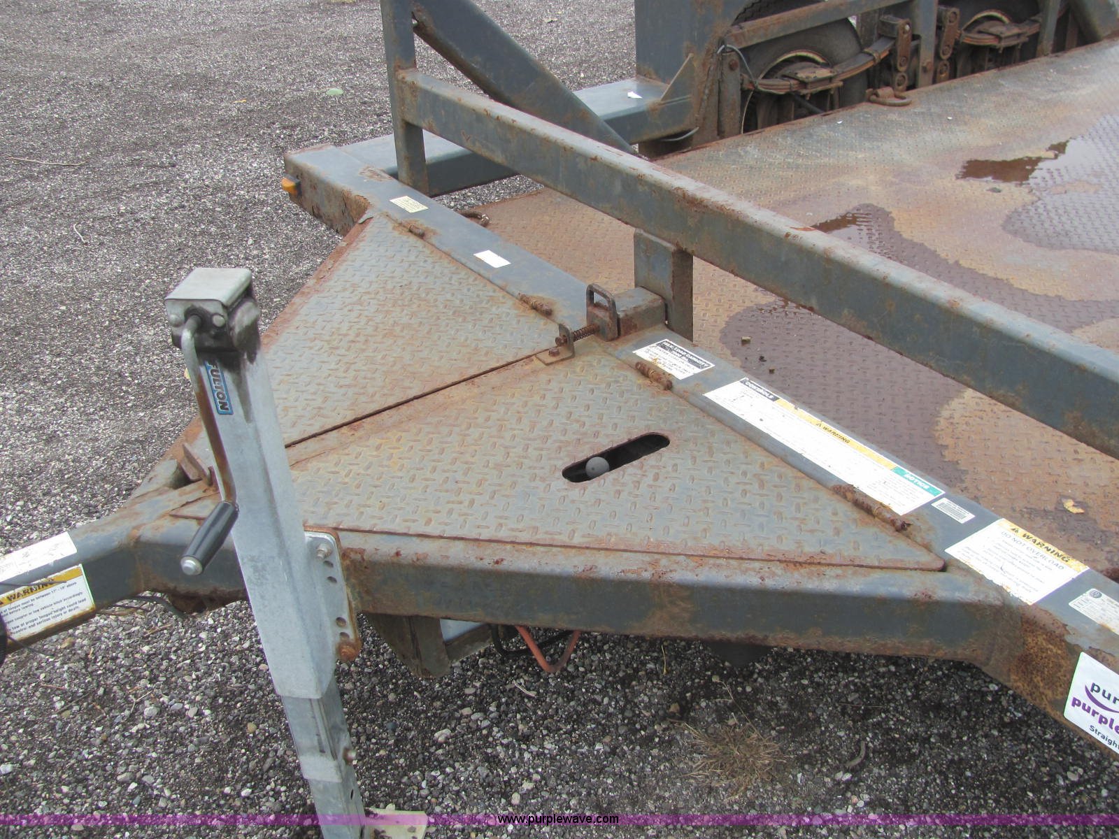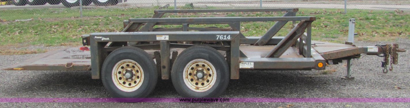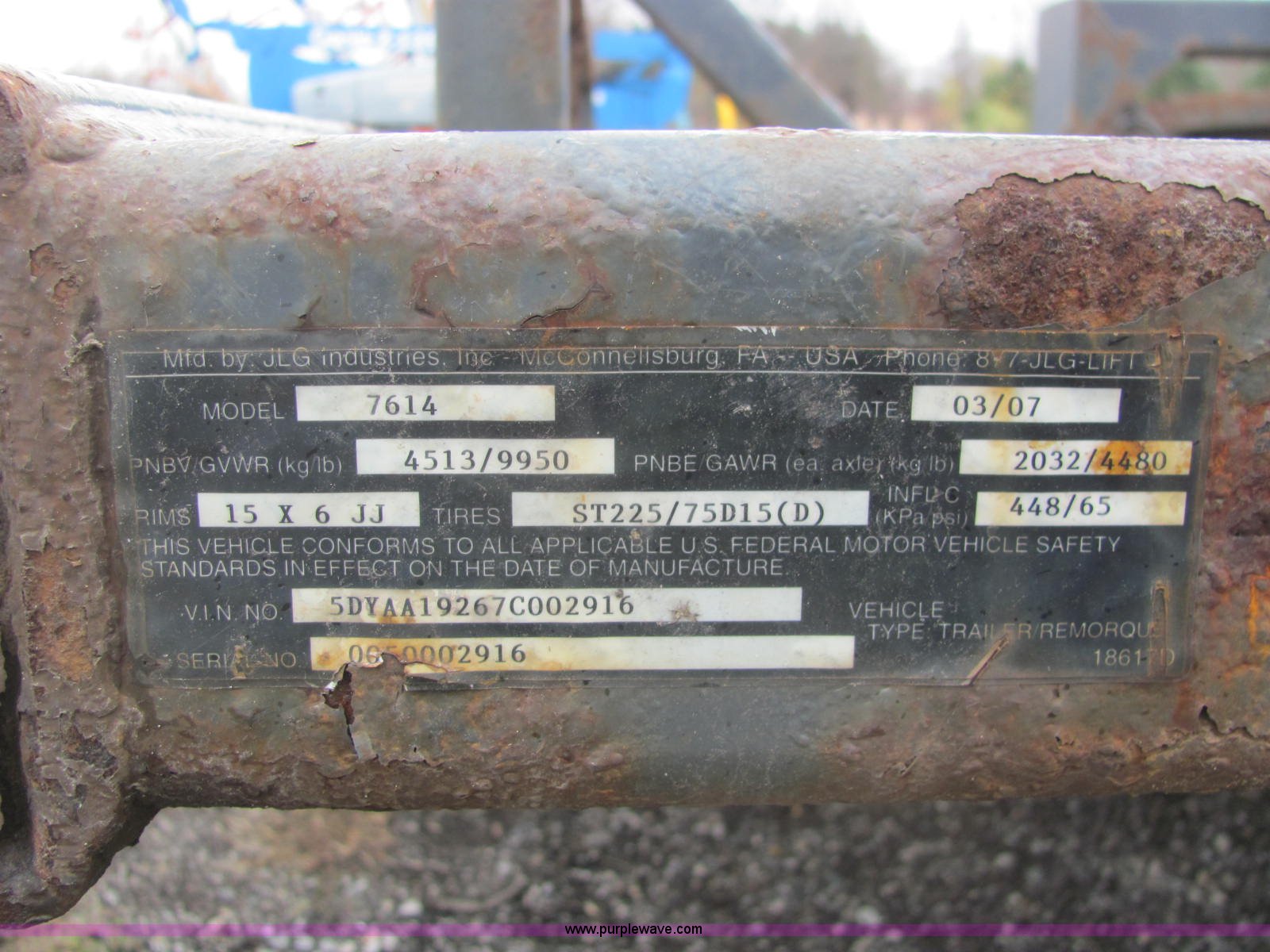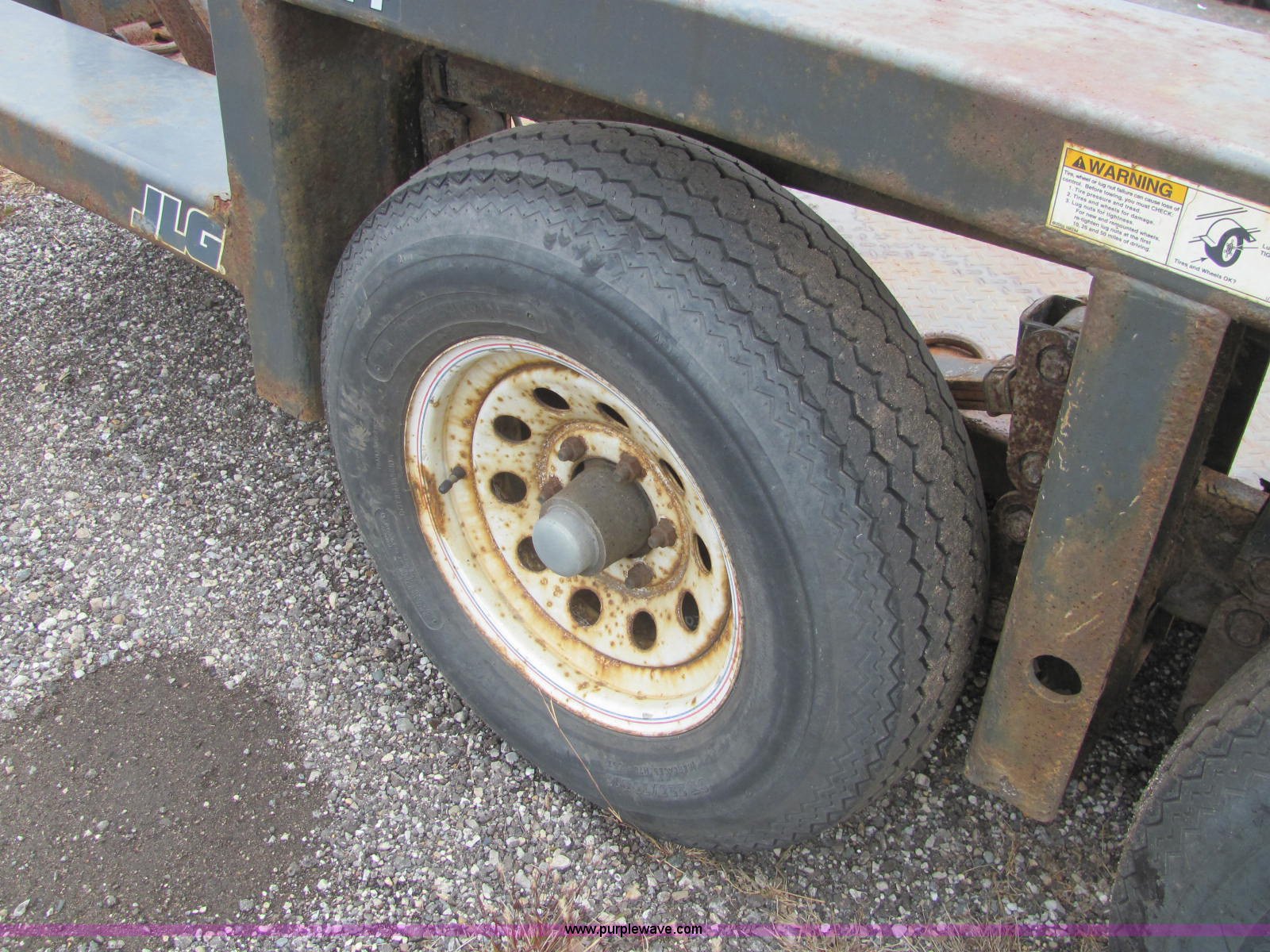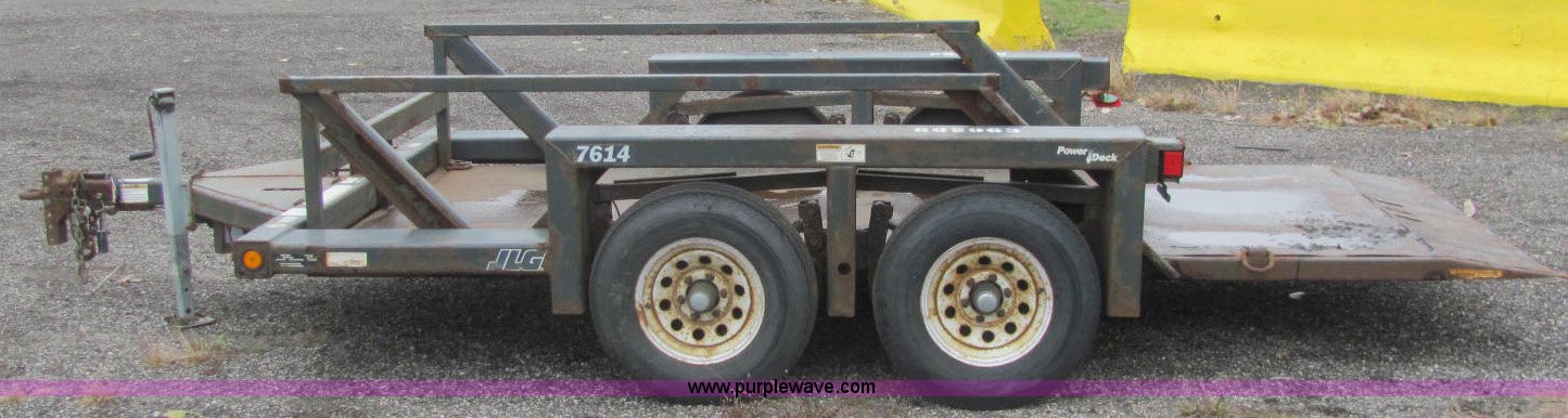 Purple Wave is selling a used Car or Utility Trailer in Michigan. This item is a 2007 JLG 7614 tandem axle drop deck flatbed trailer with the following: 19'L x 101"W overall, 14'L x 6' deck, Electric brakes, Power deck system, Single lever hydraulic control, Quadra spring suspension, D-ring tie downs, Pintle hitch, ST225/75R15 tires, GVWR 7,000 lbs, EIN 6822963RA