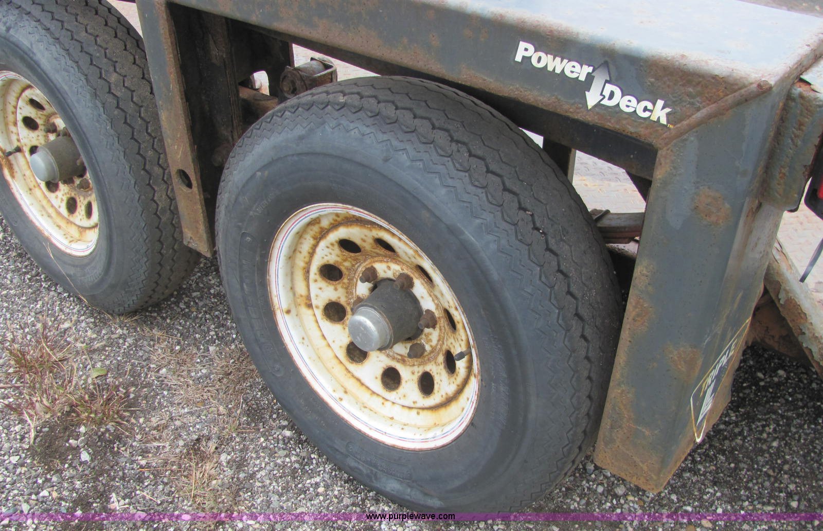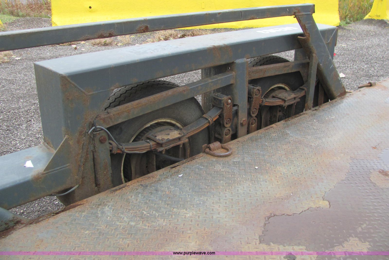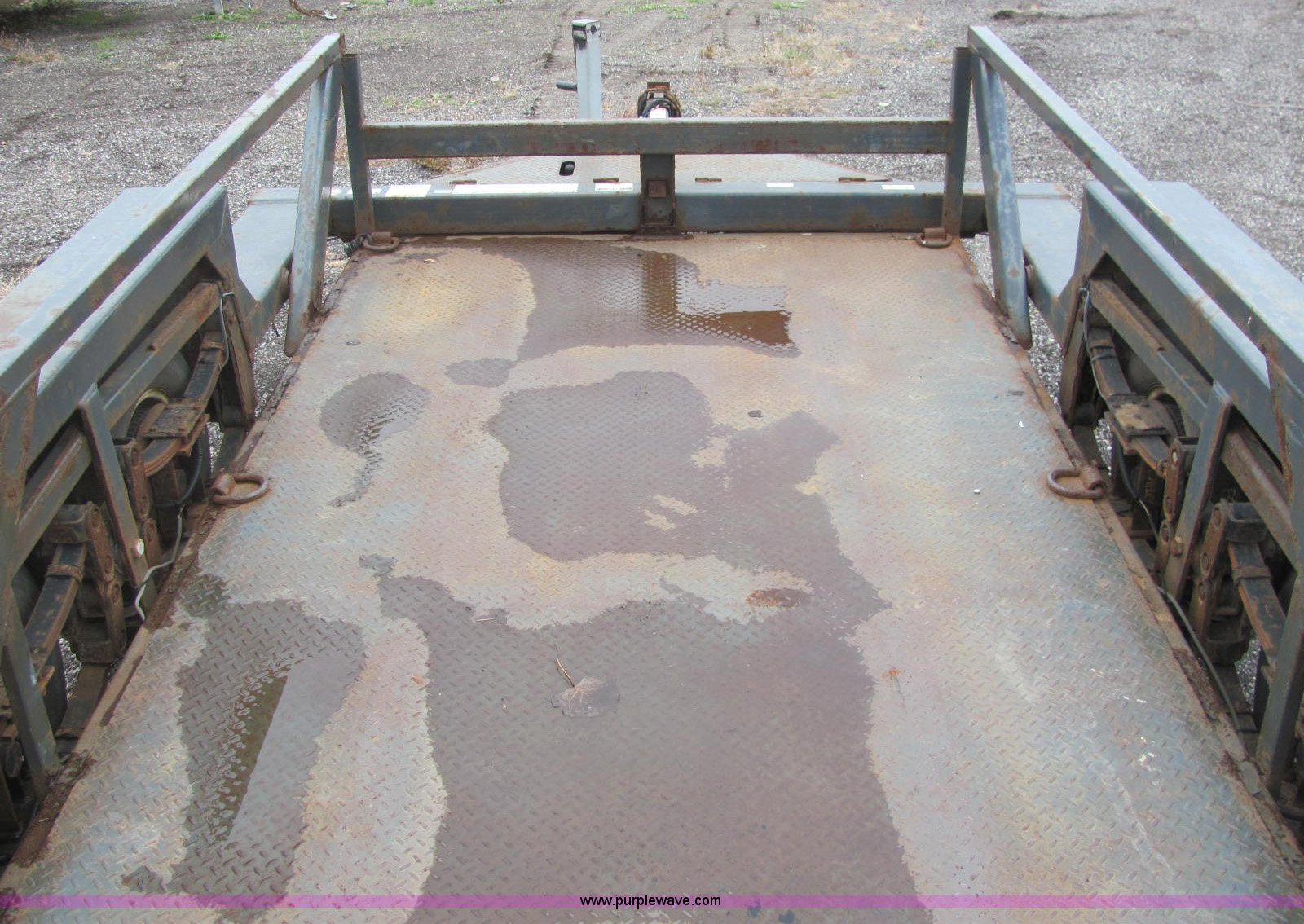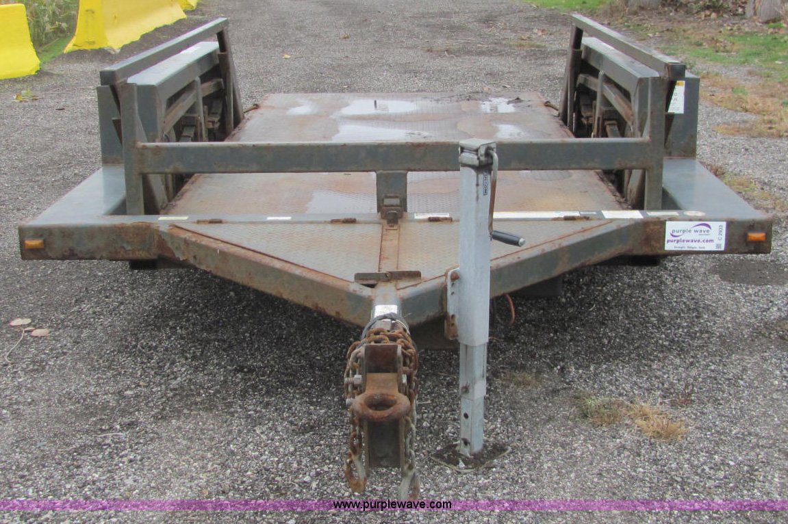 Purple Wave is selling a used Car or Utility Trailer in Michigan. This item is a 2007 JLG 7614 tandem axle drop deck flatbed trailer with the following: 19'L x 101"W overall, 14'L x 6' deck, Electric brakes, Power deck system, Single lever hydraulic control, Quadra spring suspension, D-ring tie downs, Pintle hitch, ST225/75R15 tires, GVWR 7,000 lbs, EIN 6822963RA