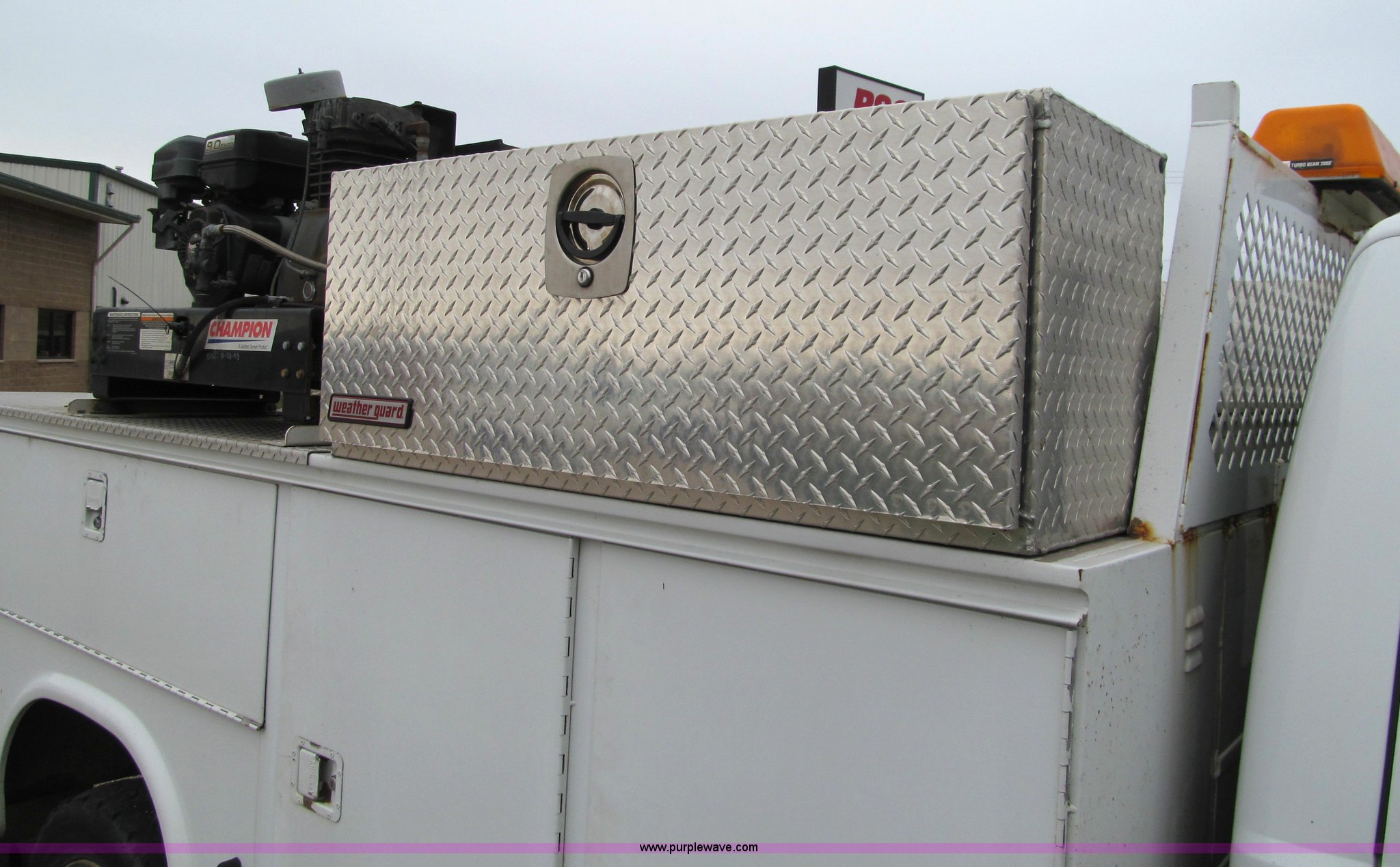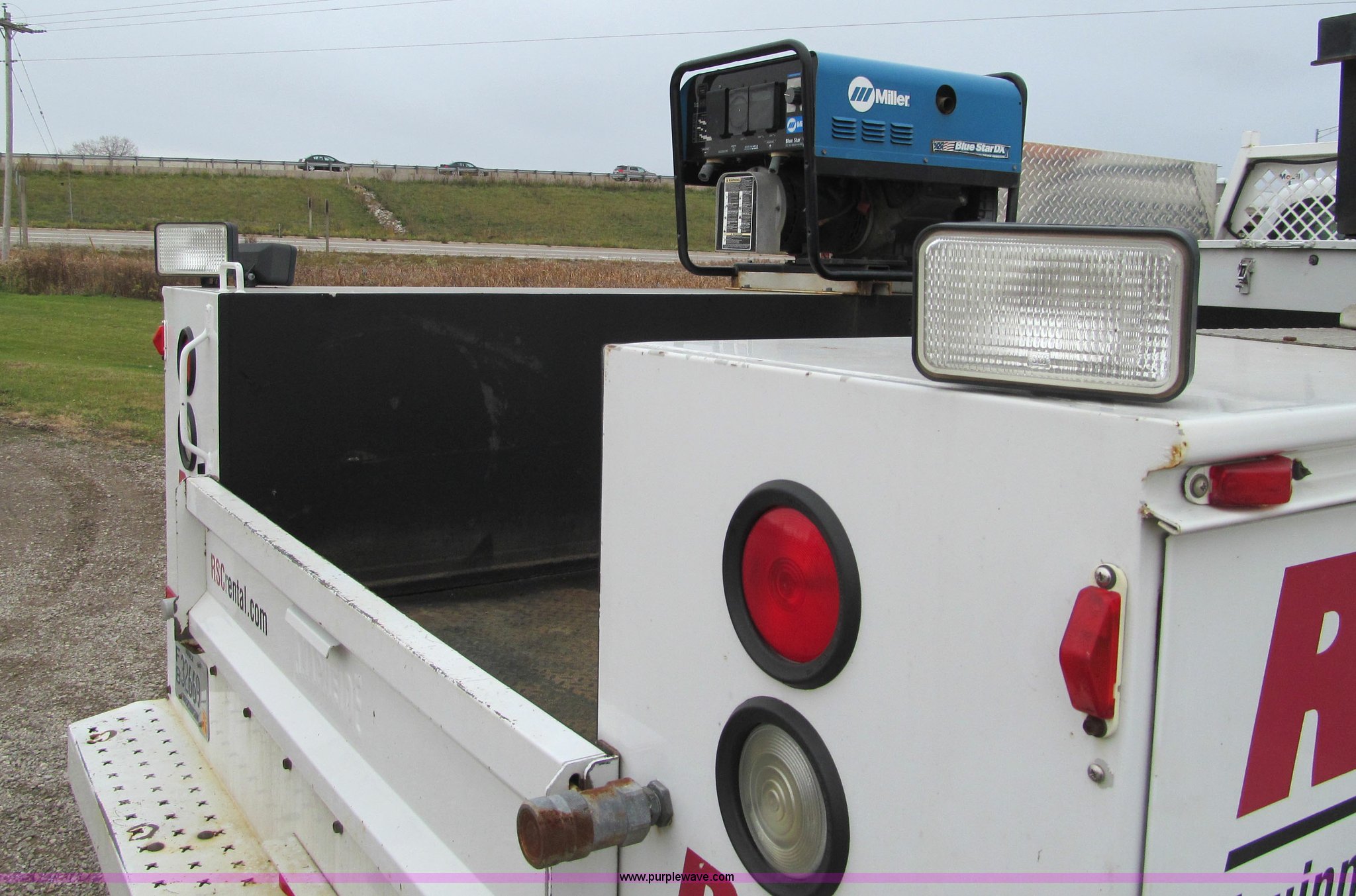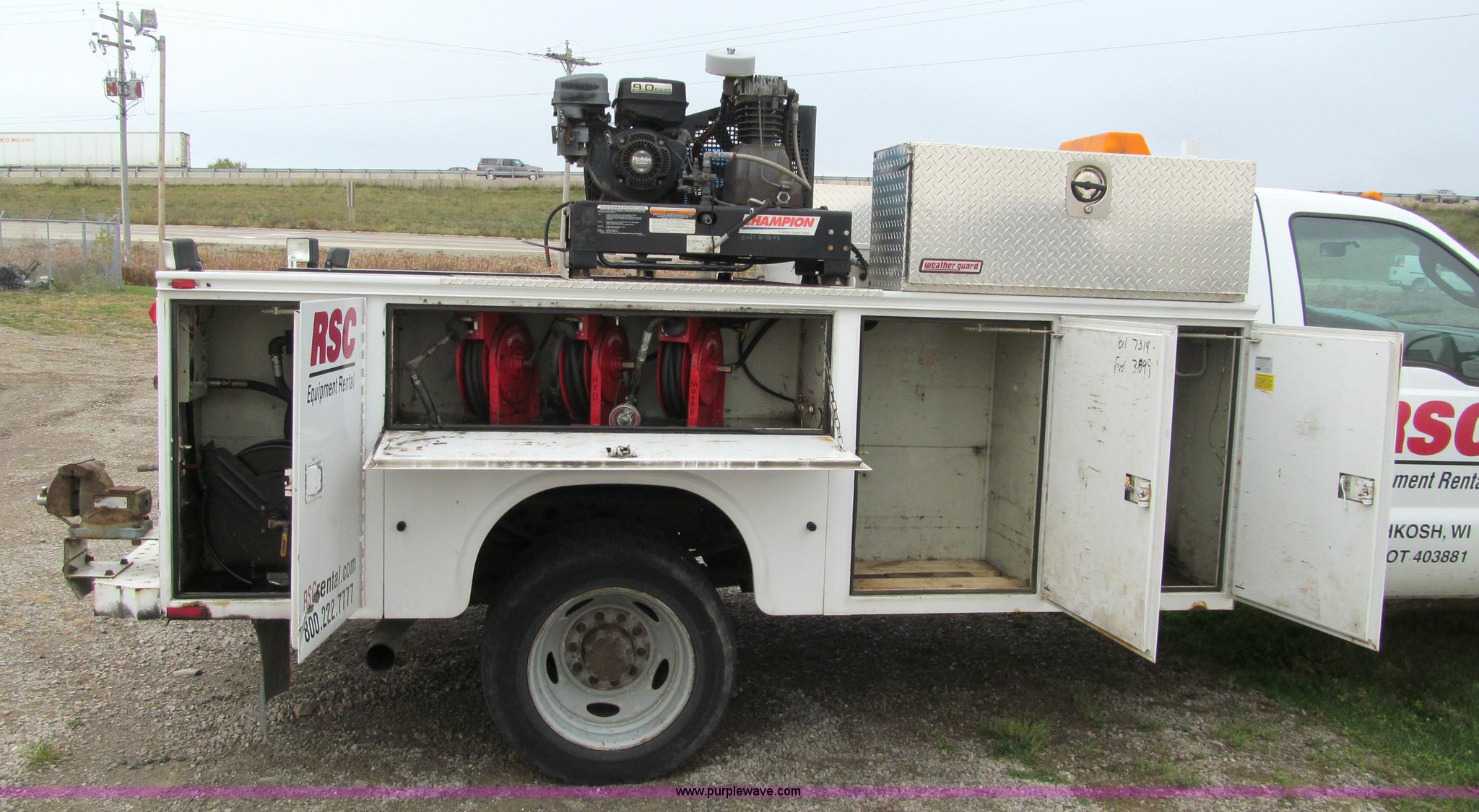 Purple Wave is selling a used Service Truck in Wisconsin. This item is a 2006 Ford F550 XL Super Duty service truck with the following: 164,829 miles on odometer, Powerstroke 6.0L V8 turbo diesel engine, Automatic transmission, Four wheel drive, Lock out hubs, AC and heat, Tilt, Cruise, AM/FM/CD, Manual windows and locks, Vinyl interior, Long bed, Knapheide utility bed, (8) compartments, Toolbox, (2) additional WeatherGuard toolboxes, Miller Blue Star 185 welder, Engine does not turn over, Champion 9 HP air compressor, Remote air tank, Three reel lubrication system, 20 gallon engine oil tank, 20 gallon hydraulic oil tank, Grease, 40 gallon pump in/out waste oil tank, Rear vise, Work lights, Air hose with retractable hose, Strobe lights, Receiver hitch, Trailer wiring, EIN 616706RA