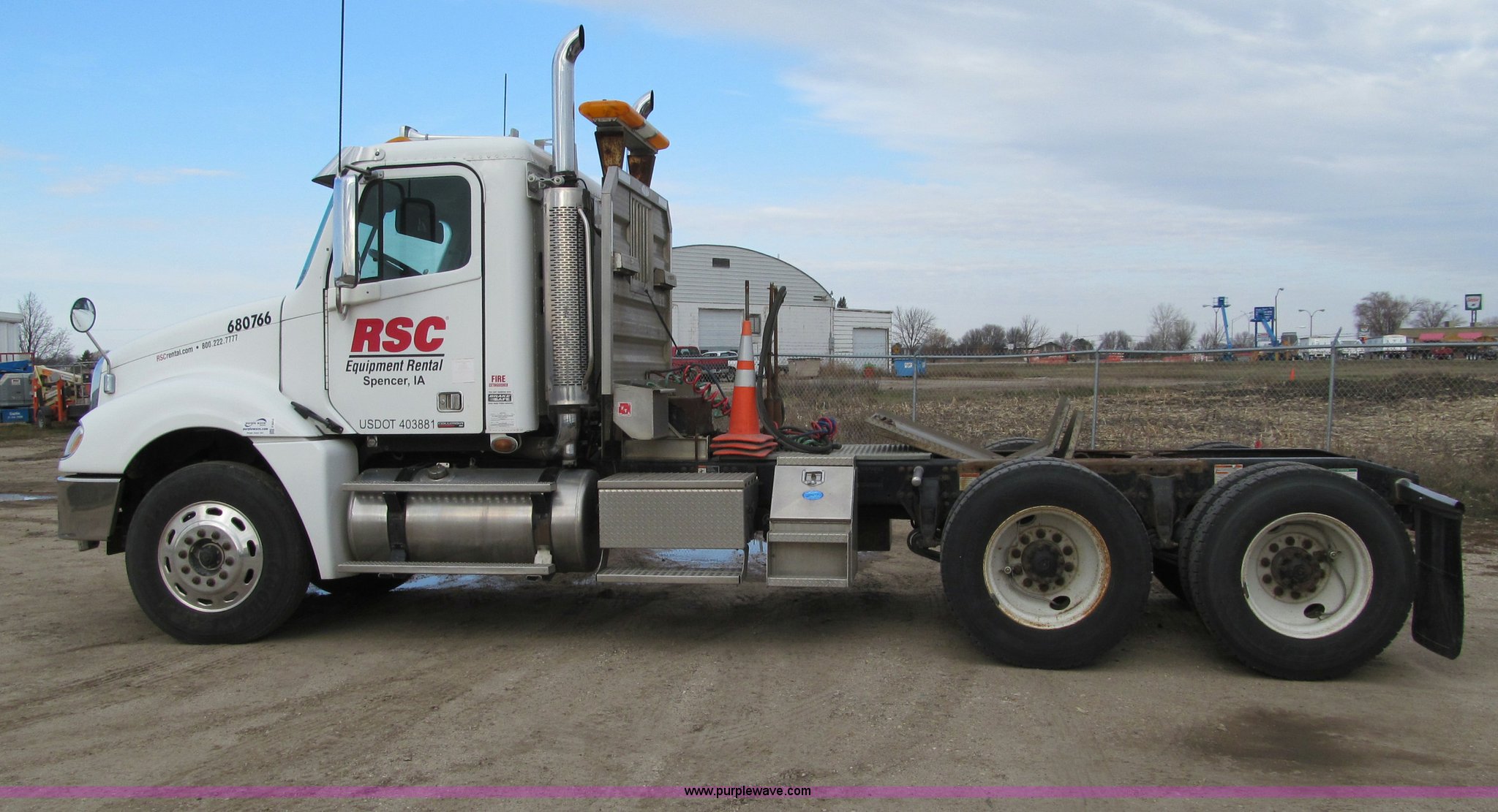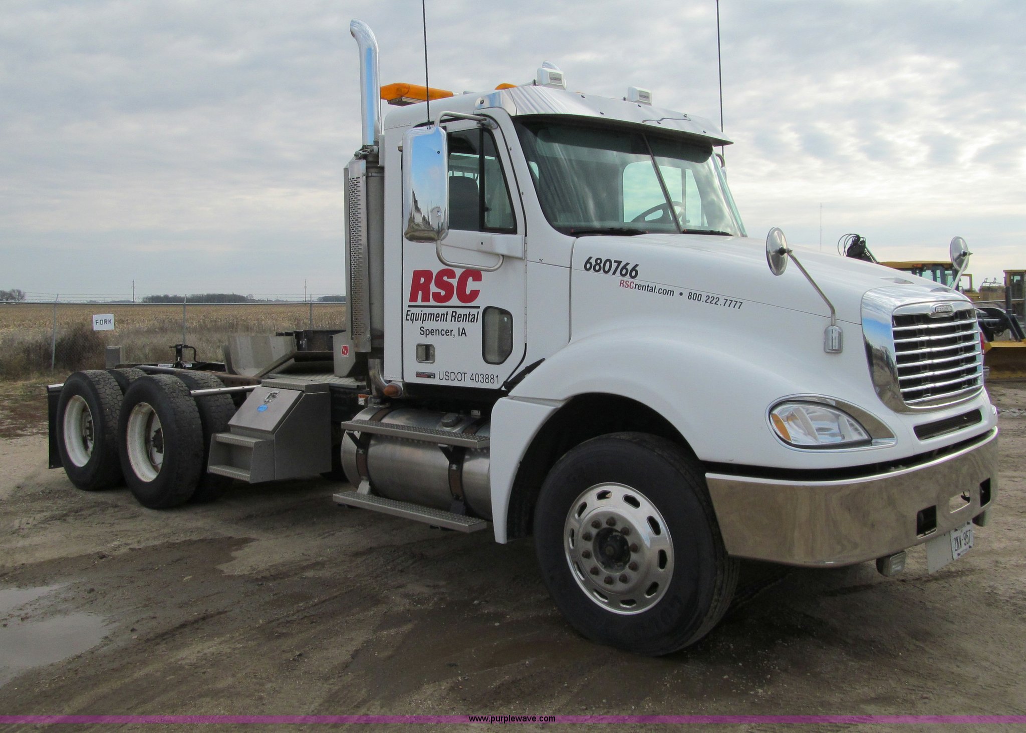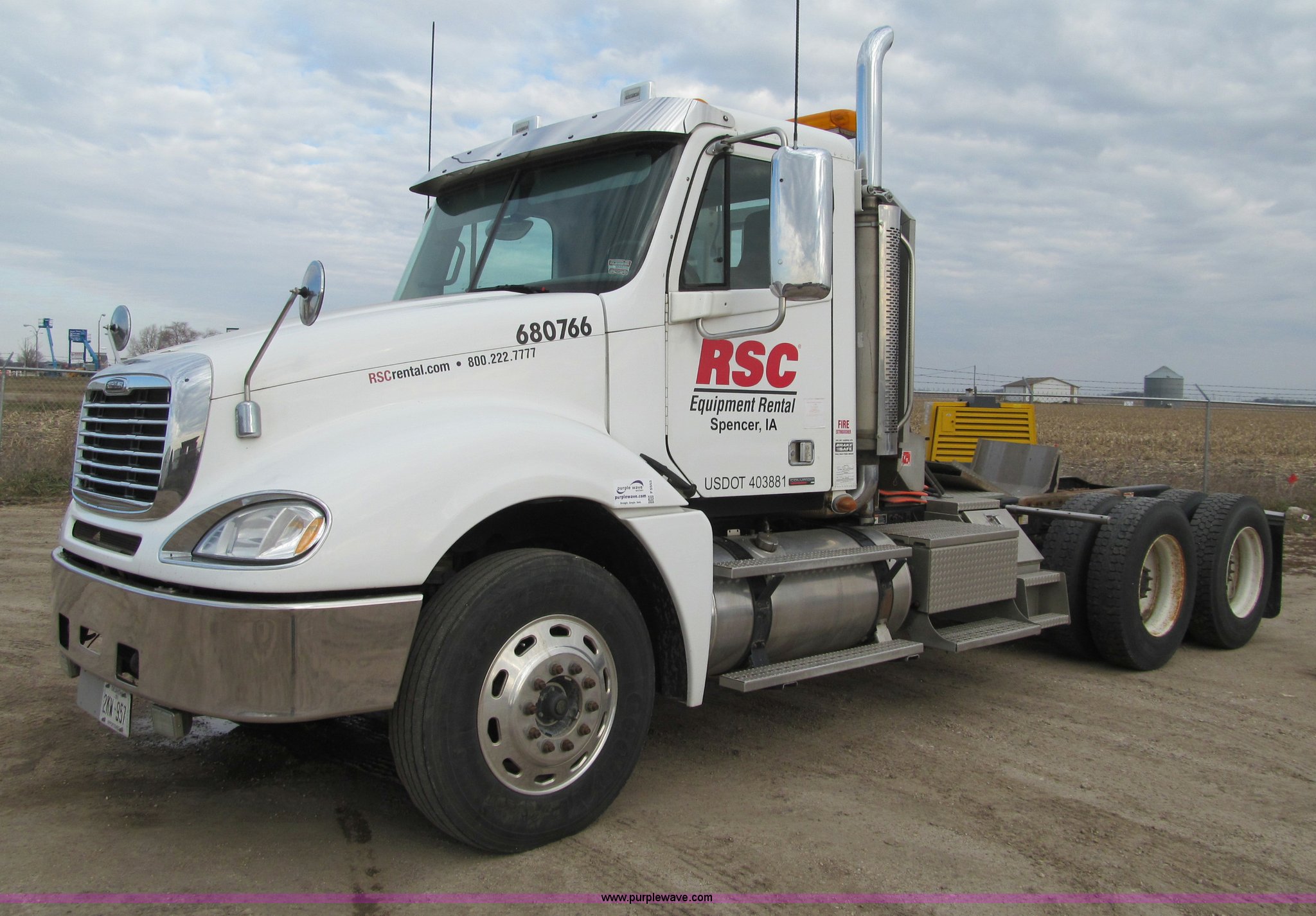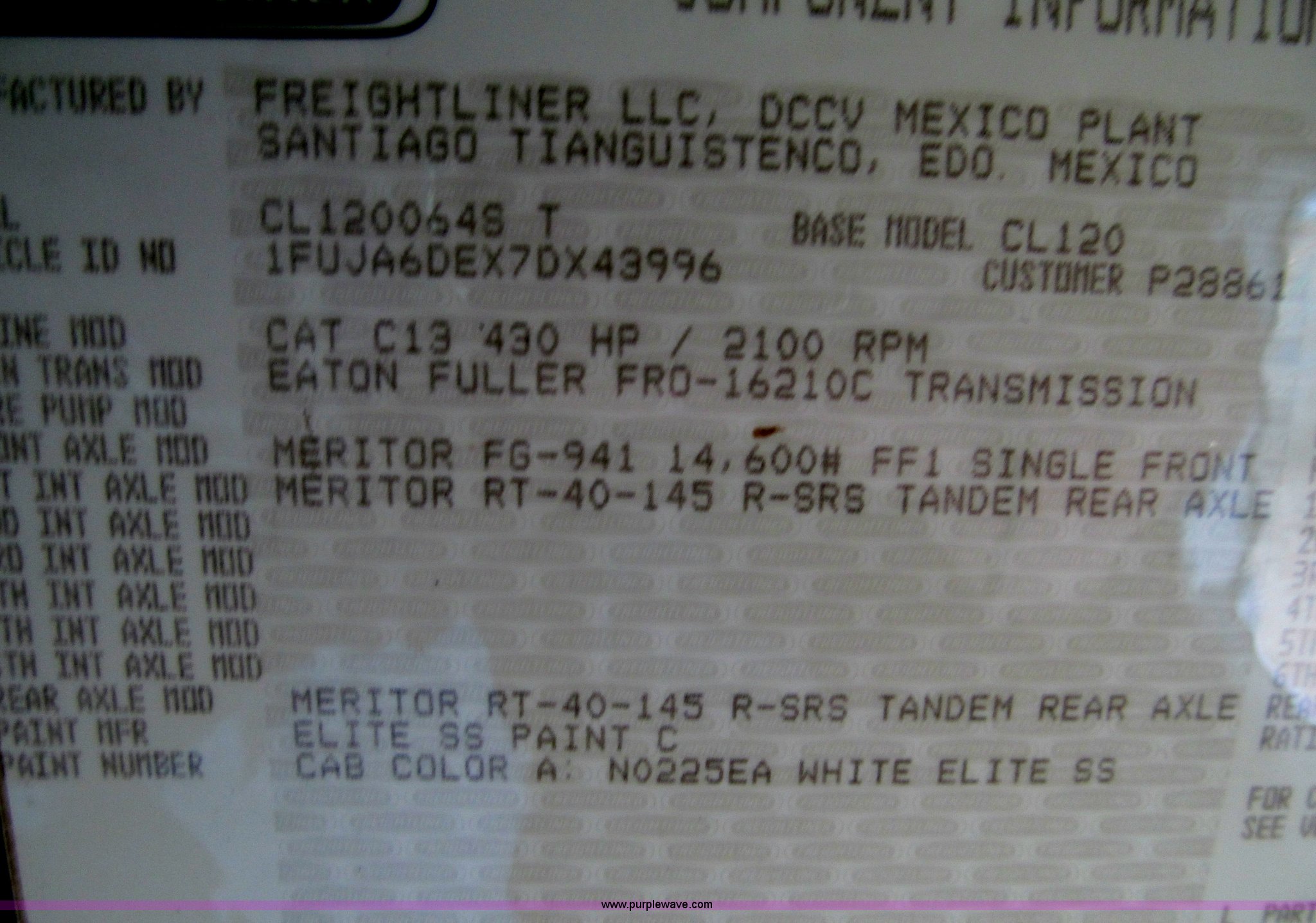 Purple Wave is selling a used Truck Tractor in Iowa. This item is a 2007 Freightliner Columbia CL120 semi truck with the following: 273,443 actual miles, Caterpillar C13 12.5L diesel engine, 430 HP, Eaton Fuller 10 speed manual transmission, FRO-16210C, Twin screw, AC and heat, Tilt, Cruise, AM/FM/CD, Passenger daylight door, Telescoping steering wheel, Air suspension seat, Power windows, Heated mirrors, Visor, Chrome bumper, Block heater, Dual 100 gallon fuel tanks, Dual exhaust stacks, Aluminum deck plate, Headache rack, Window, Storage, Chain hanger, Aluminum half fenders, Fenders included, not installed, Fog lights, Air dry system, (2) side tool/storage boxes, Safety light bar, PTO, Wet kit, Dump valves, Air suspension, Air brakes, Jake brake, Aluminum front wheels, 210" wheelbase, 11R24.5 tires, GVWR 60,600 lbs, FAWR 14,600 lbs, IAWR 23,000 lbs, RAWR 23,000 lbs, Fifth wheel plate removed, EIN 680766RA