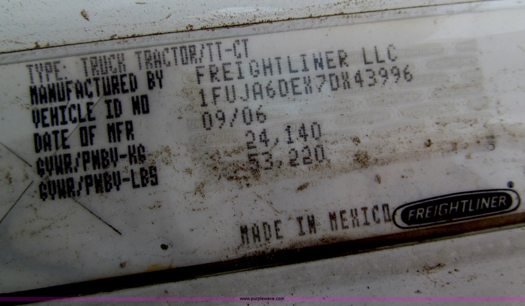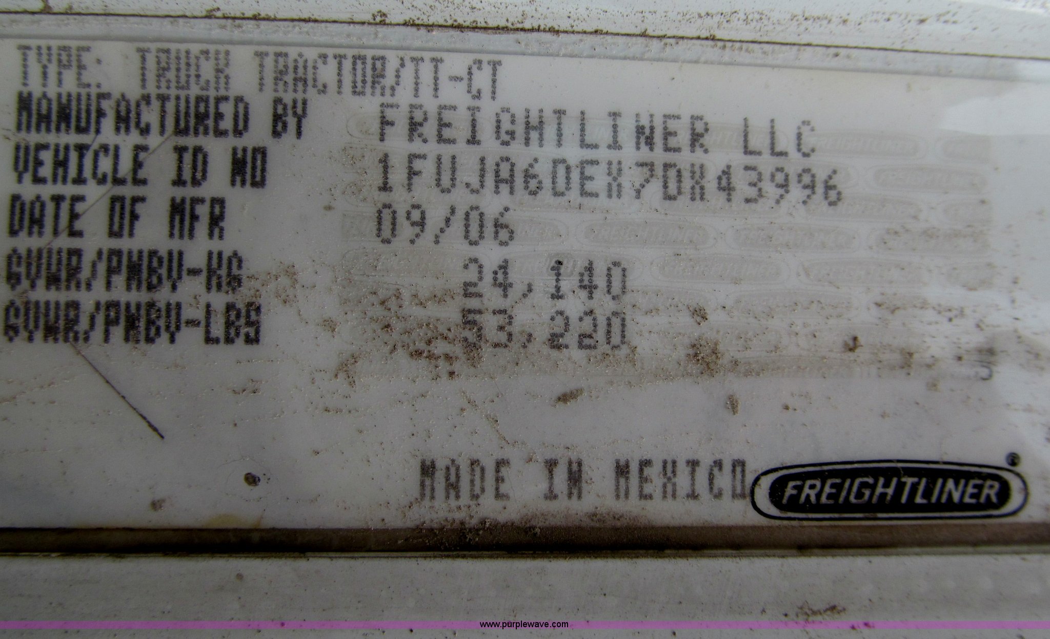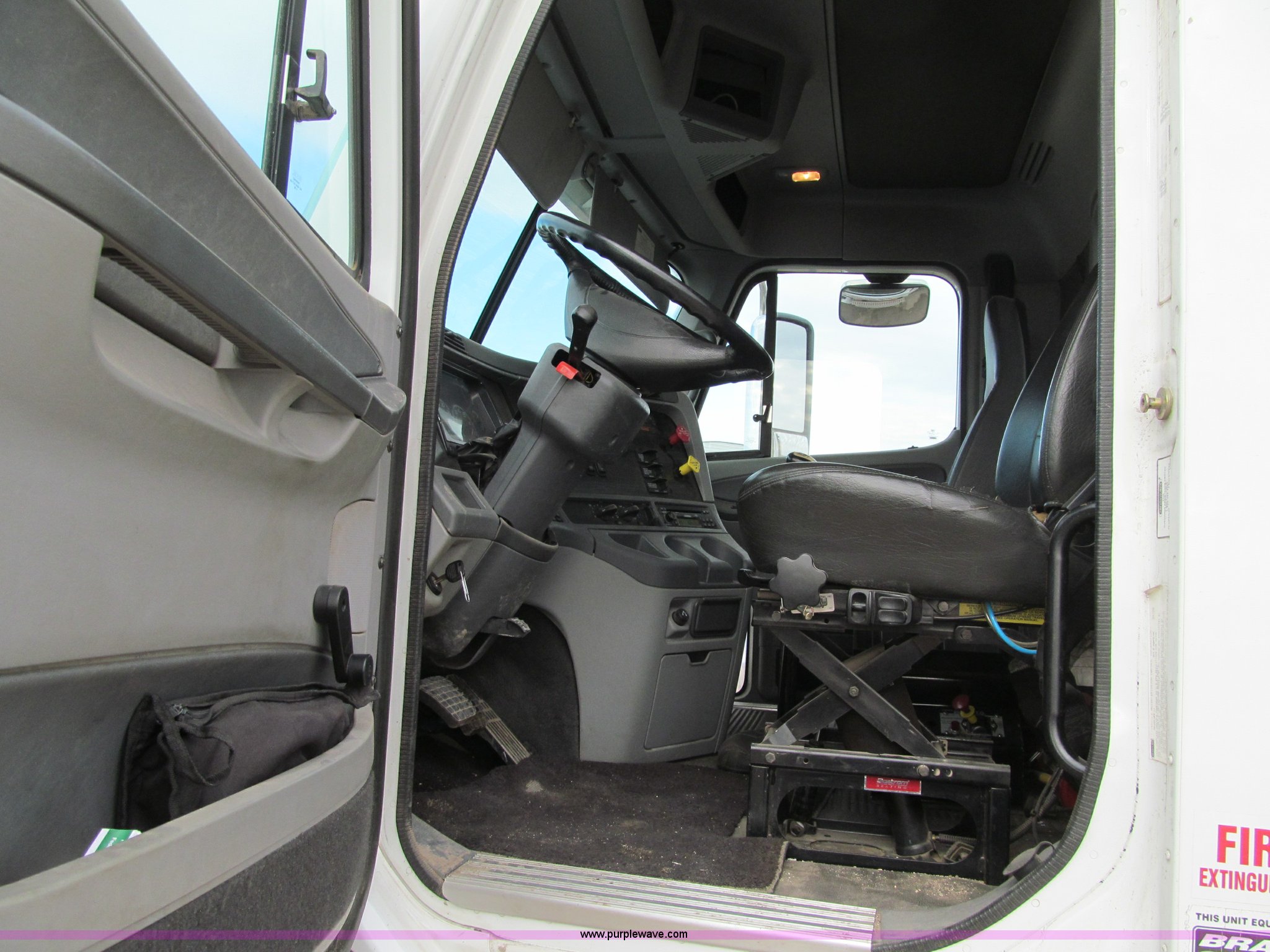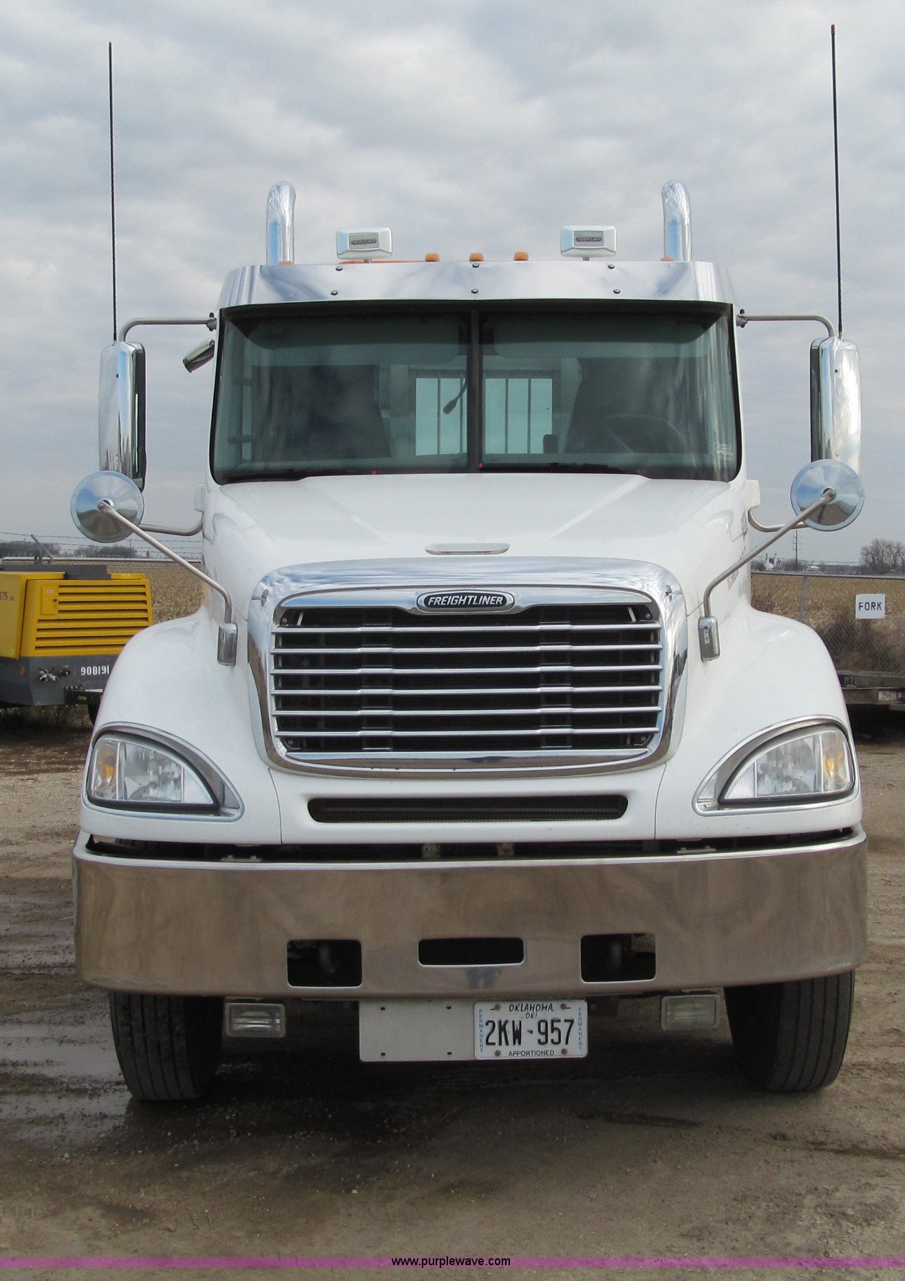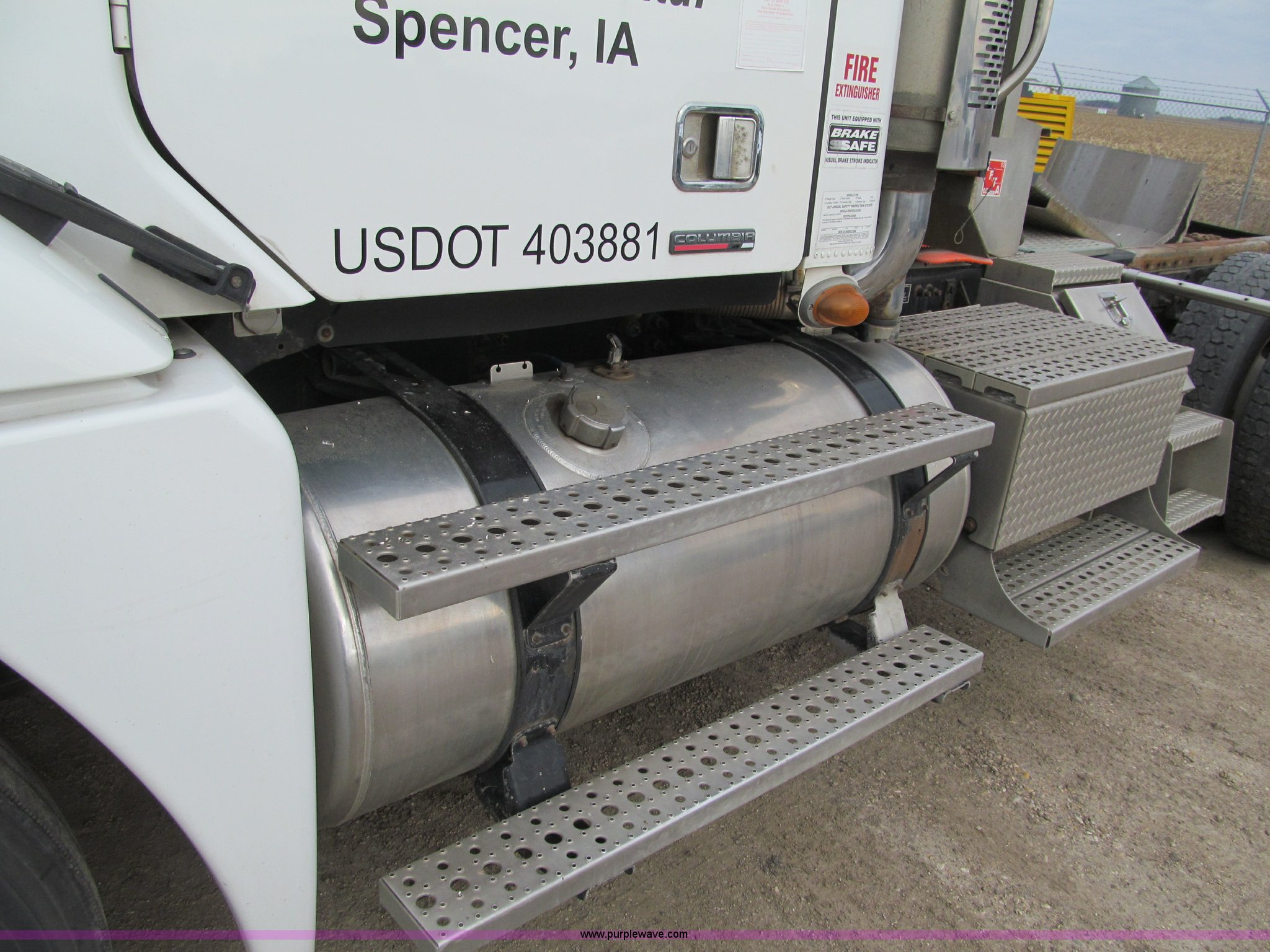 Purple Wave is selling a used Truck Tractor in Iowa. This item is a 2007 Freightliner Columbia CL120 semi truck with the following: 273,443 actual miles, Caterpillar C13 12.5L diesel engine, 430 HP, Eaton Fuller 10 speed manual transmission, FRO-16210C, Twin screw, AC and heat, Tilt, Cruise, AM/FM/CD, Passenger daylight door, Telescoping steering wheel, Air suspension seat, Power windows, Heated mirrors, Visor, Chrome bumper, Block heater, Dual 100 gallon fuel tanks, Dual exhaust stacks, Aluminum deck plate, Headache rack, Window, Storage, Chain hanger, Aluminum half fenders, Fenders included, not installed, Fog lights, Air dry system, (2) side tool/storage boxes, Safety light bar, PTO, Wet kit, Dump valves, Air suspension, Air brakes, Jake brake, Aluminum front wheels, 210" wheelbase, 11R24.5 tires, GVWR 60,600 lbs, FAWR 14,600 lbs, IAWR 23,000 lbs, RAWR 23,000 lbs, Fifth wheel plate removed, EIN 680766RA