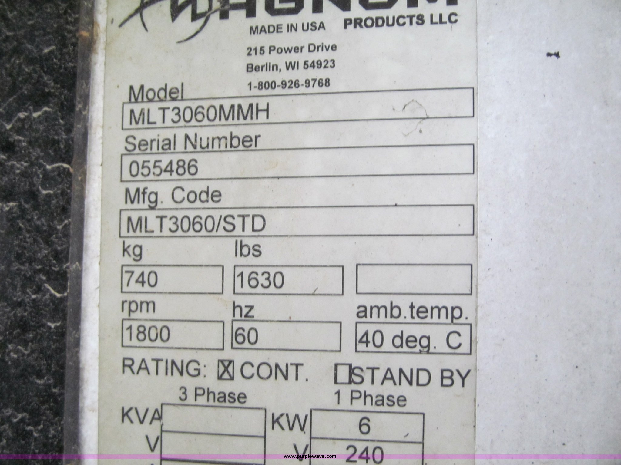 Purple Wave is selling a used Generator Set in Wisconsin. This item is a Magnum MLT 3060 light tower with the following: 8,309 hours on meter, Mitsubishi L3E 13 HP diesel engine, (4) lights, Manual pole raise, Duplex 120V outlet, 240V outlet, (3) leveling jacks, Tongue jack, 2" ball, Four pin trailer wiring, STD5/80D13 tires, Serial 0554486, EIN 804952