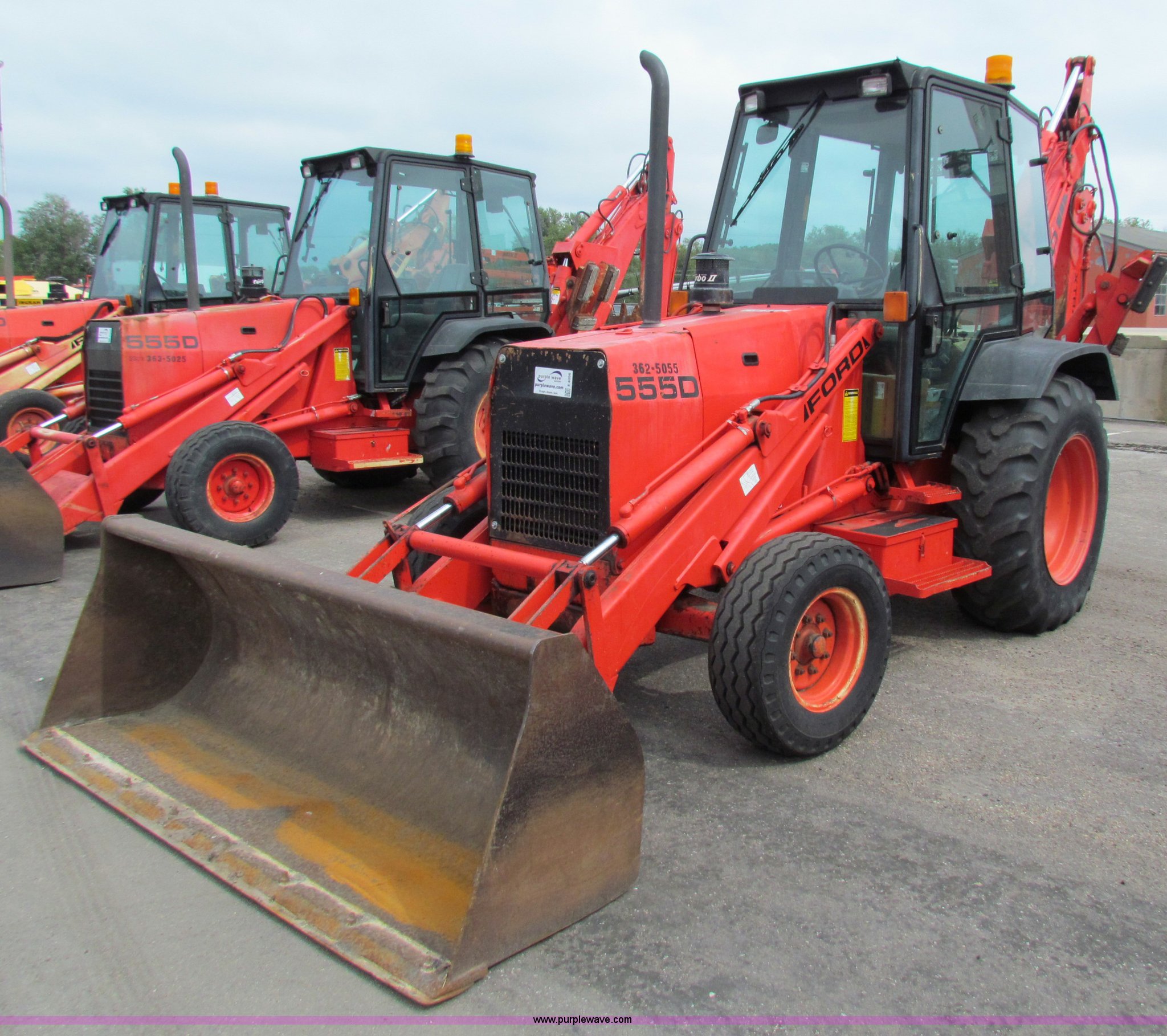 Purple Wave is selling a used Tractor Loader Backhoe in Kansas. This item is a 1996 Ford 555D backhoe with the following: 4,100 hours on meter, Ford diesel engine, Four speed shuttle shift transmission, Enclosed cab, Suspension seat, Front and rear windshield wipers, Front and rear work lights, Single stick loader control, Two stick backhoe control, 88" loader bucket, Bolt-on cutting edge, 23" four tooth backhoe bucket, Extendable dipper stick, Plumbed for hydraulic attachment, 21" stabilizer pads, 11L-16 front tires, 16.9-28 rear tires, Painted faded, Hydraulic leak, Serial A437050, KDOT ID E362-5055