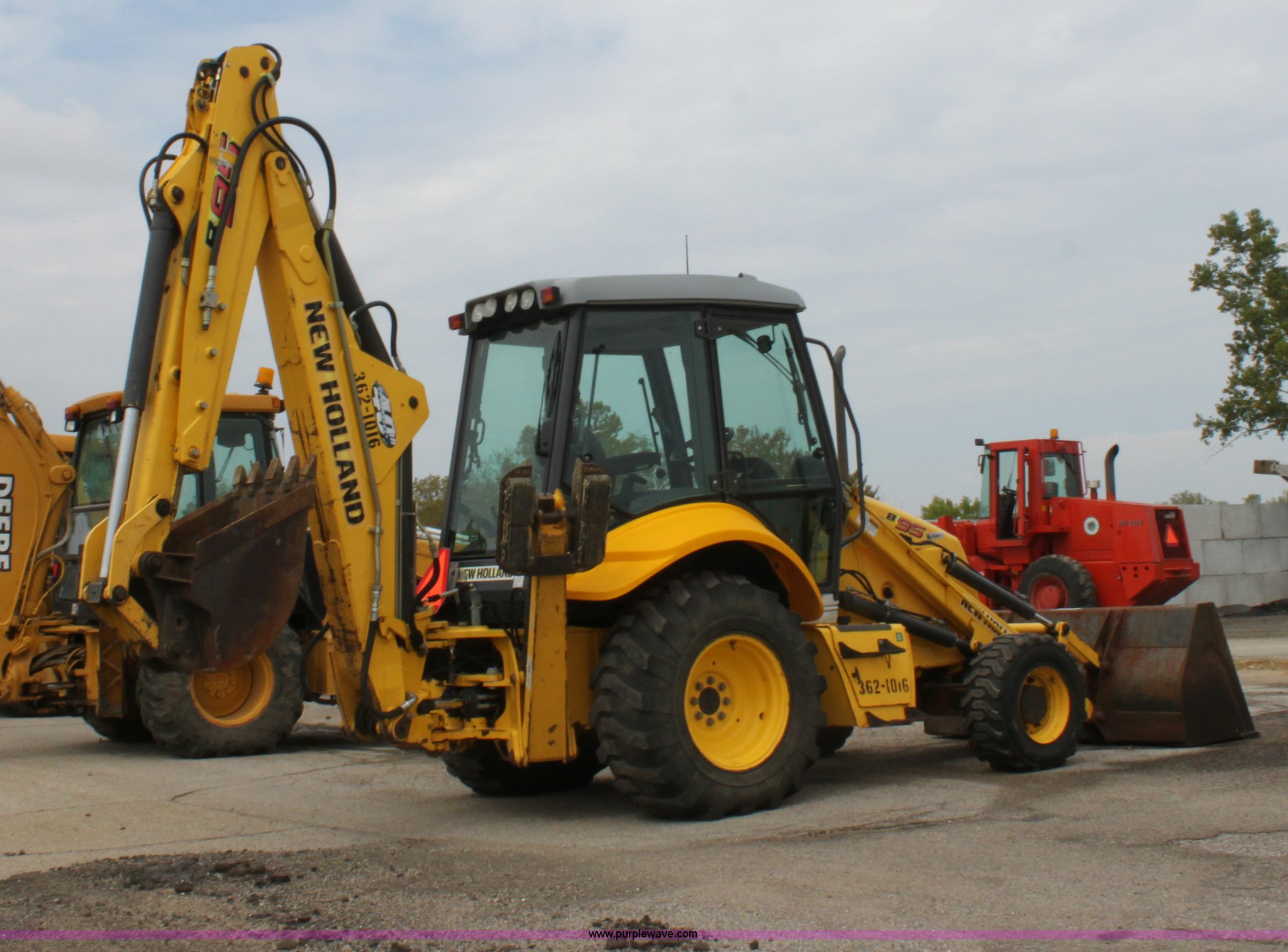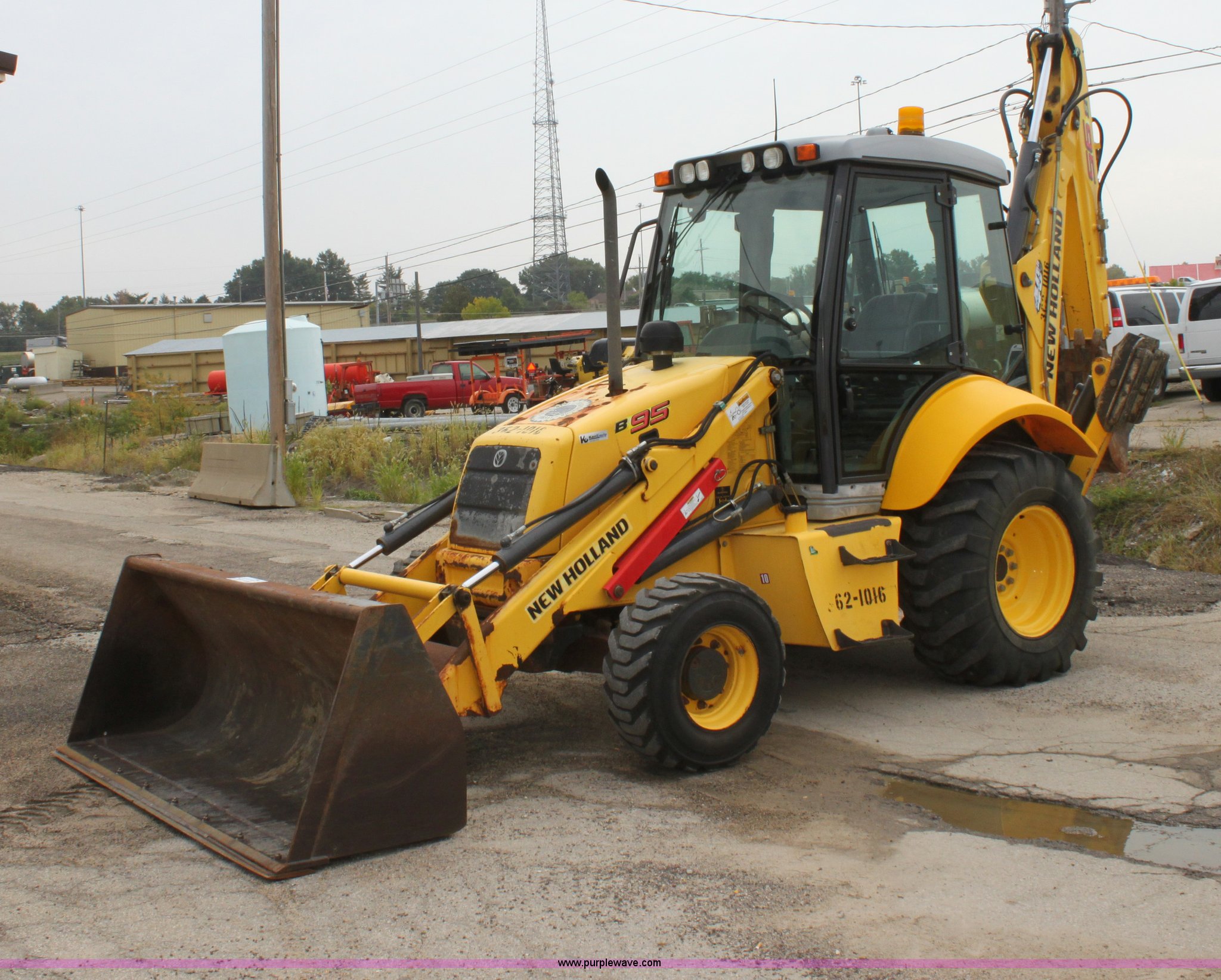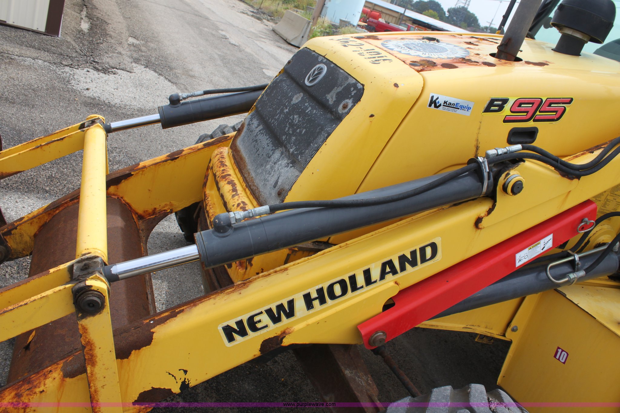 Purple Wave is selling a used Tractor Loader Backhoe in Kansas. This item is a 2006 New Holland B95 backhoe with the following: 986 hours on meter, Four cylinder diesel engine, 95 HP, Four speed shuttle shift transmission, Locking differential, AC and heat, Suspension seat, AM/FM/cassette, Wobble stick loader control, Two stick backhoe control, 3/4 cu. yd. loader bucket, 24" backhoe bucket, (5) teeth, 20" stabilizer pads, 12x16.5 front tires, 19.5L-24 rear tires, Severe rust on hood and broom attachment, Serial 031060893, KDOT ID E362-1016