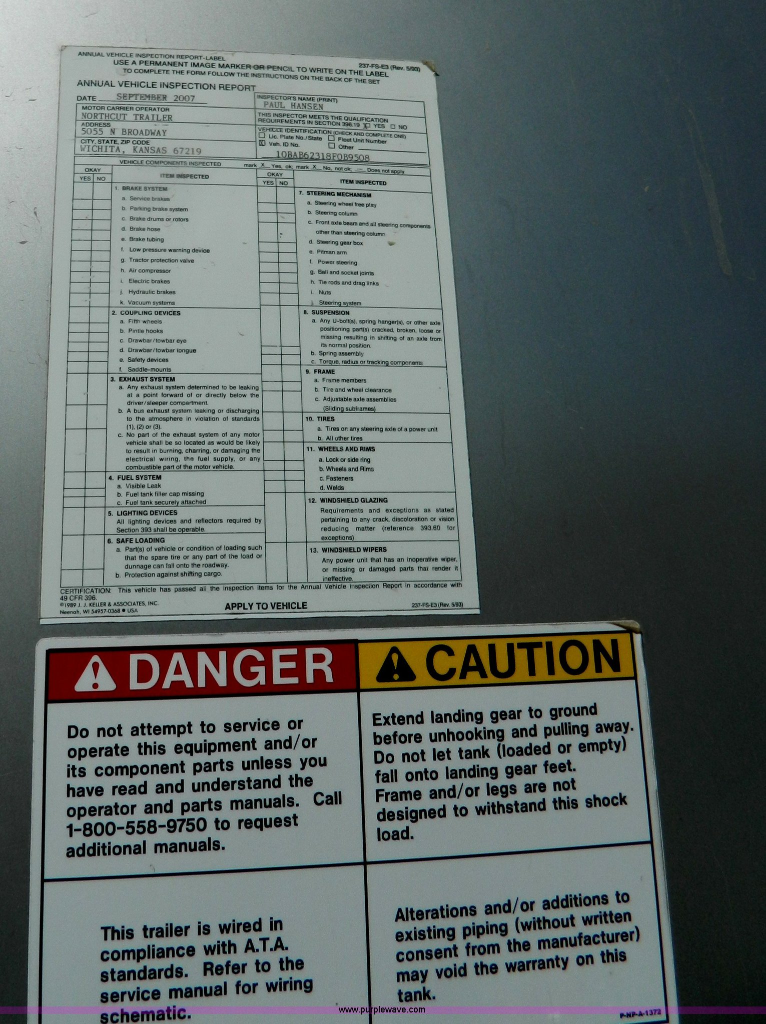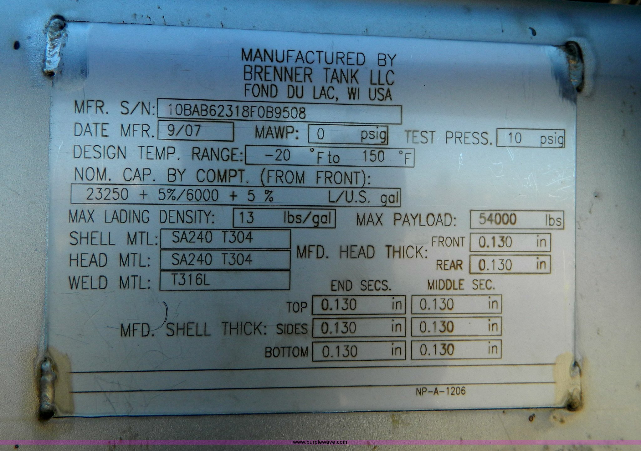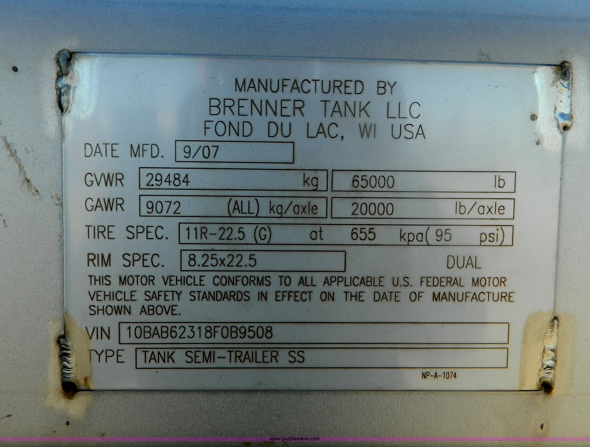 Purple Wave is selling a used Tank Trailer in Kansas. This item is a 2008 Brenner 2NC600010SS water tanker trailer with the following: 1,217 miles on hubometer, Stainless steel tank, (2) 3" dump outlets, 6" dump outlet, Spring suspension, 11R22.5 tires, KDOT ID E779-3017