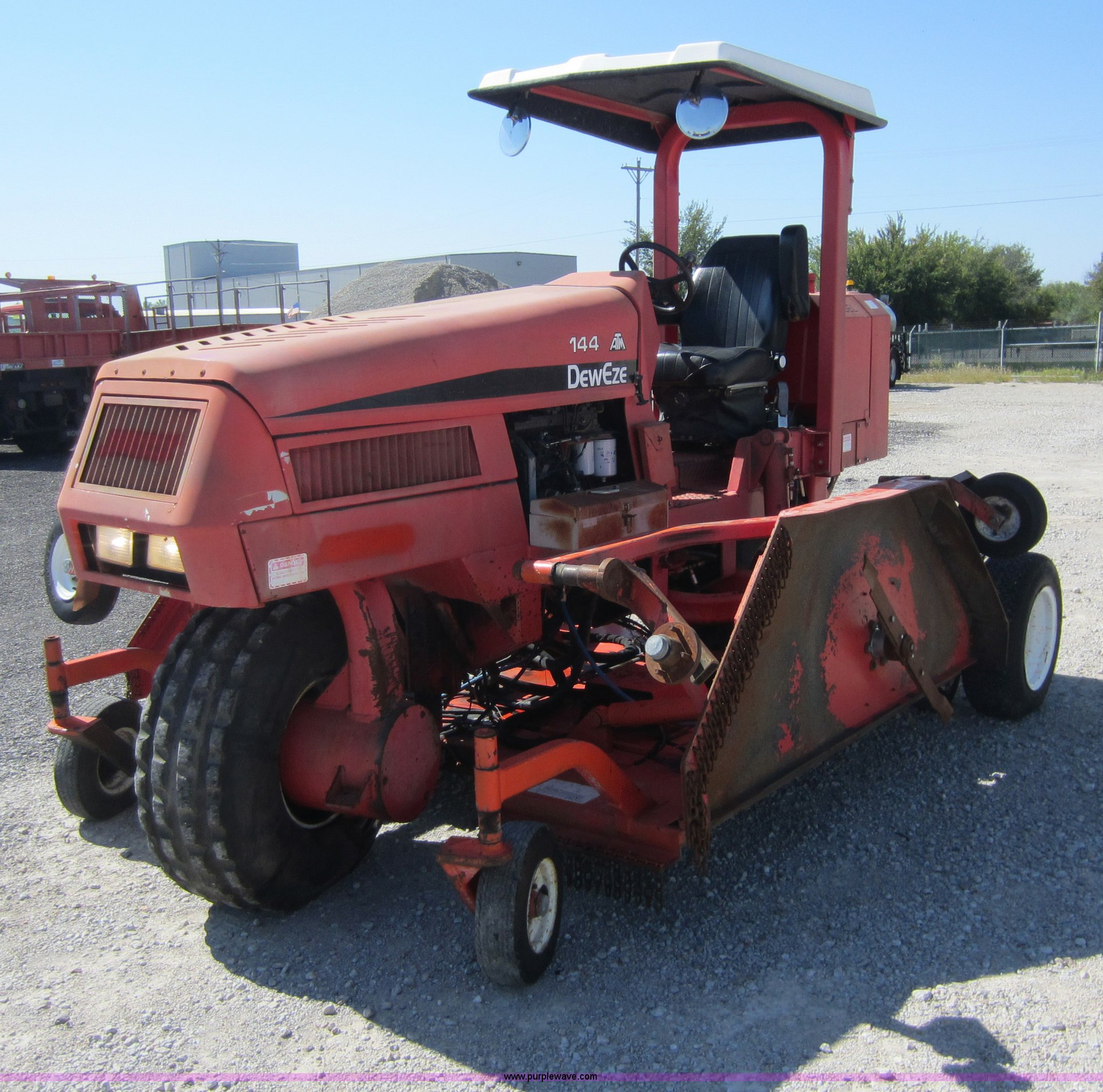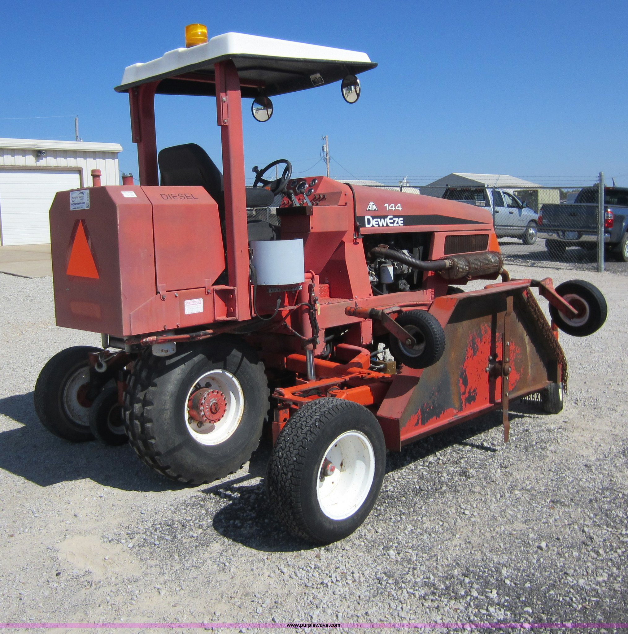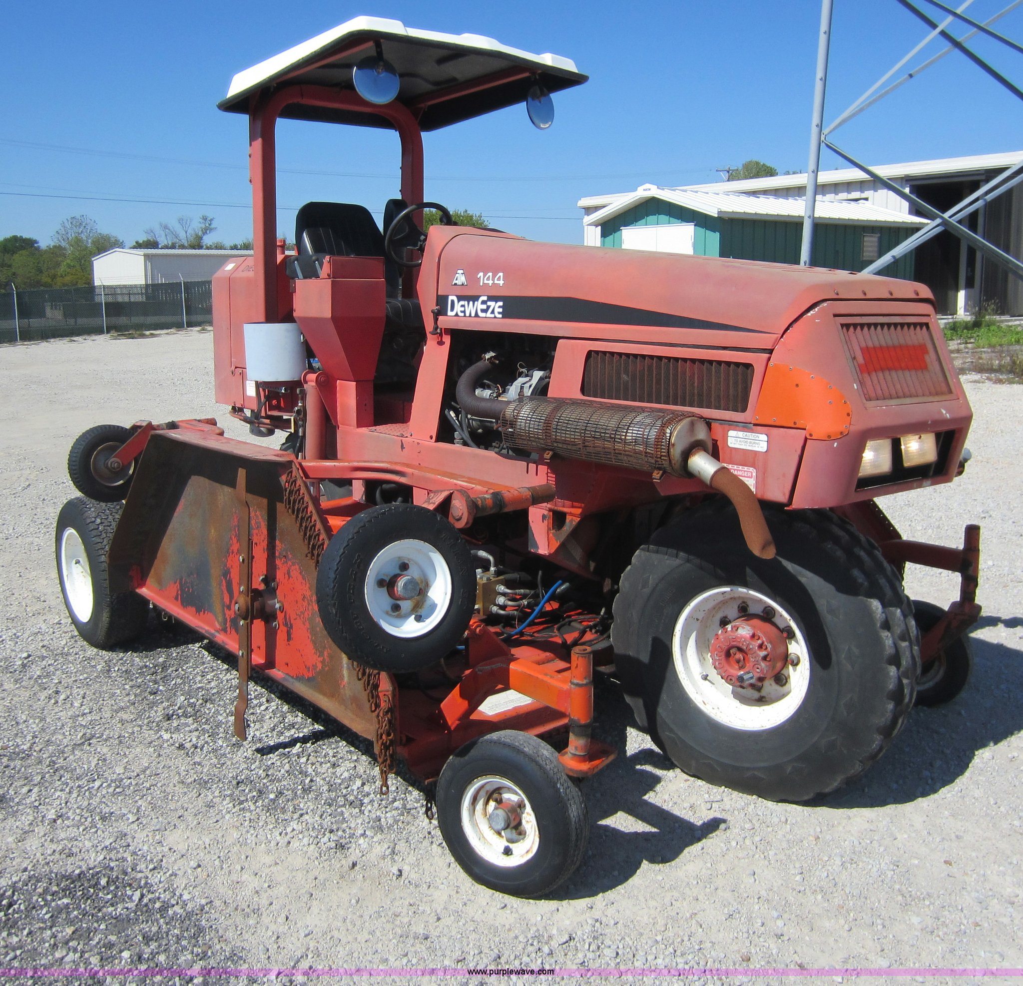 Purple Wave is selling a used Commercial Turf Mower in Kansas. This item is a 2001 DewEze ATM144 slope mower with the following: 529 hours on meter, Cummins four cylinder diesel engine, Canopy, In cab tilt control, Hydraulic deck raise, Hydraulic folding deck, Front work lights, 12' cutting deck, Hydraulic driven blades, Hydraulic leaks, Serial 00A05, KDOT ID E402-1041