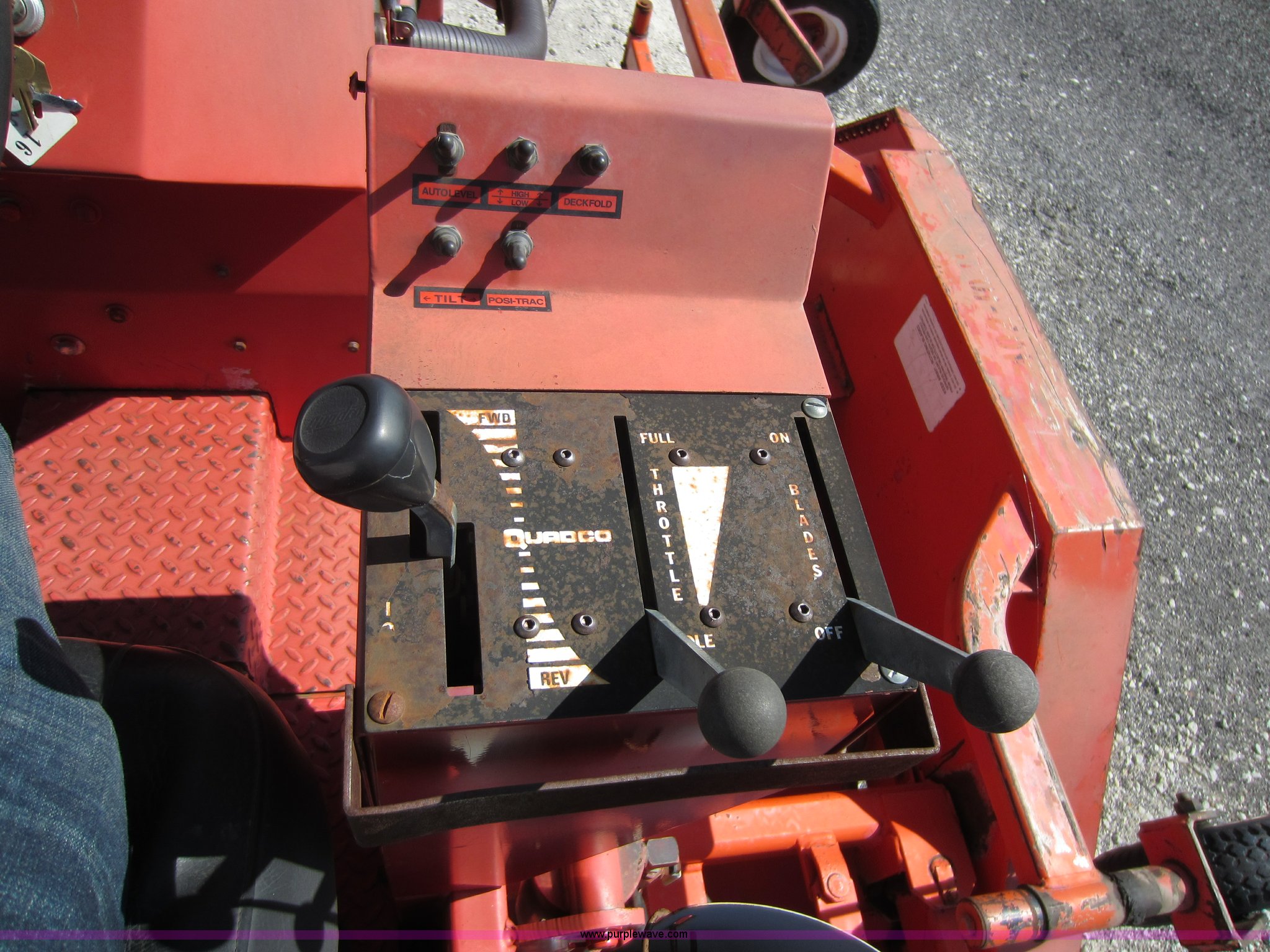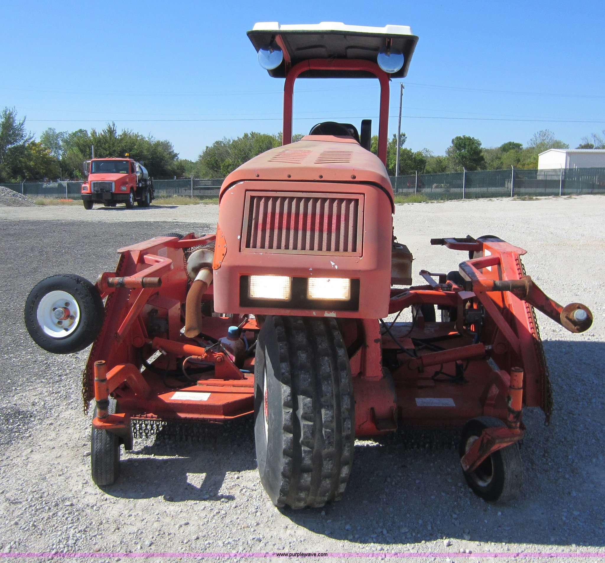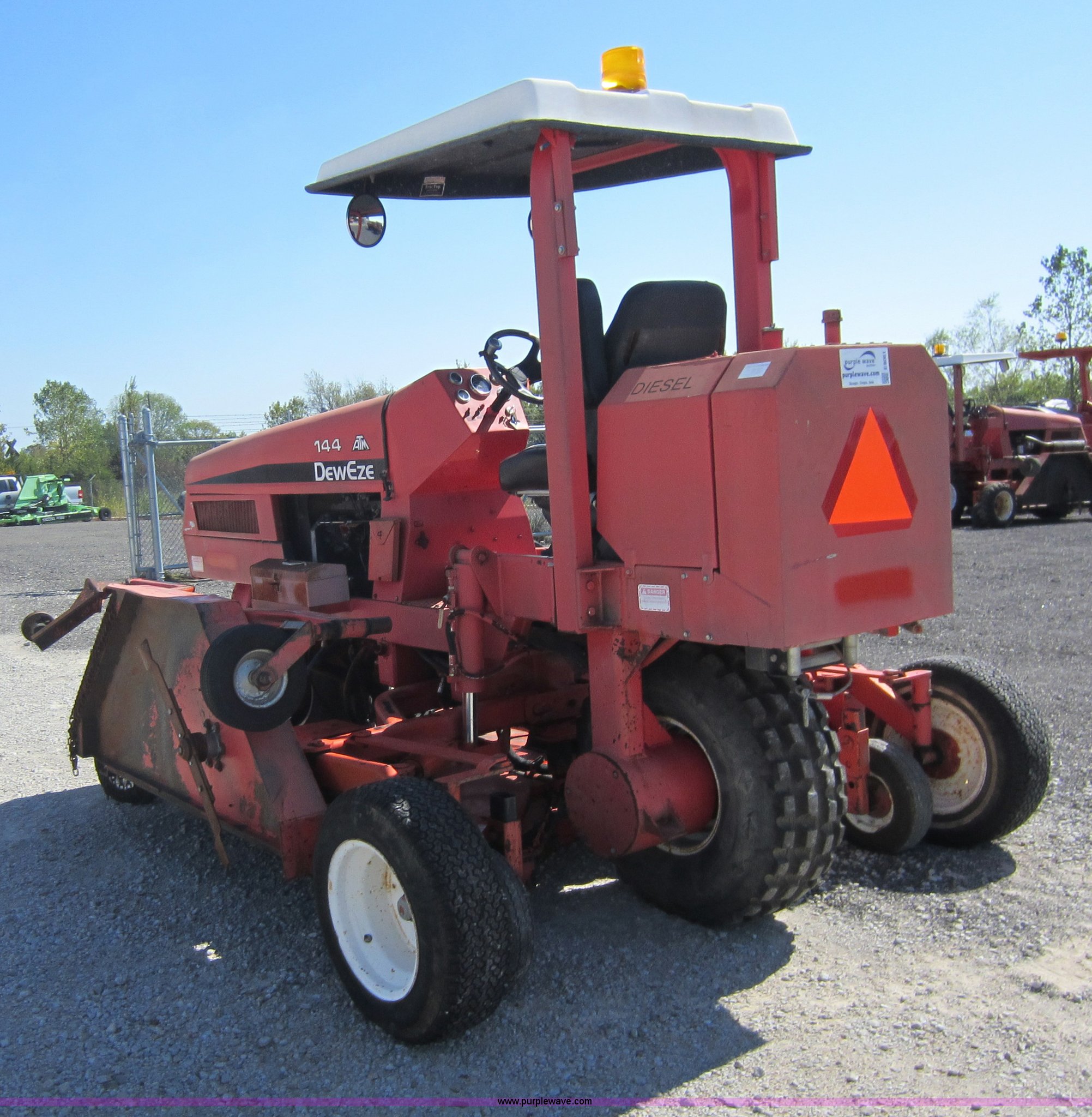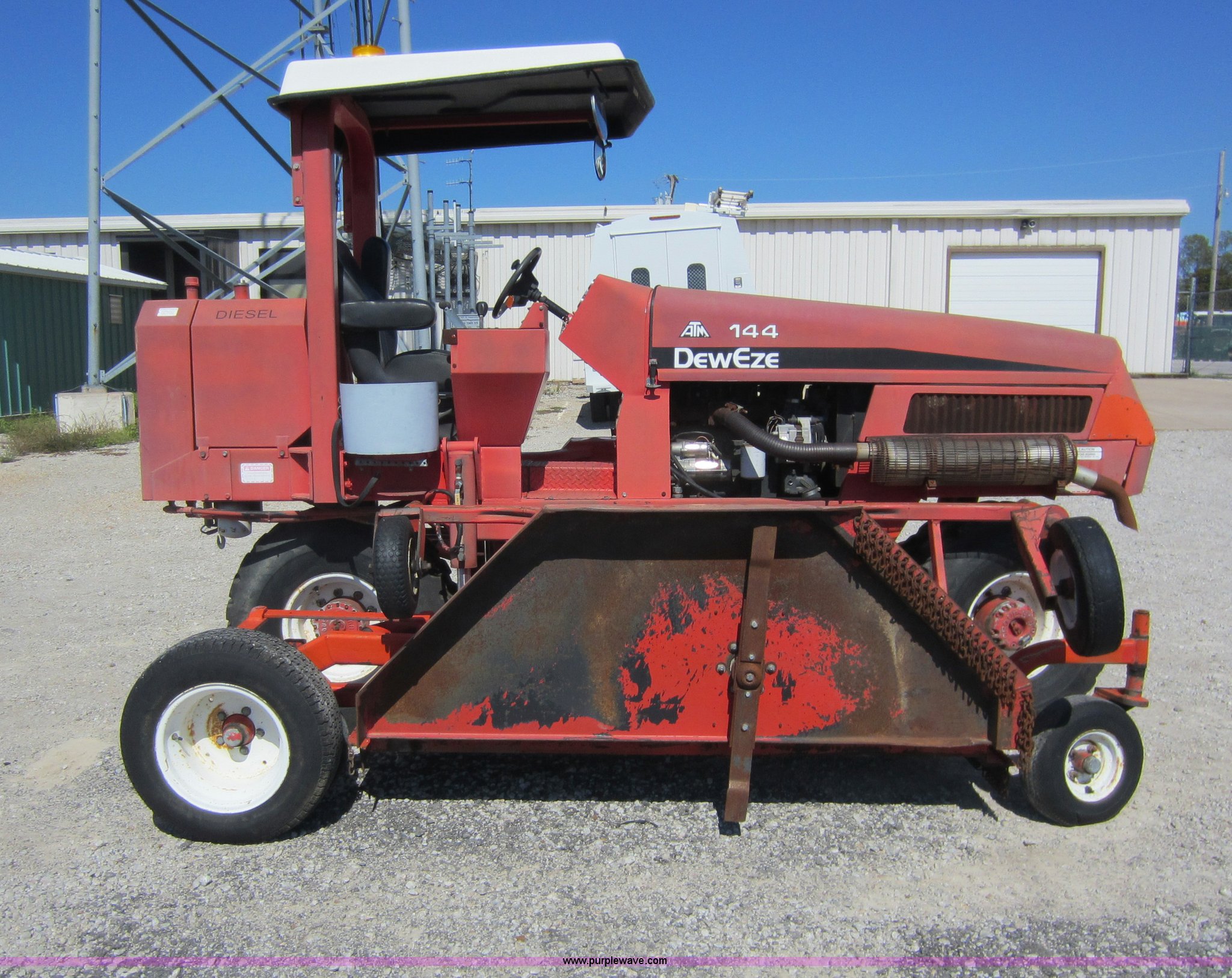 Purple Wave is selling a used Commercial Turf Mower in Kansas. This item is a 2001 DewEze ATM144 slope mower with the following: 529 hours on meter, Cummins four cylinder diesel engine, Canopy, In cab tilt control, Hydraulic deck raise, Hydraulic folding deck, Front work lights, 12' cutting deck, Hydraulic driven blades, Hydraulic leaks, Serial 00A05, KDOT ID E402-1041