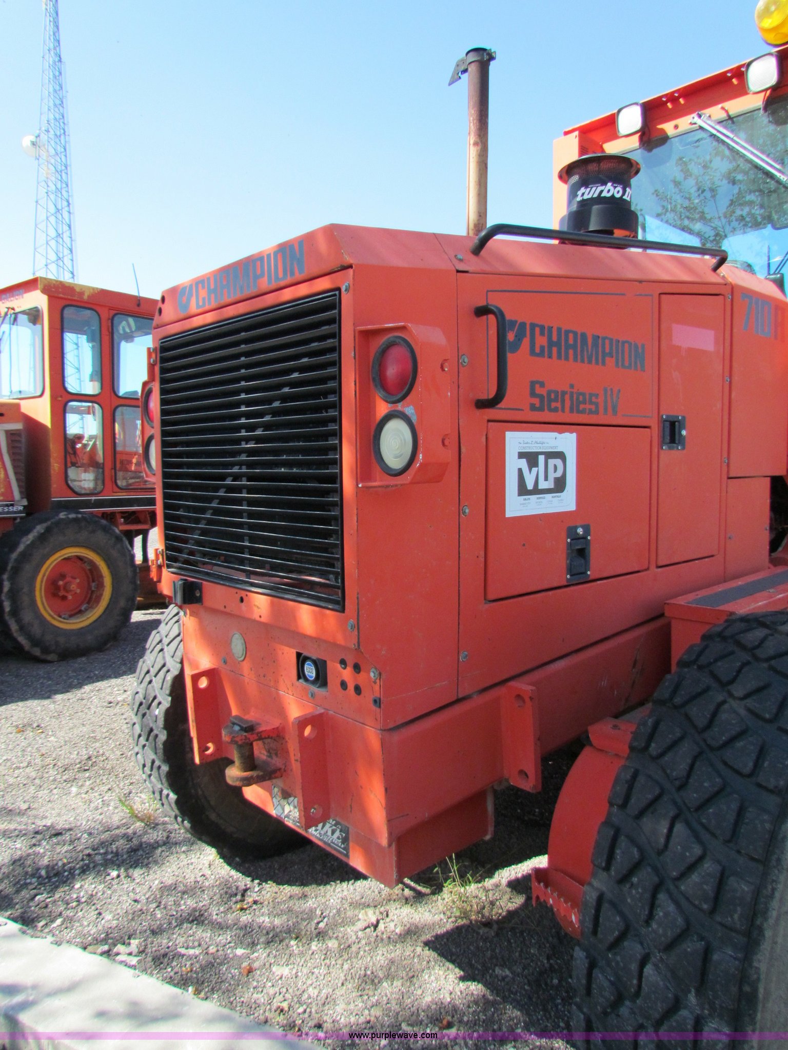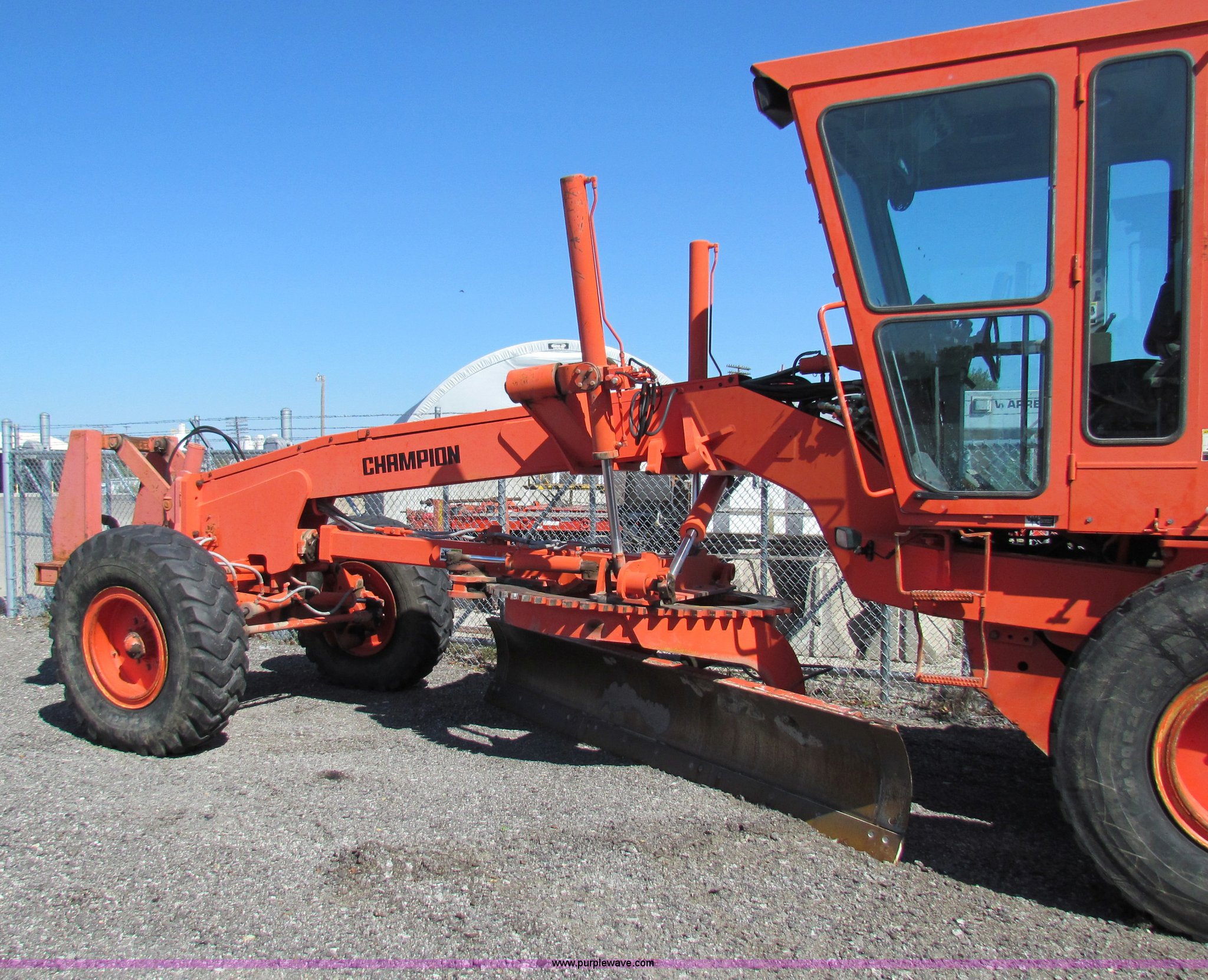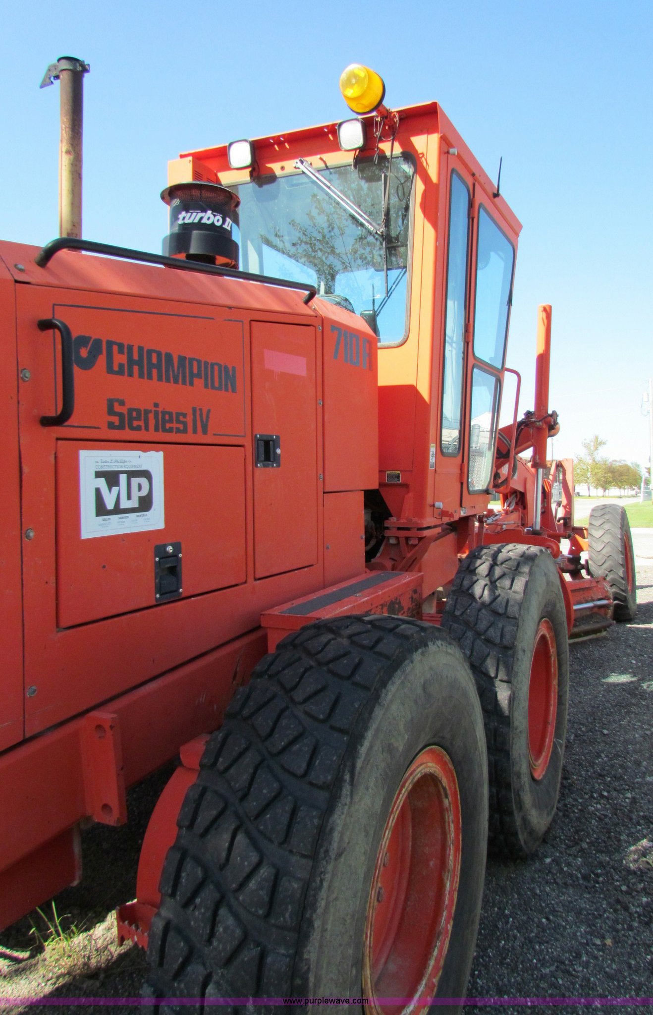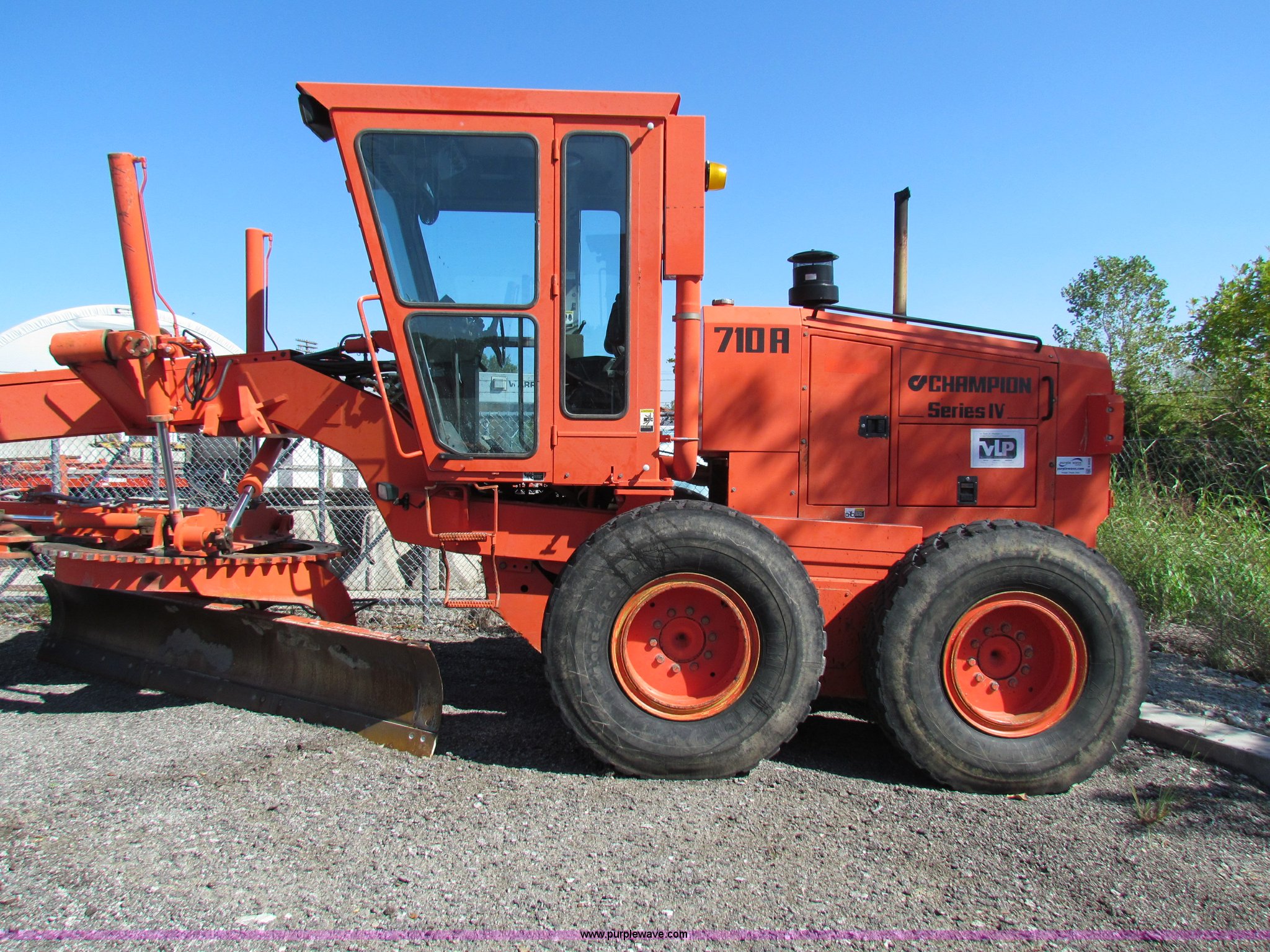 Purple Wave is selling a used Motor Grader in Kansas. This item is a 1995 Champion 710A motor grader with the following: 3,128 hours on meter, Cummins 5.9L diesel engine, Eight speed transmission, Enclosed cab, AC and heat, Suspension seat, Front and rear wipers, Front and rear work lights, (10) valve tilt stick, 12' blade, Front mount scarifier, (2) teeth, 31,050 lbs. base operating weight, Metal in final drives, Dead batteries, Serial 25820, KDOT ID E310-4046