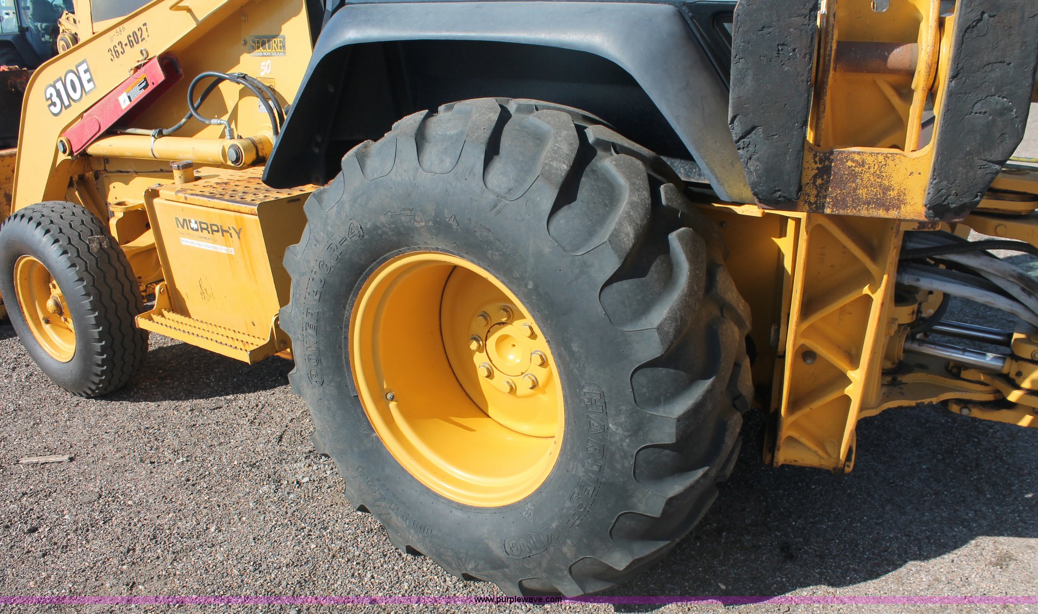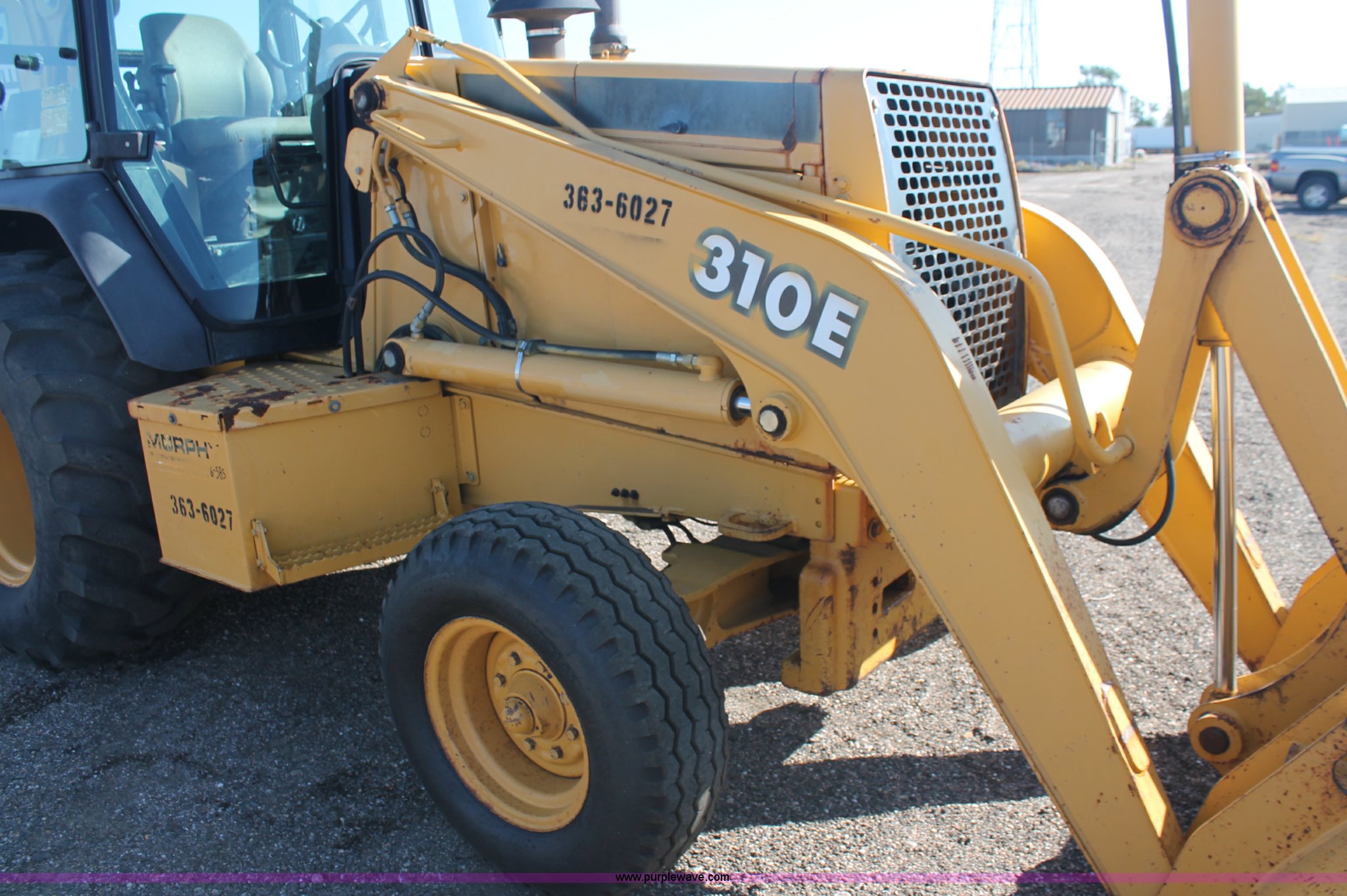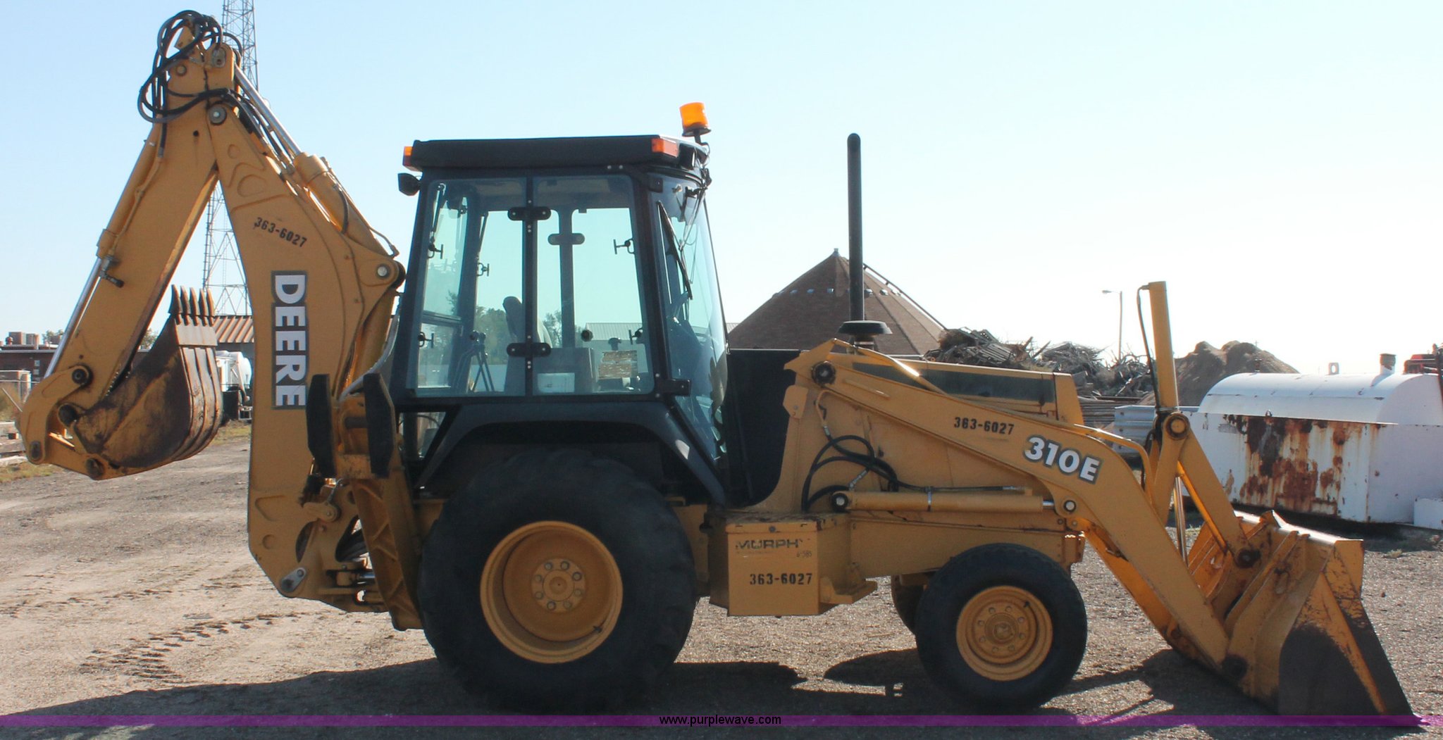 Purple Wave is selling a used Tractor Loader Backhoe in Kansas. This item is a 1997 John Deere 310E backhoe with the following: 2879 hours on meter, John Deere four cylinder diesel engine, Four speed power shift transmission, AC and heat, AC is nonfunctional, AM/FM, Suspension seat, Front and rear wipers, Front and rear work lights, Joystick loader control, 7' loader bucket, Two stick backhoe control, 24" five tooth backhoe bucket, 11L-16SL front tires, 19.5L-24 rear tires", Serial T0310EX836046, KDOT ID 363-6027