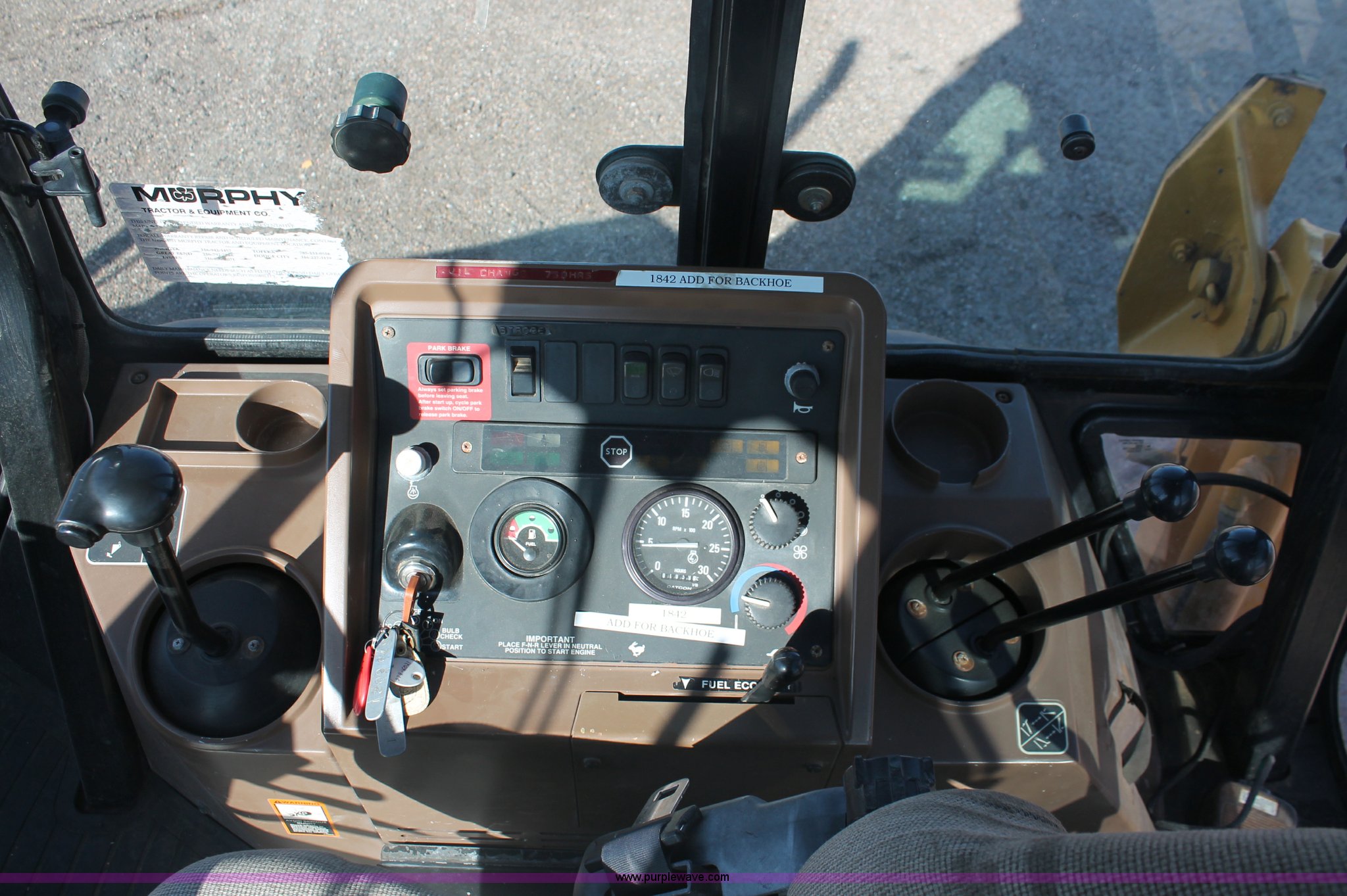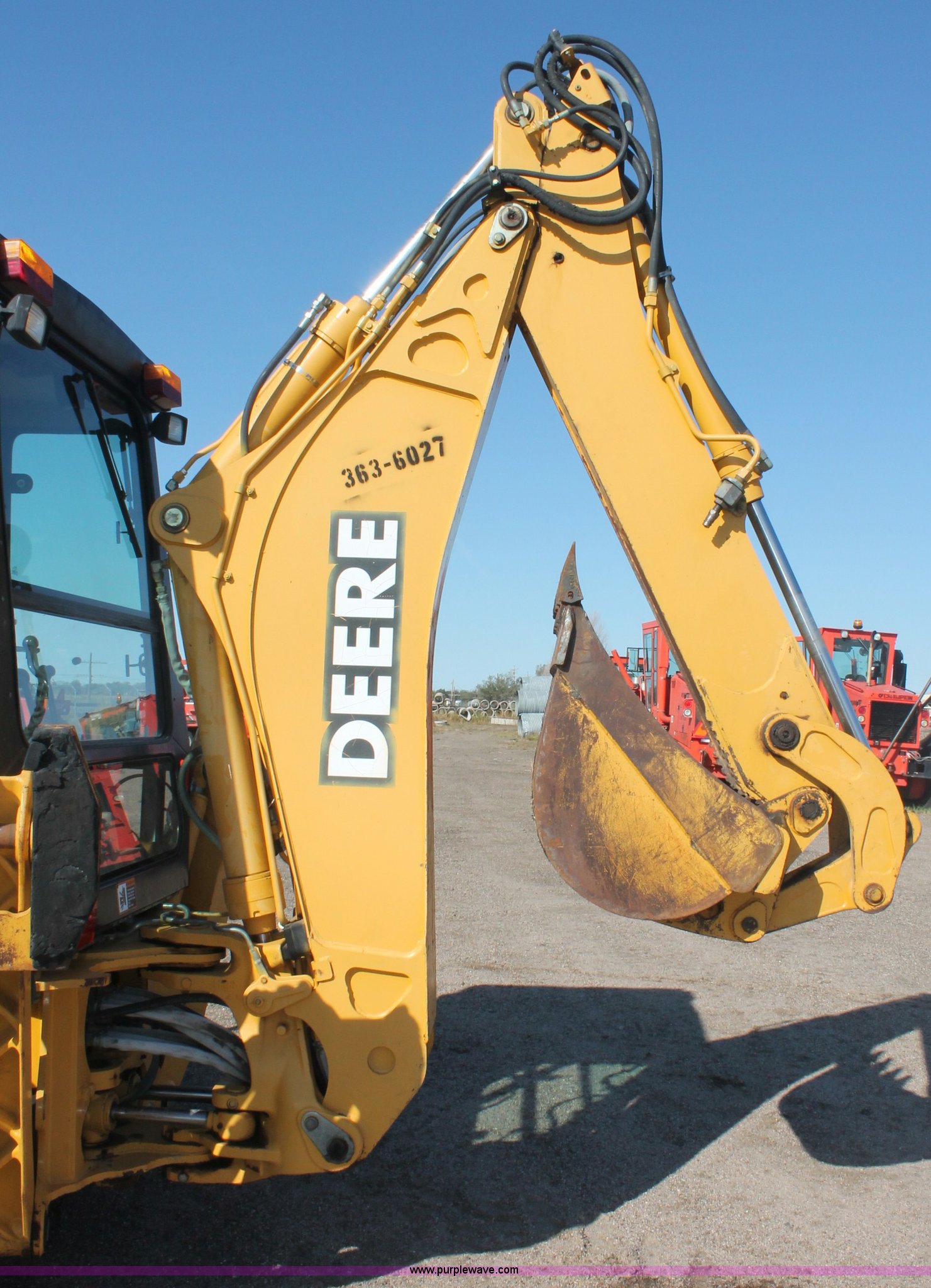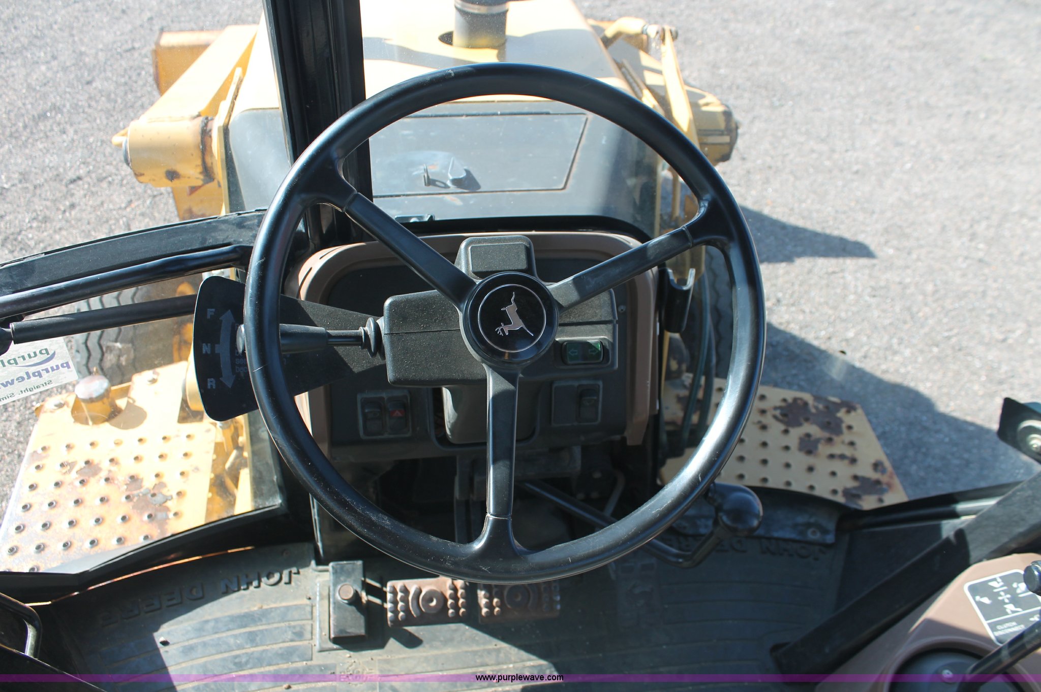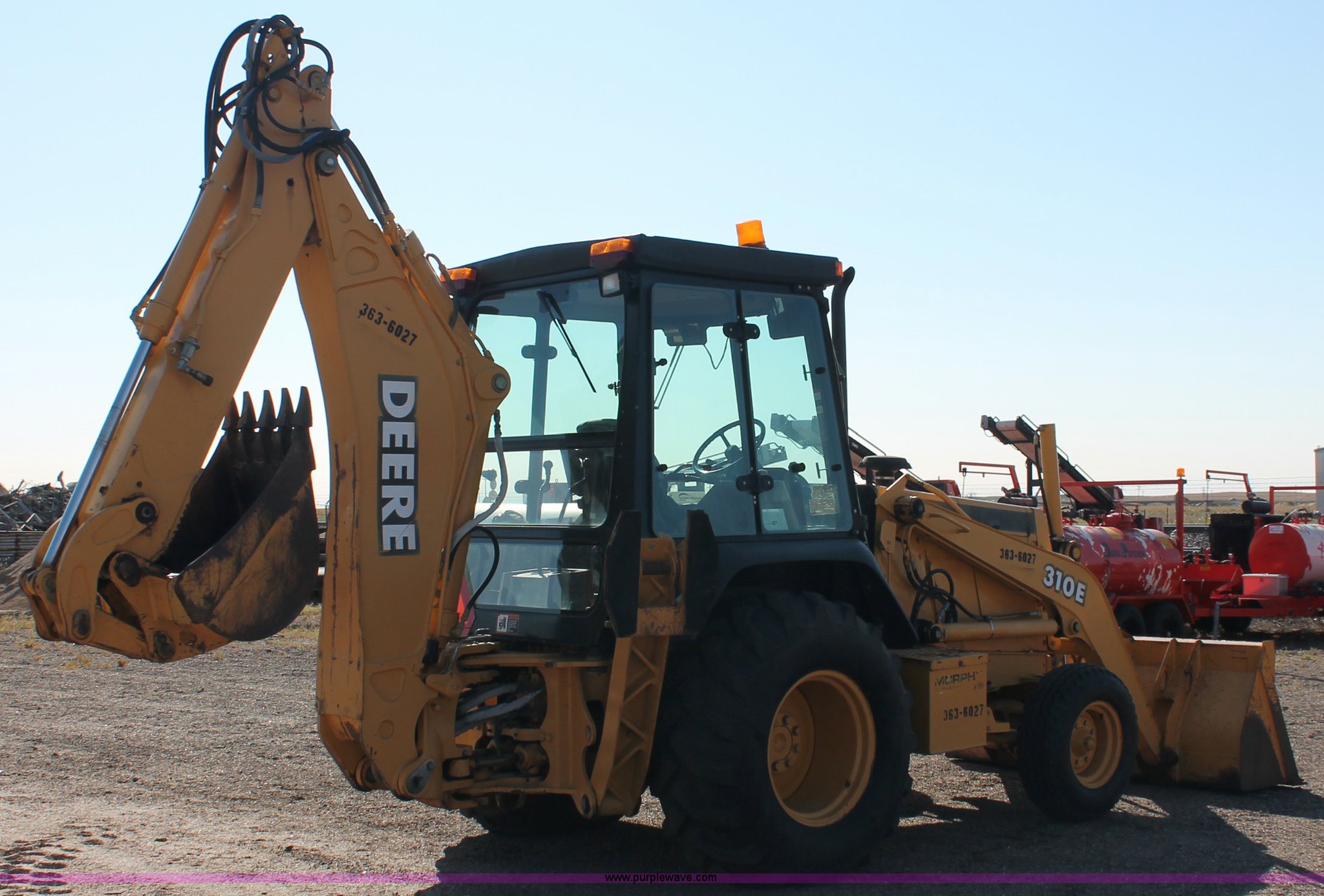 Purple Wave is selling a used Tractor Loader Backhoe in Kansas. This item is a 1997 John Deere 310E backhoe with the following: 2879 hours on meter, John Deere four cylinder diesel engine, Four speed power shift transmission, AC and heat, AC is nonfunctional, AM/FM, Suspension seat, Front and rear wipers, Front and rear work lights, Joystick loader control, 7' loader bucket, Two stick backhoe control, 24" five tooth backhoe bucket, 11L-16SL front tires, 19.5L-24 rear tires", Serial T0310EX836046, KDOT ID 363-6027
