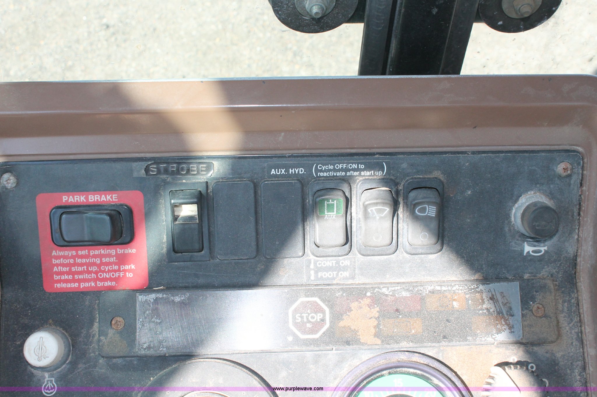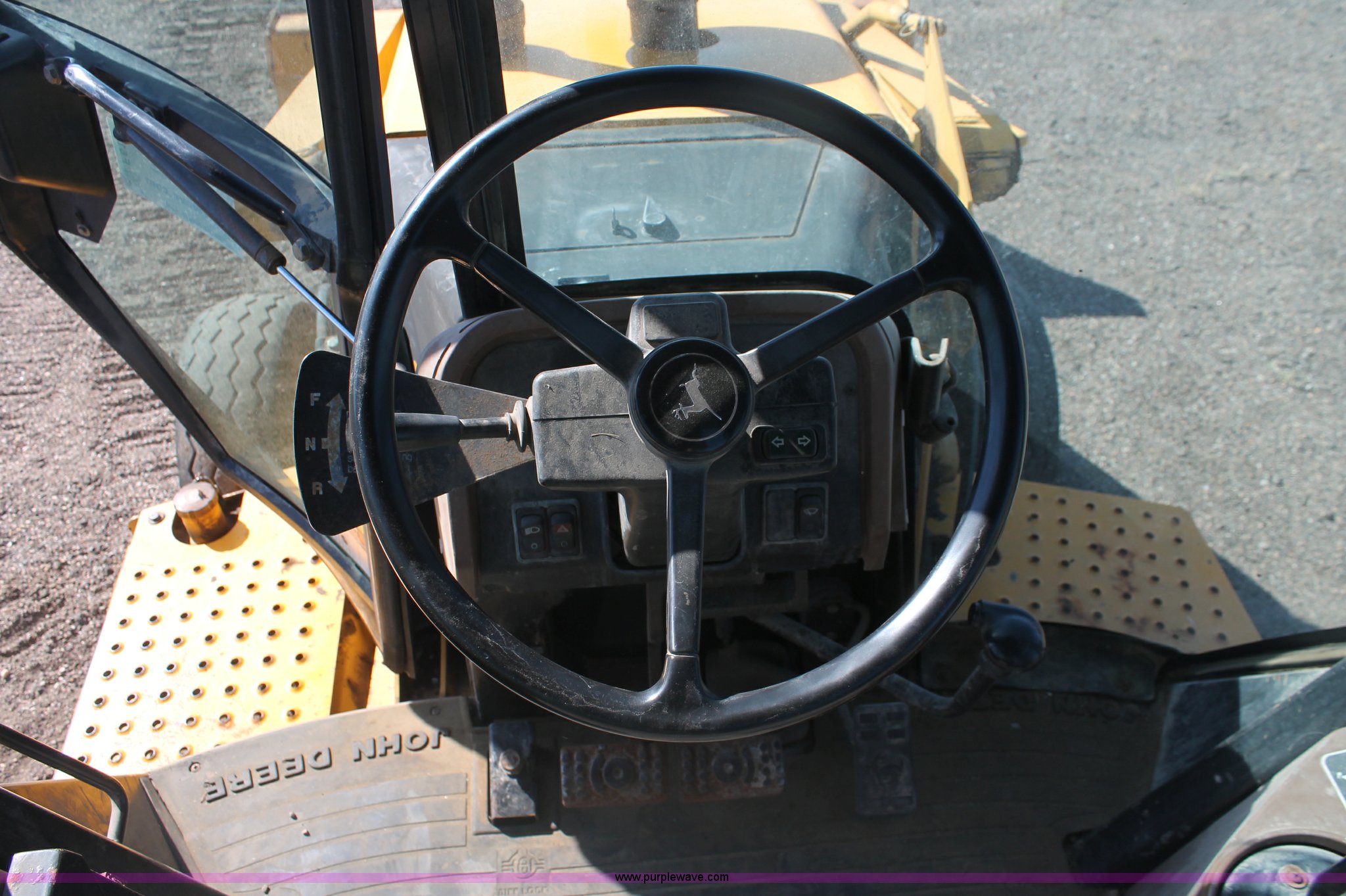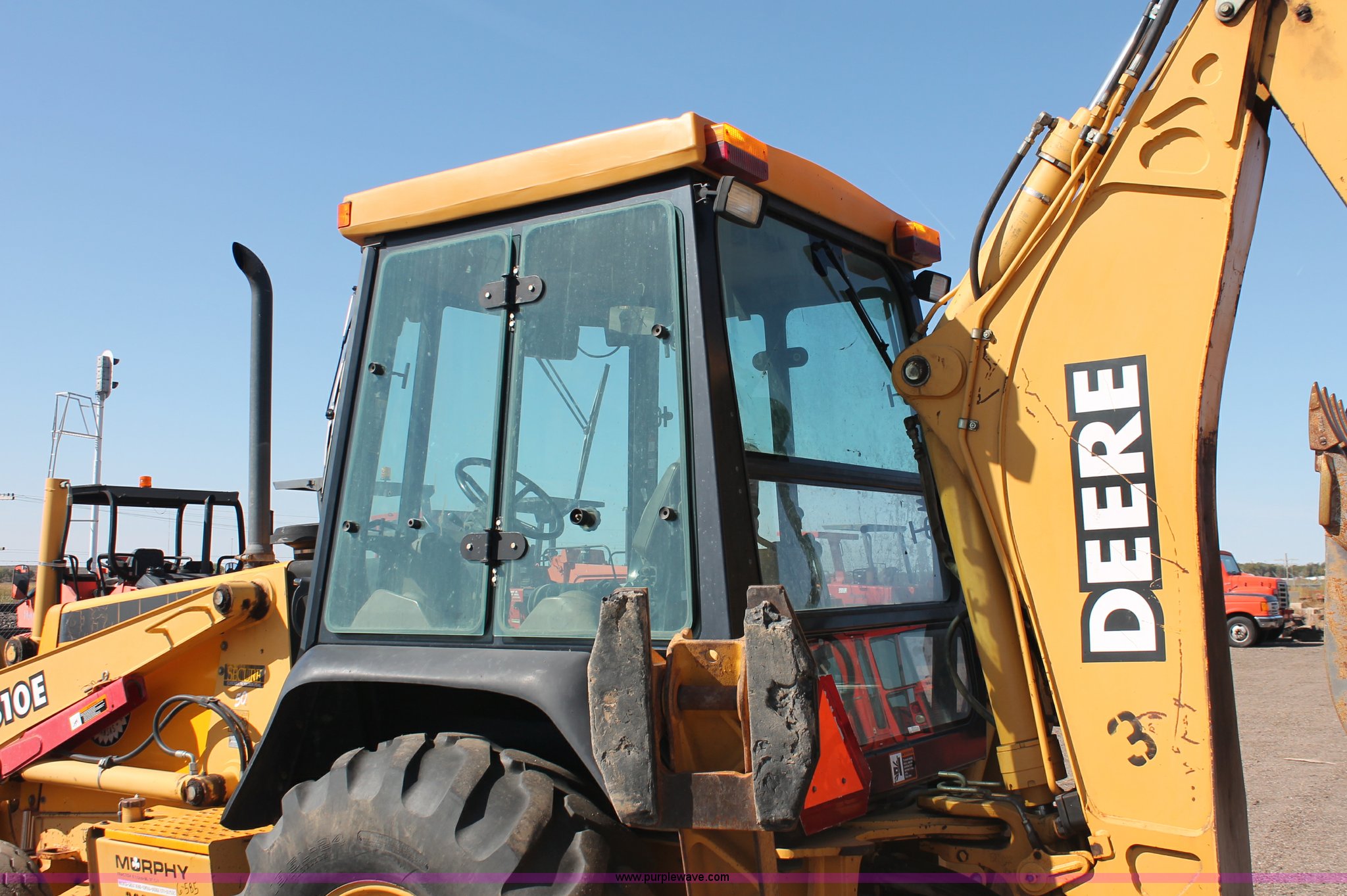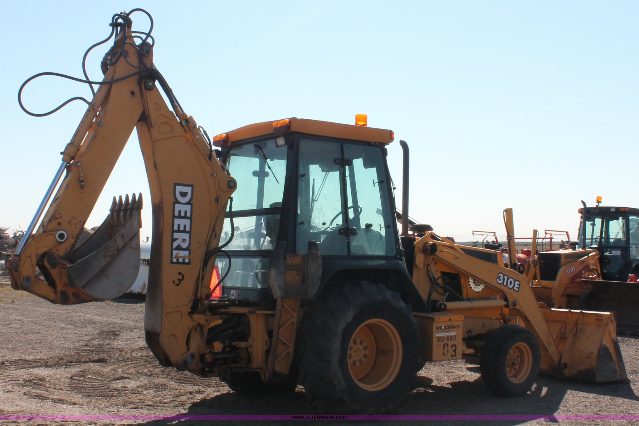 Purple Wave is selling a used Tractor Loader Backhoe in Kansas. This item is a 1997 John Deere 310E backhoe with the following: 2954 hours on meter, John Deere four cylinder diesel engine, Four speed power shift transmission, AC and heat, AC is nonfunctional, AM/FM, Suspension seat, Front and rear wipers, Front and rear worklights, Joystick loader control, 7' loader bucket, Two stick backhoe control, 24" five tooth backhoe bucket, Outrigger seals leak, Lower rear glass slides down on its own, Hydraulic leaks, Missing temperature control on dash, 11L-16SL front tires, 19.5L-24 rear tires", Serial T0310EX836846, KDOT ID 362-6017