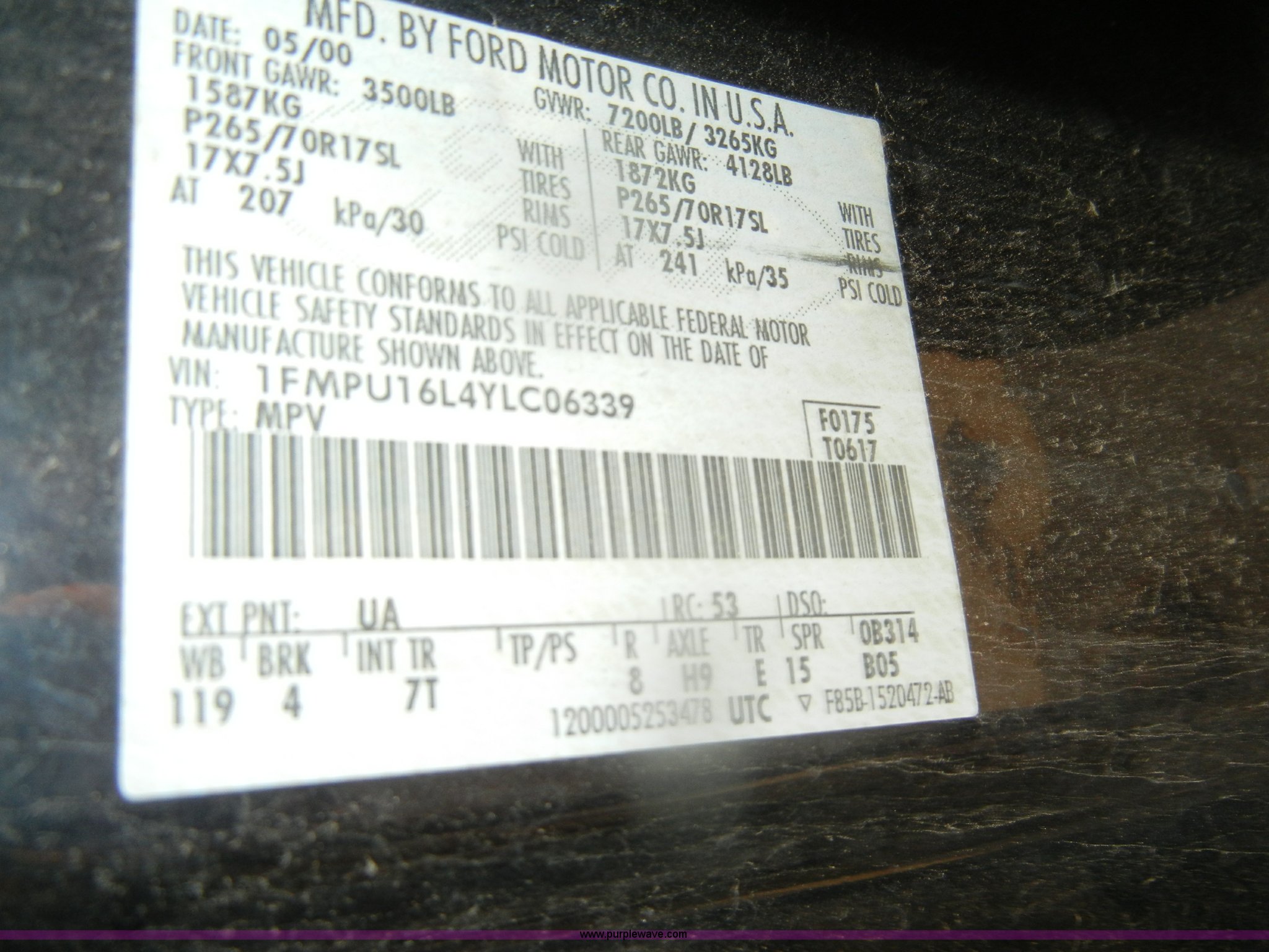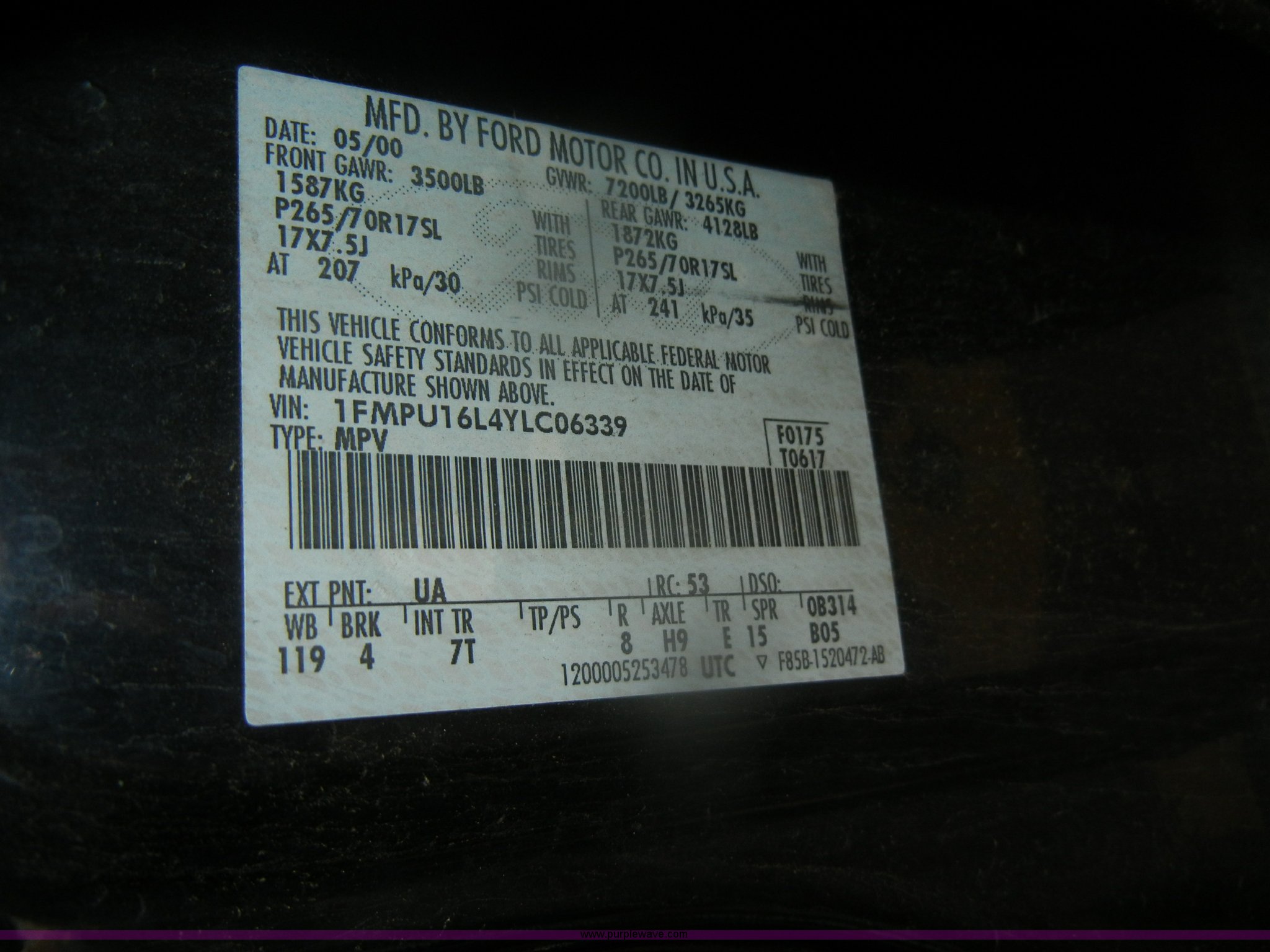 2000 Ford Expedition XLT SUV. Unknown miles on odometer, 5.4L V8 EFI gas engine, Automatic transmission, Four wheel drive, AC and heat Heater inoperable, Tilt, Cruise, AM/FM, Power windows, locks, mirrors, and seats, Cloth interior, Navigation system, Rear window defrost, Keyless entry, Bug guard, Front tow hooks, Ball hitch, Trailer wiring, 265/70R17 tires, Cosmetic damage to center arm rest, Tail lights damaged. 1FMPU16L4YLC06339. Shipping quotes available. 825 Levee Dr.. Manhattan, KS 66502