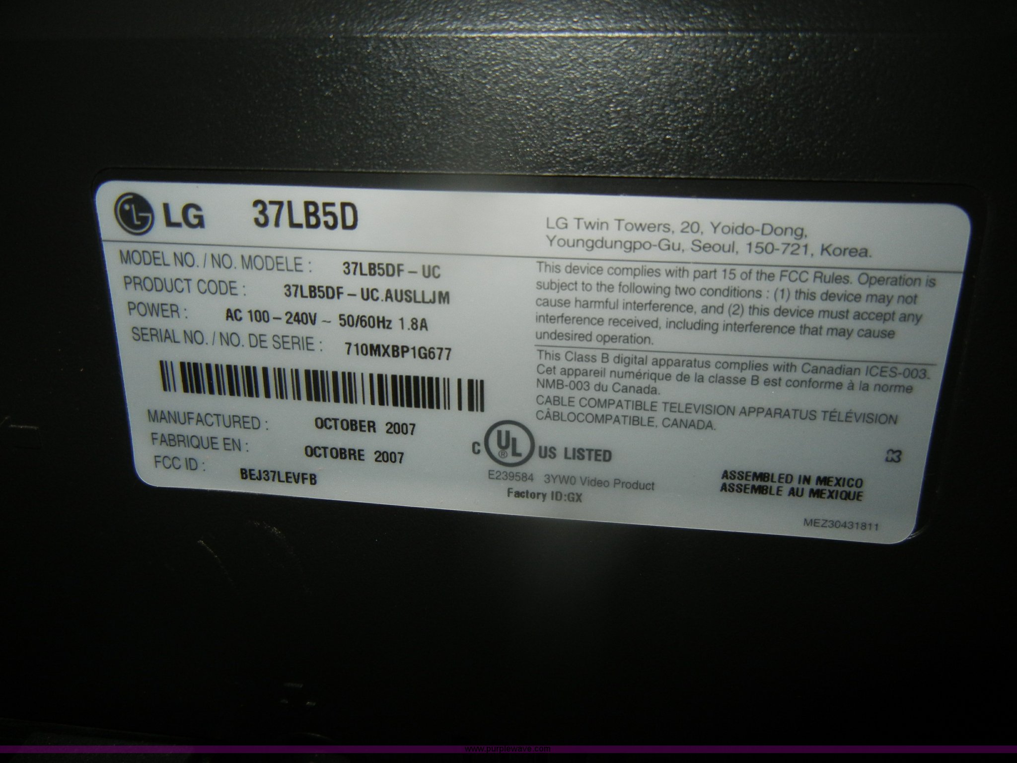 Purple Wave is selling a used Electronics in Kansas. This item is a LG 37" television with the following: Model 37LB5DF-UC, Full 1080p HD, Power cord, Remote, Powers on, Serial 710MXBP1G677