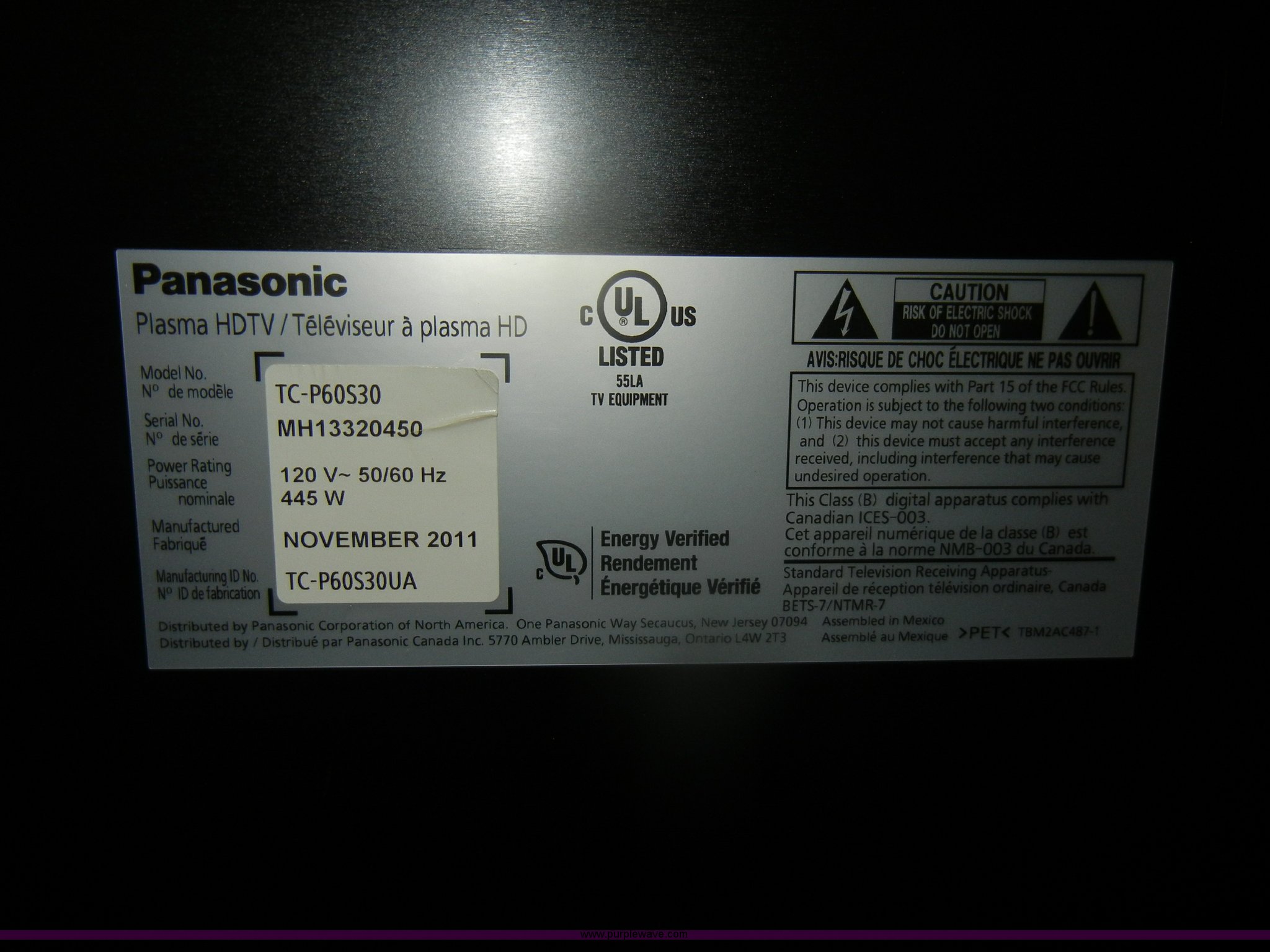 Panasonic 60" plasma television. Model TC-P60S30, Power cord, Powers on, No remote, Serial MH13320450. Shipping quotes available. 825 Levee Dr.. Manhattan, KS 66502