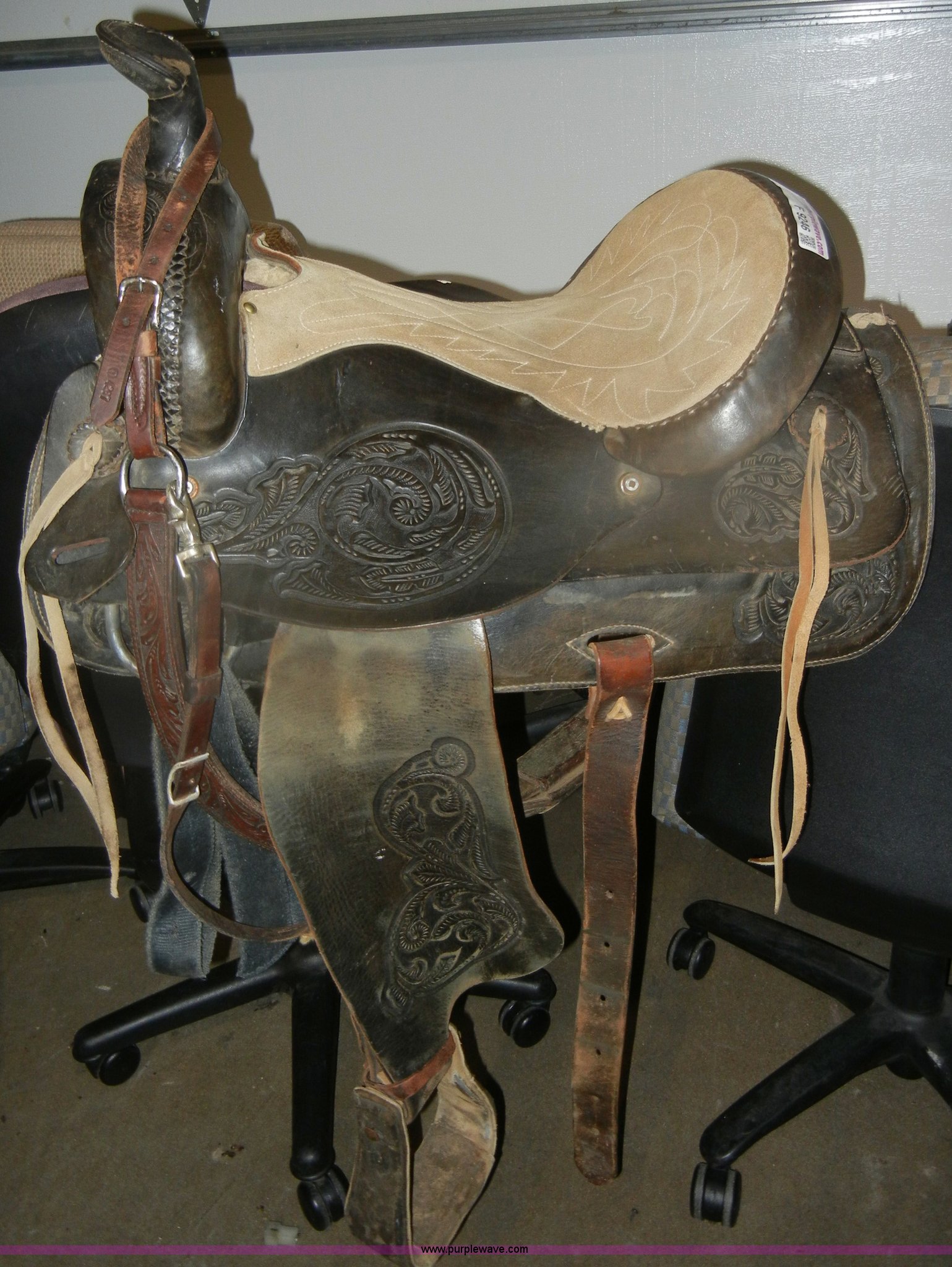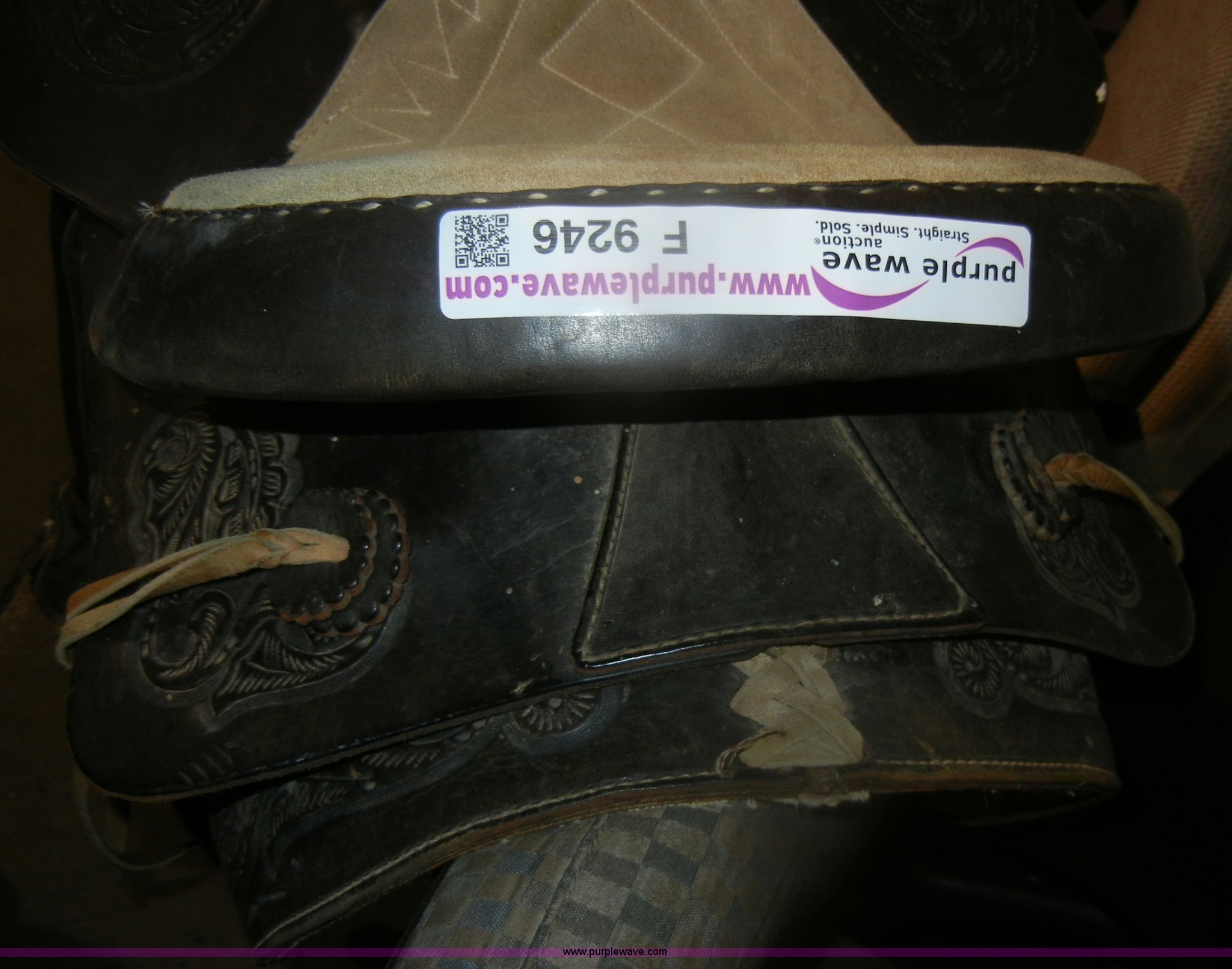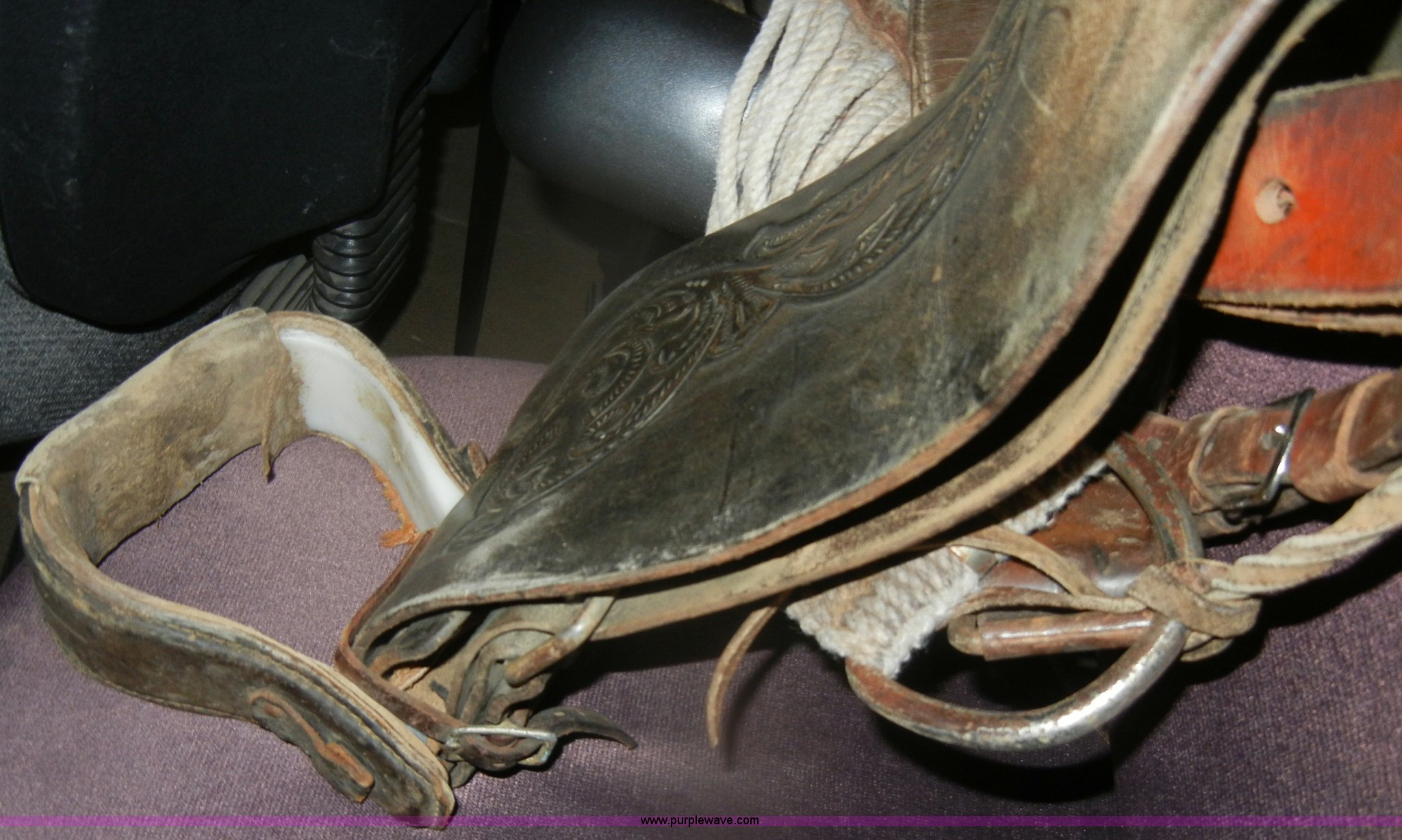 Purple Wave is selling a used Livestock Equip. in Kansas. This item is a Saddle with the following: Breast plate, Suede seat, 26"L skirt, 6" swell, 5" cantle, Horn, 2" post, 2.5" cap, Bell shaped stirrups, 2.75"W, (27) cinch strands, 16" seat, Single dee, Rear tie straps
