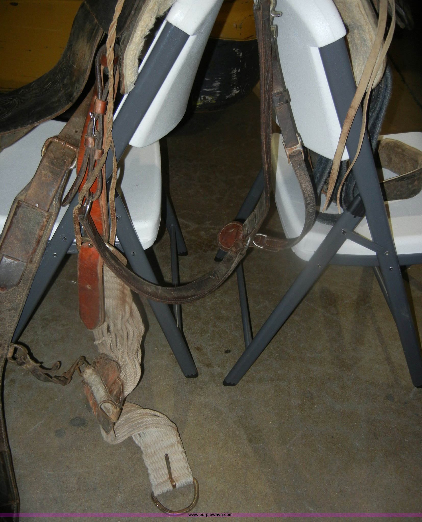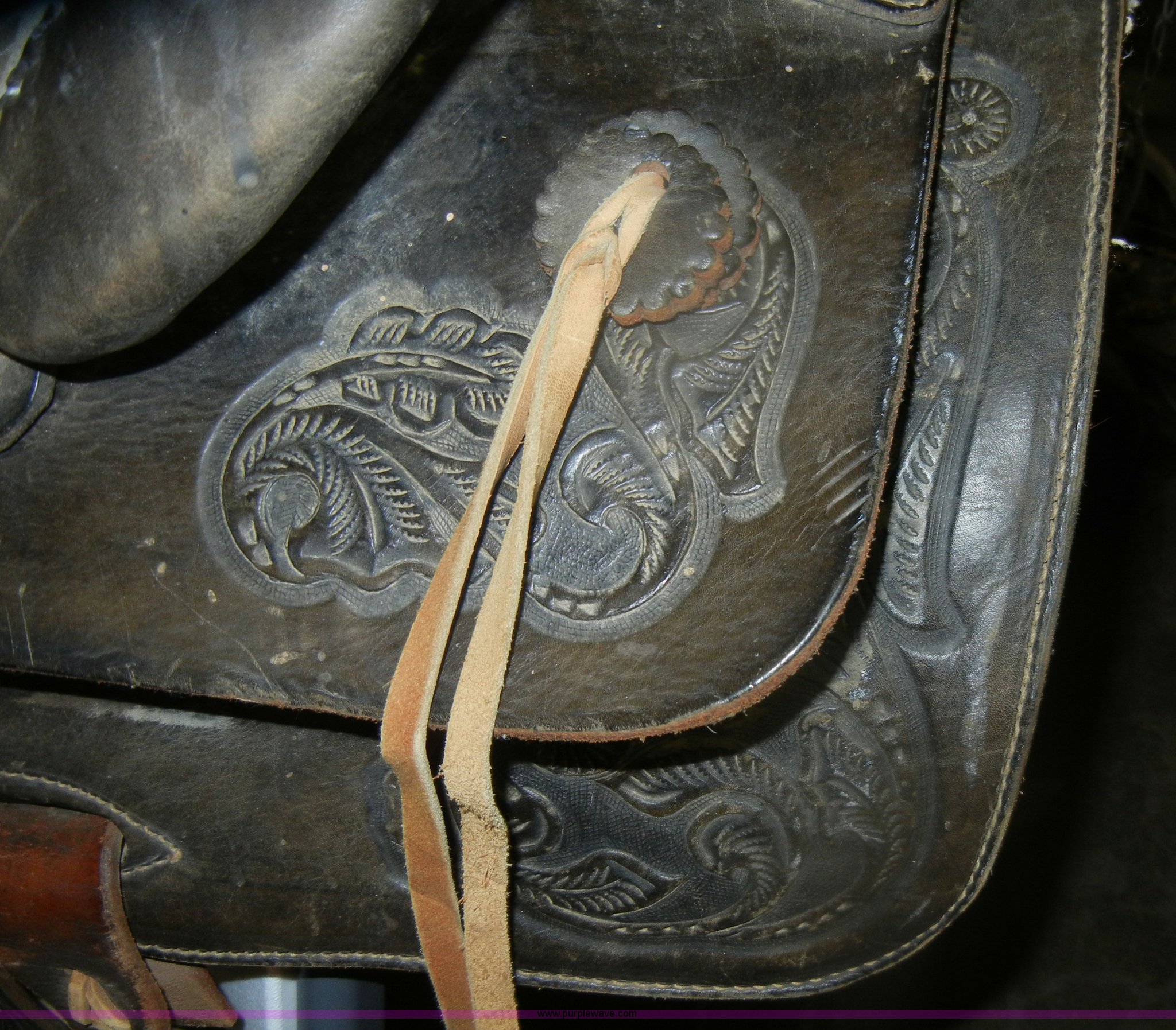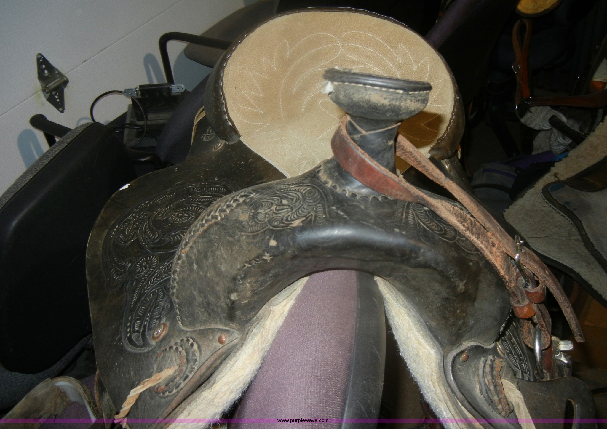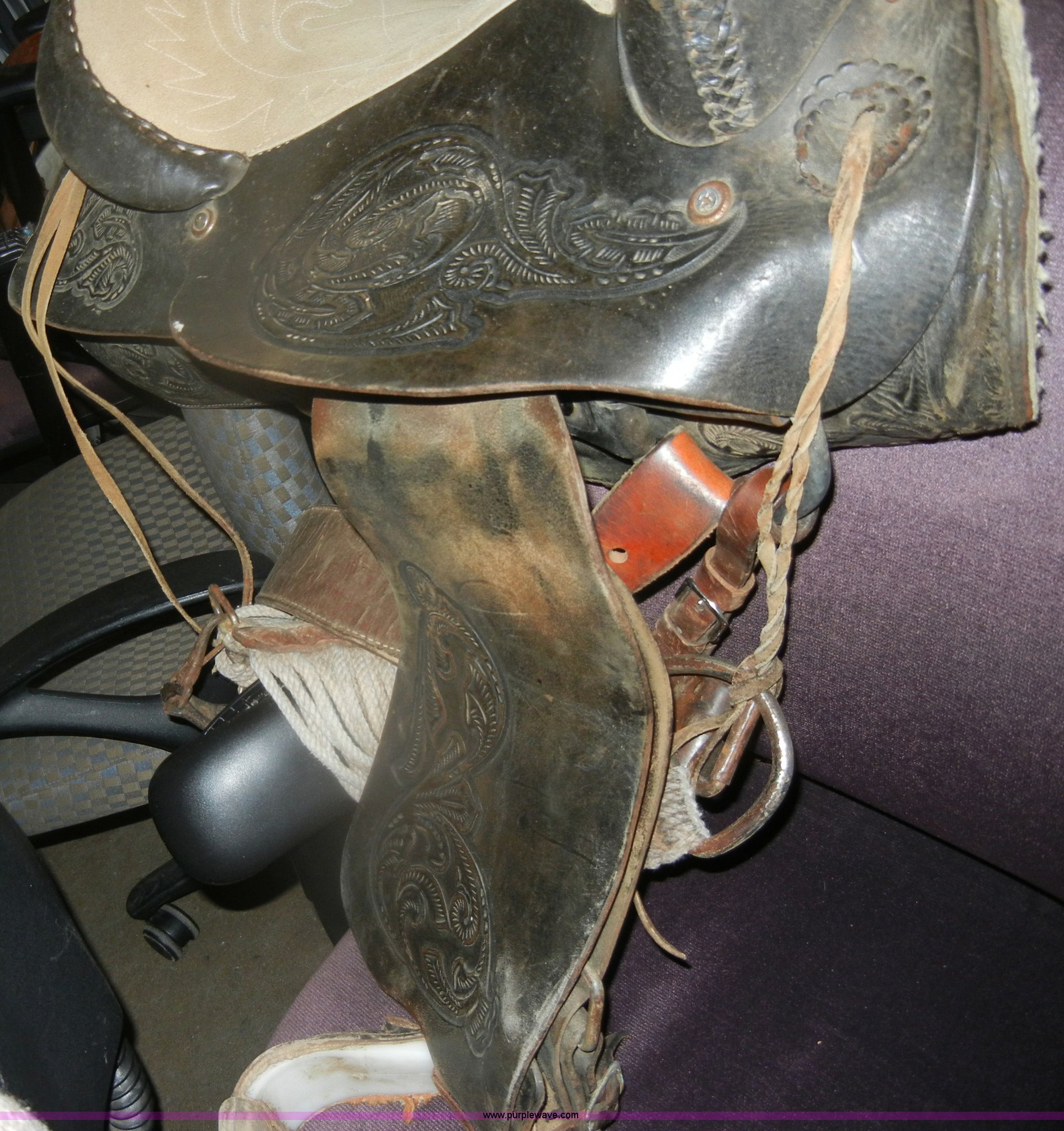 Purple Wave is selling a used Livestock Equip. in Kansas. This item is a Saddle with the following: Breast plate, Suede seat, 26"L skirt, 6" swell, 5" cantle, Horn, 2" post, 2.5" cap, Bell shaped stirrups, 2.75"W, (27) cinch strands, 16" seat, Single dee, Rear tie straps