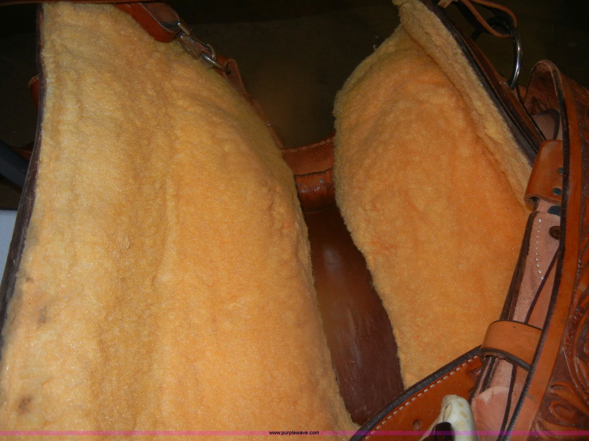 Purple Wave is selling a used Livestock Equip. in Kansas. This item is a Billy Cook roping saddle with the following: Breast plate, 29"L skirt, 6" swell, 4.5" cantle, Horn, 3" cap, 2" post, Bell shaped stirrups, 3"W, (27) cinch strands, 16" seat, Ornate silver buttons and horn cap, Double dee