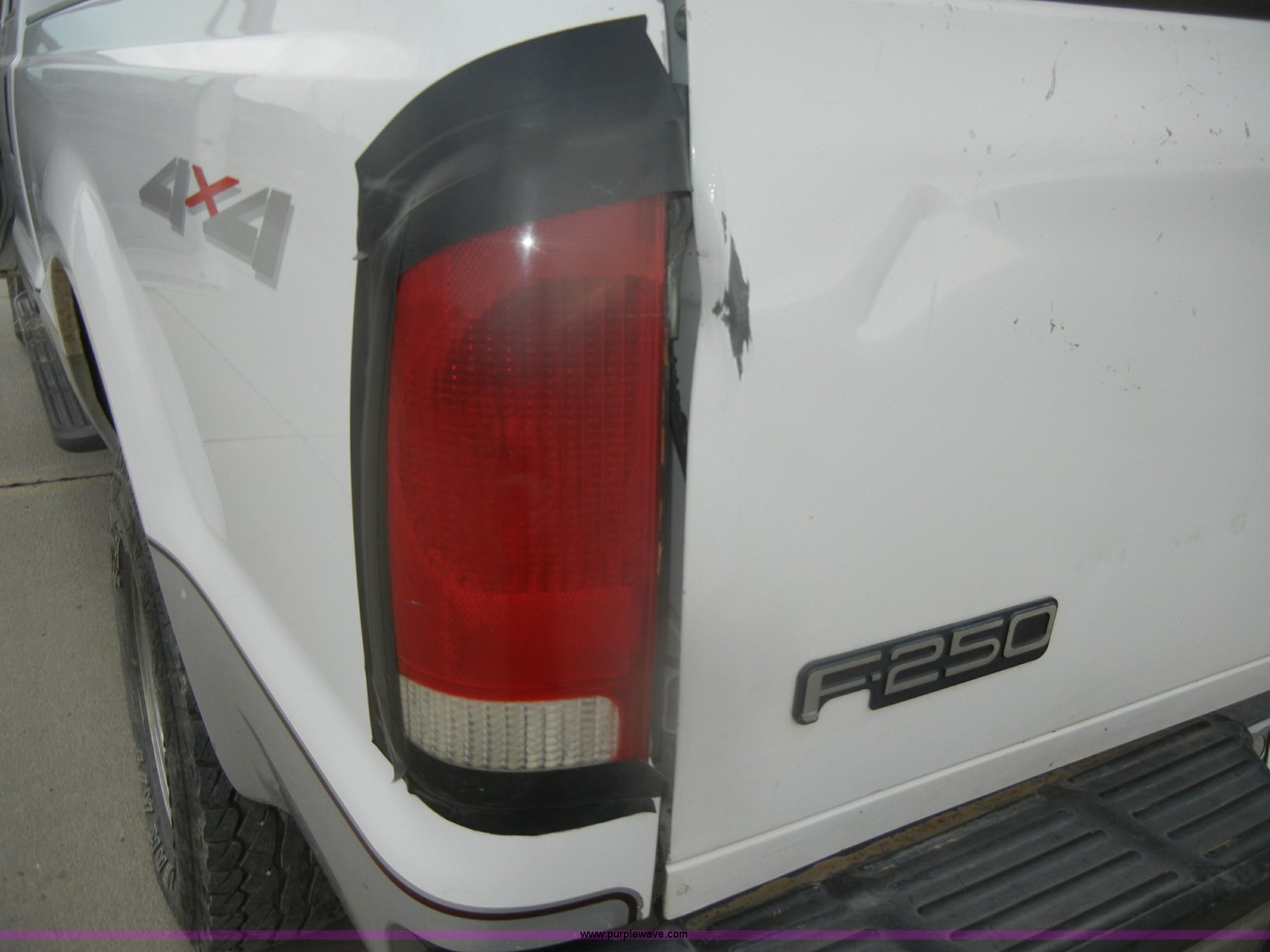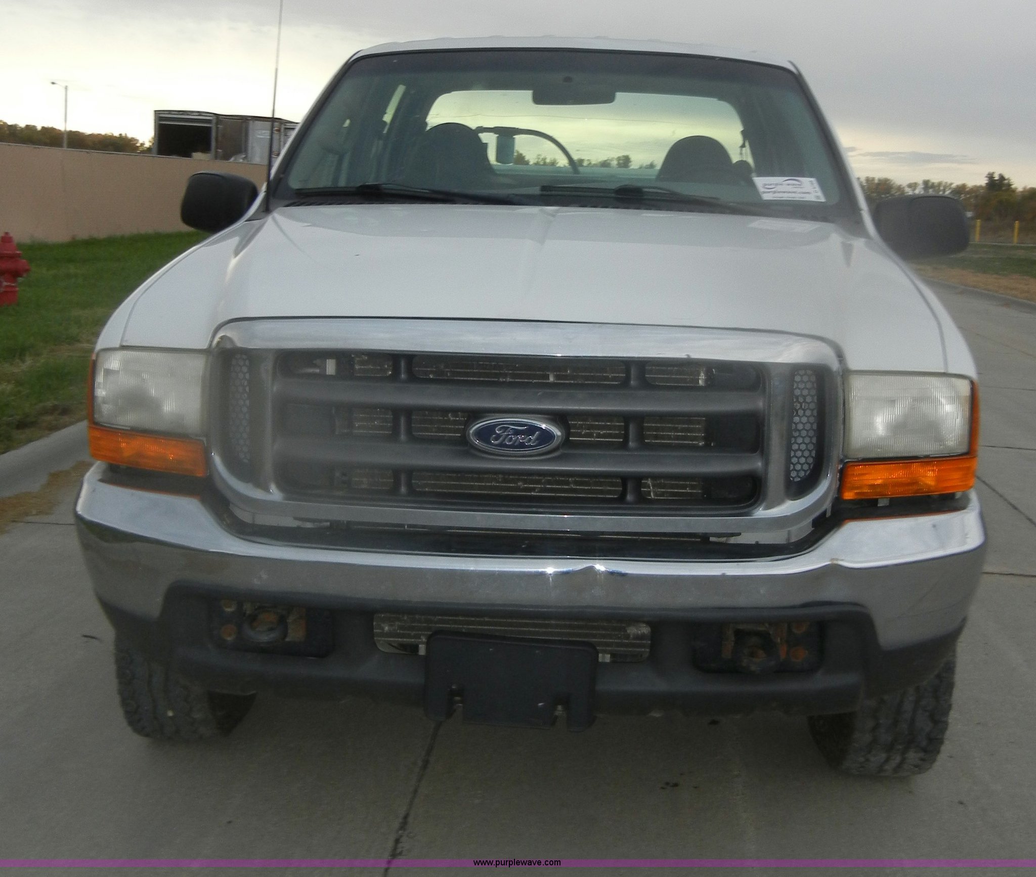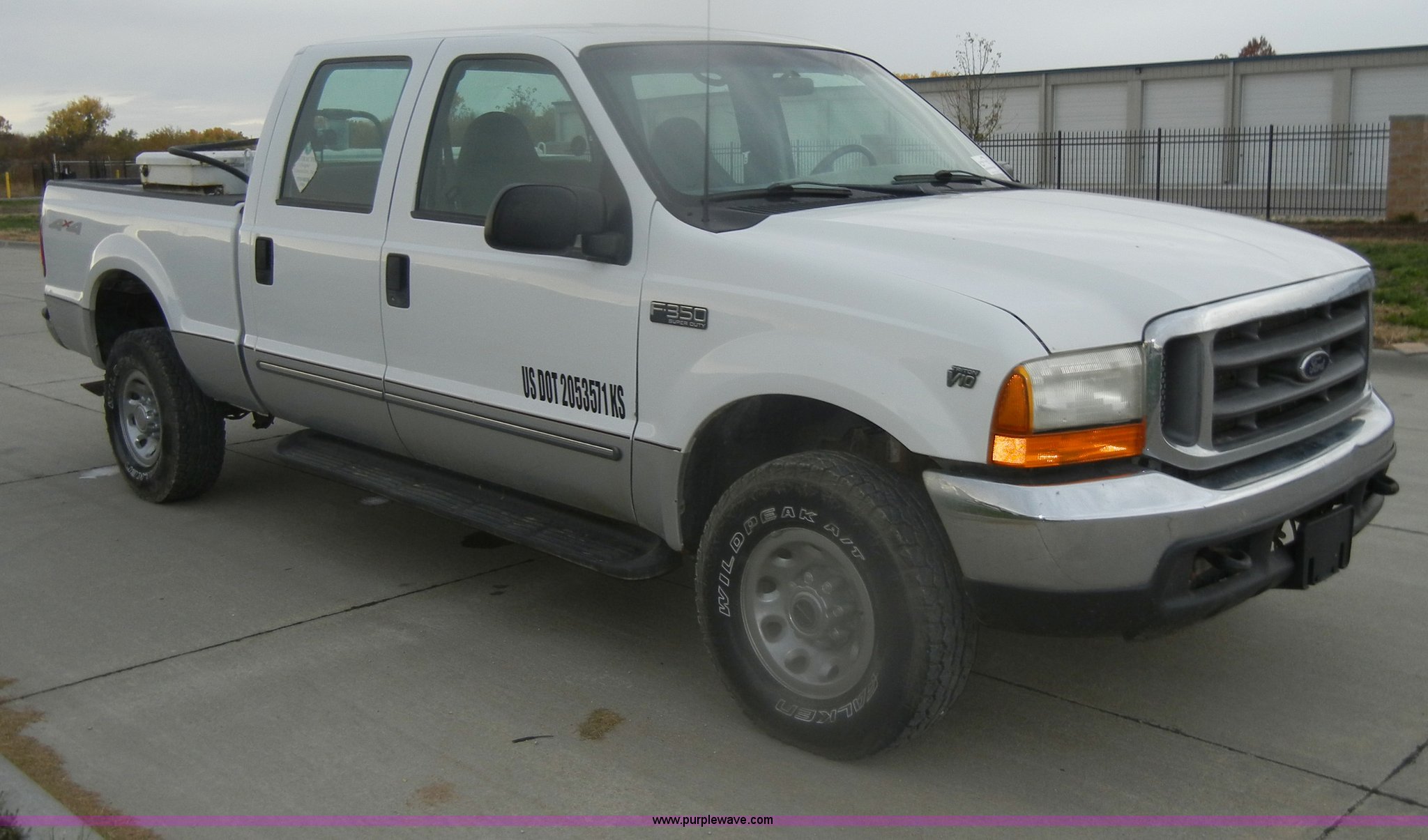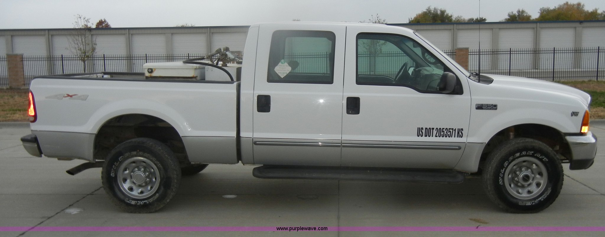 Purple Wave is selling a used Passenger Vehicle in Kansas. This item is a 1999 Ford F350 Super Duty Crew Cab pickup truck with the following: 248,195 miles on odometer, Triton 6.8L V10 gas engine, Automatic transmission, Four wheel drive, AC and heat, Tilt, Cruise, AM/FM/CD, Power windows, locks, and mirrors, Cloth interior, Side steps, Front tow hooks, 7' x 6' bed, Toolbox, Fuel tank, Gooseneck ball, Receiver hitch, Trailer wiring, 265/75R16 tires, Interior/exterior cosmetic damage, Cracked windshield, Passenger side mirror cracked, Hail damage, Paint peeling/chipping, No tailgate handle, Dents and scratches