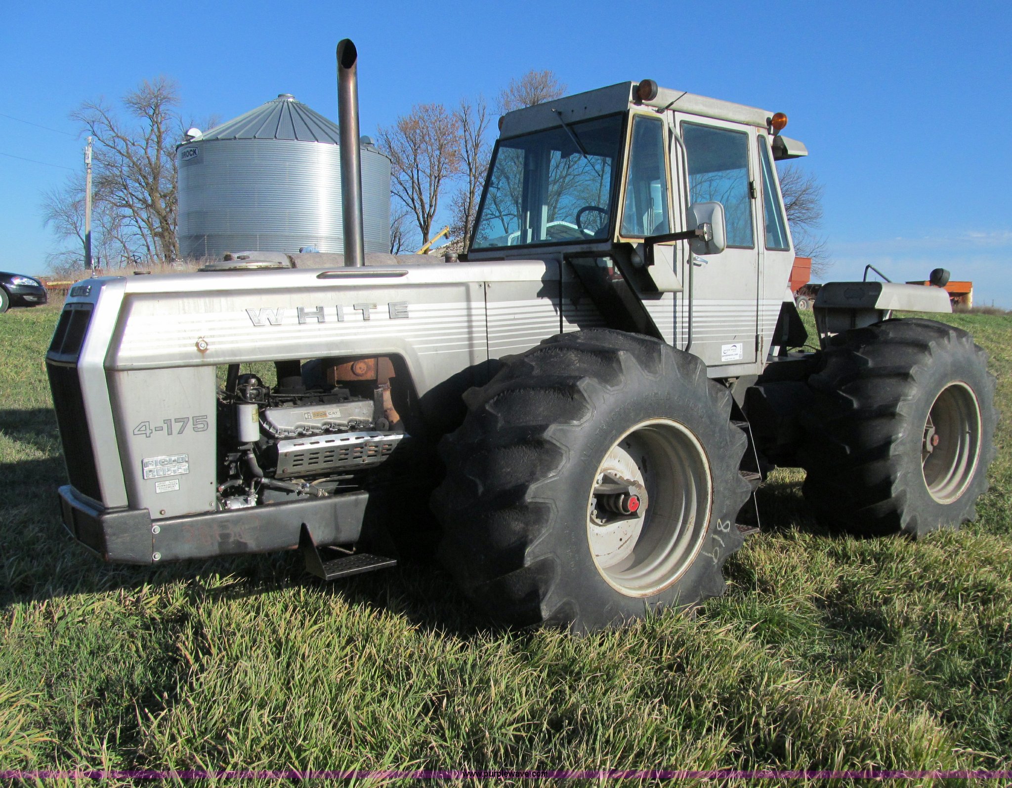 Purple Wave is selling a used Articulated 4-Wheel Drive Tractor in Iowa. This item is a 1980 AGCO White 4-175 Field Boss 4WD tractor with the following: 6,287 hours on meter, Caterpillar 3208 eight cylinder diesel engine, 175 HP, Serial 90N47446, Synchro transmission, 18F-6R gears, 6F-3R gears with three speed powershift, AC and heat, AC non-functional, AM, Three point, Draw bar, 1000 PTO, (2) rear hydraulic remotes, Hitch load response, 30.5-32 tires, Recently installed cab kit, Recently replaced batteries, Serial 295859-422