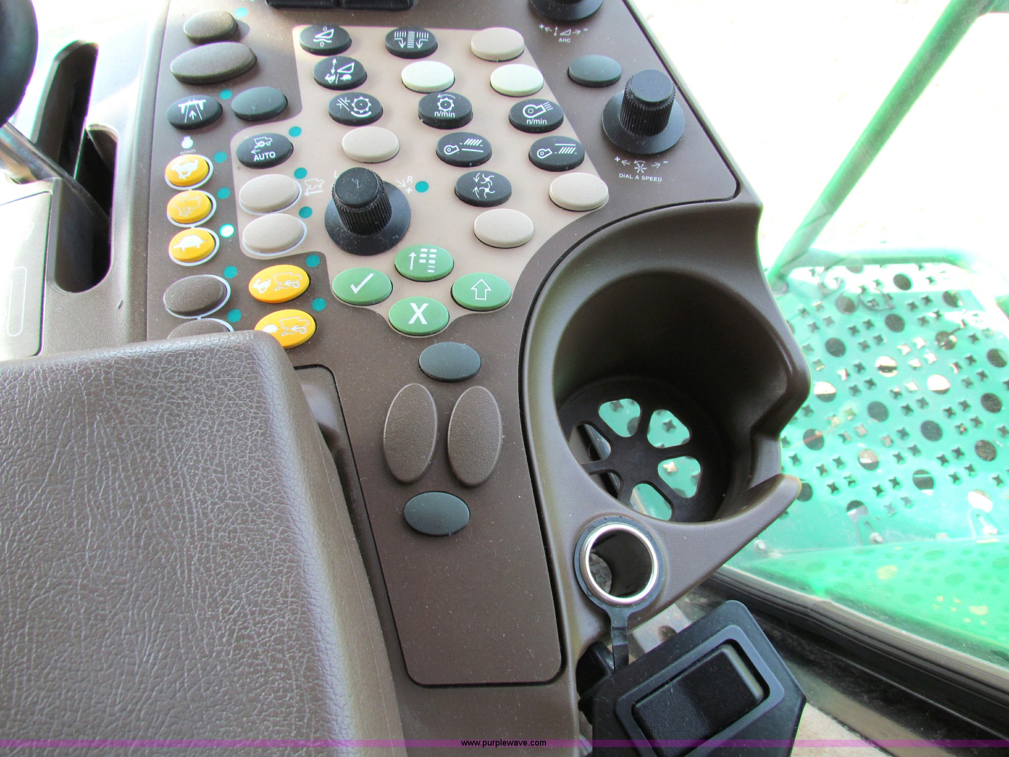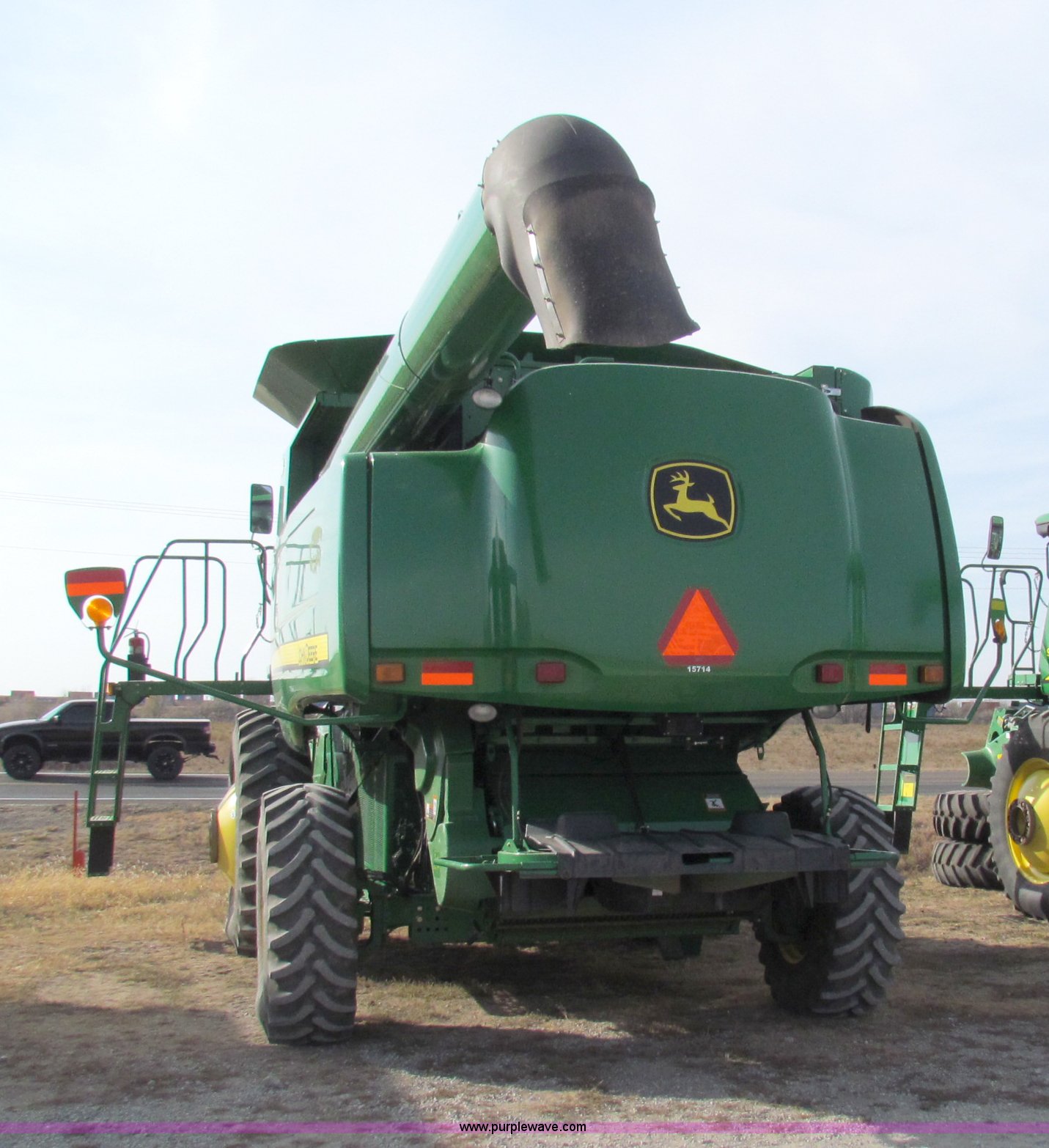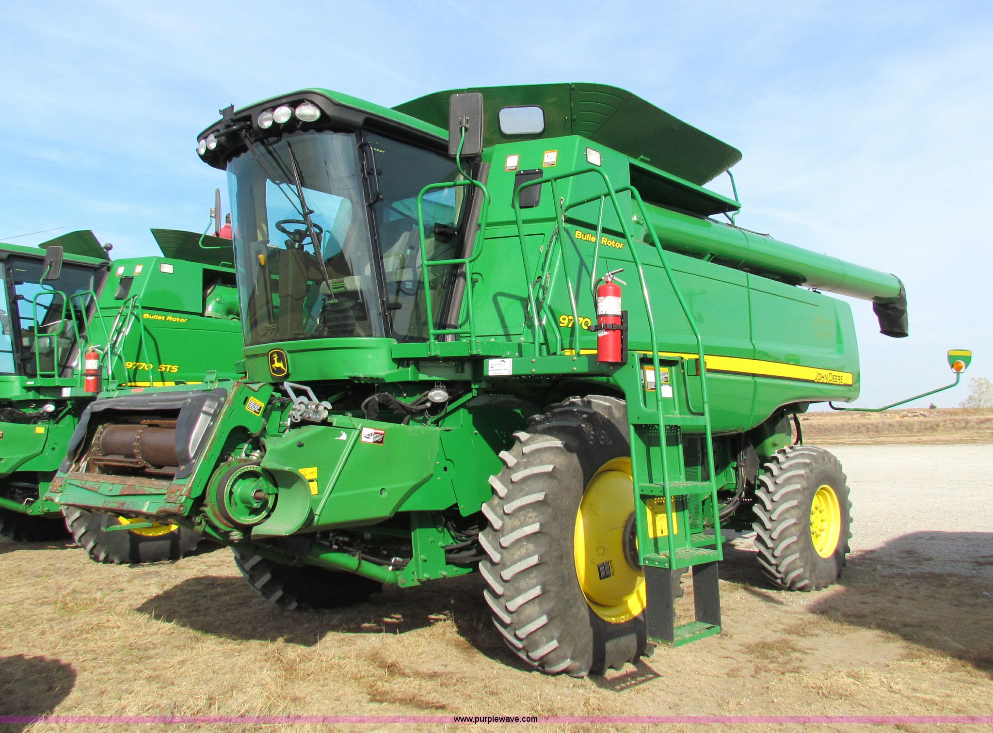 Purple Wave is selling a used Combine in Kansas. This item is a 2009 John Deere 9770 STS RWA combine with the following: 2,120 engine hours on meter, 1,427 separator hours on meter, John Deere 9.0L diesel engine, 360 HP, Model 6090HH008, Hydrostatic transmission, 3F-1R gears, Heavy duty final drives, Two-speed power rear wheels, Contour Master feeder house, Hi torque, Five speed, Reverser, Hi capacity lift cylinders, Single point header hookup, Deluxe header controls, Custom cutter extended wear separator, Sidehill cleaning shoe package, General purpose chaffer, Straw chopper, Wide spread, Fine cut, Power tailboard, Premier cab, AC and heat, AM/FM/CD/weatherband, Air ride seat, Instructor's seat, Tilt steering wheel, John Deere Command Center, Draper belt speed control, In-cab chaffer and sieve adjustment, Auto header height control, HarvestSmart feedrate control system, John Deere bin extensions, Hi capacity unload auger, Small wire concaves installed, Work lights, Operators manual, Greenstar ready, Monitor not included, Receiver not included, 20.8R42 dual front tires, 18.4-26 rear tires, Serial H09770S731495, Unit# 15714