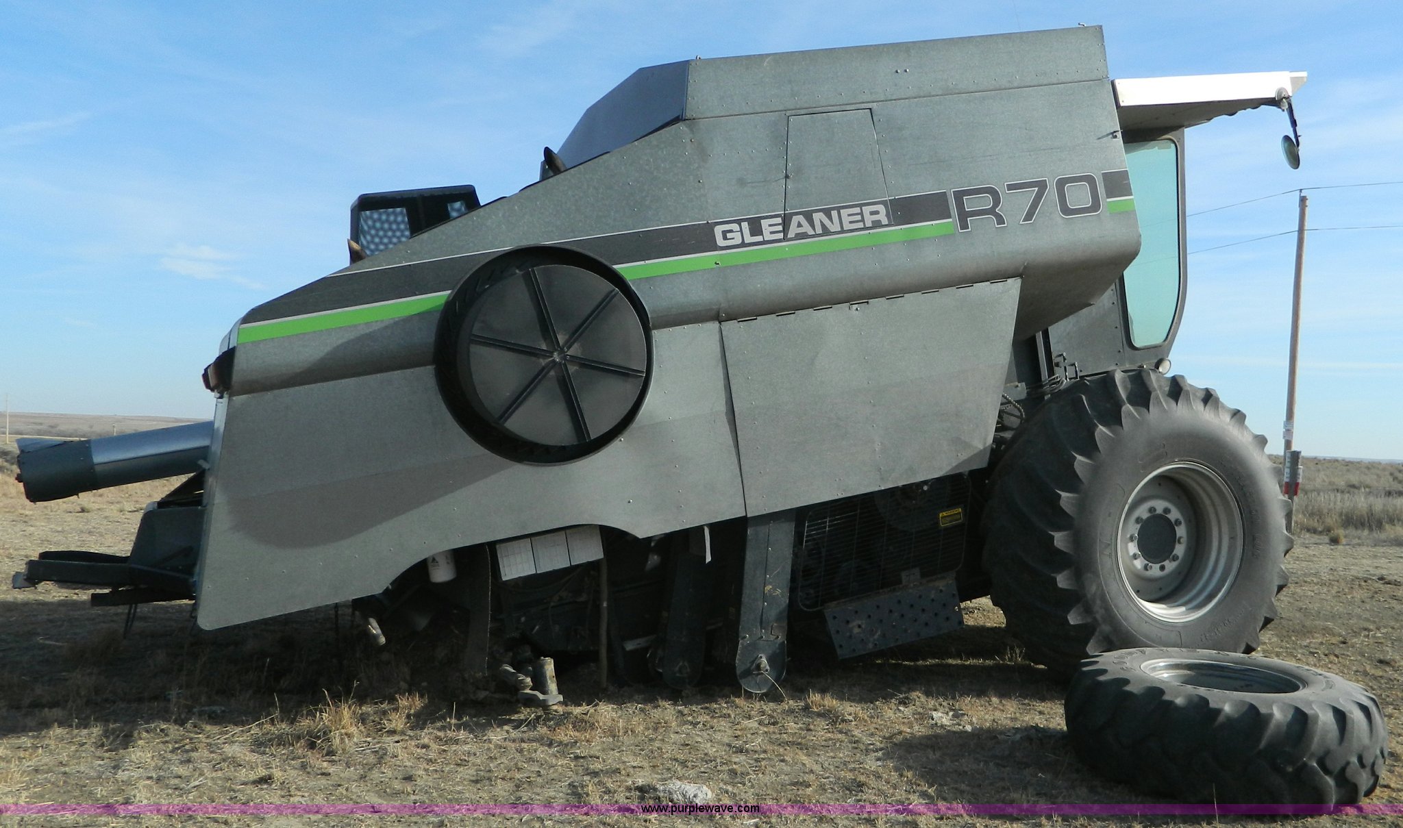 Purple Wave is selling a used Combine in Kansas. This item is a 1989 AGCO Gleaner R70 combine with the following: 5,796 engine hours on meter, 4,296 seperator hours on meter, Deutz diesel engine, Hydrostatic transmission, 3F-1R gears, AC and heat, Tilt steering wheel, Straw spreader, 30.5-32 drive tires, 16.9-34 rear tires, Combine had steering loss and substantial collision damage, Serial R70K011855118989