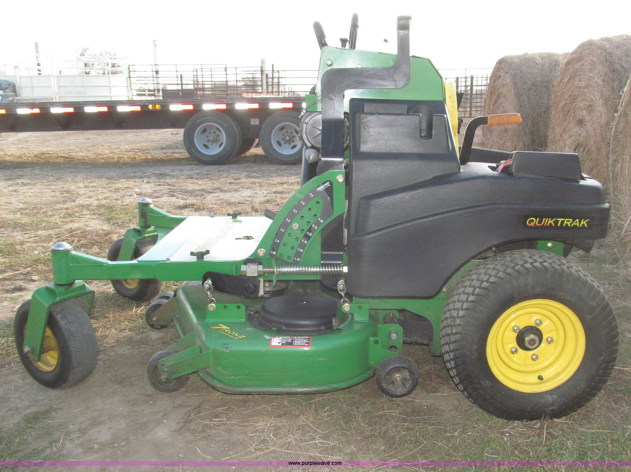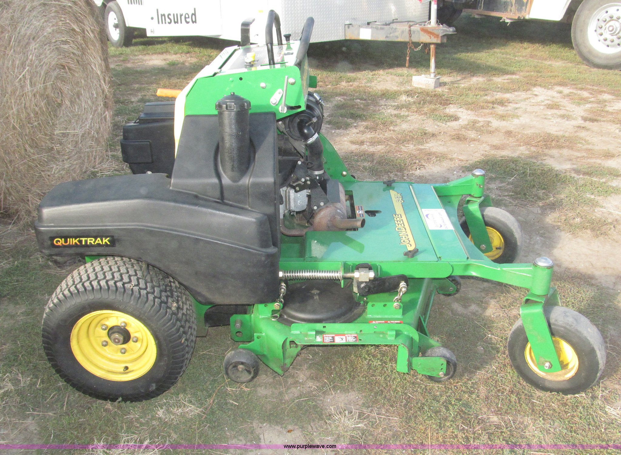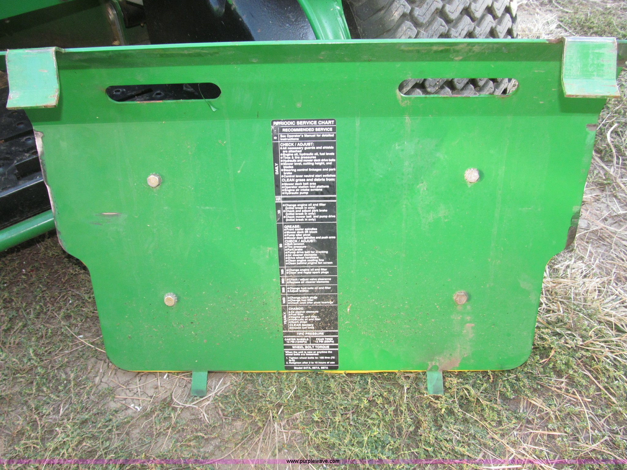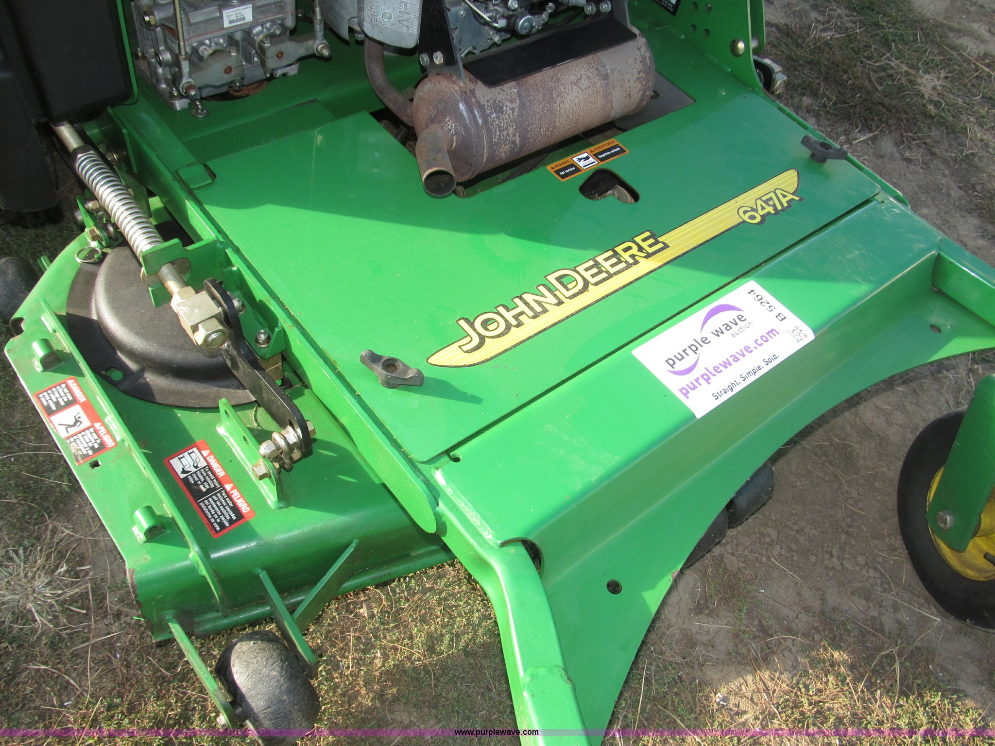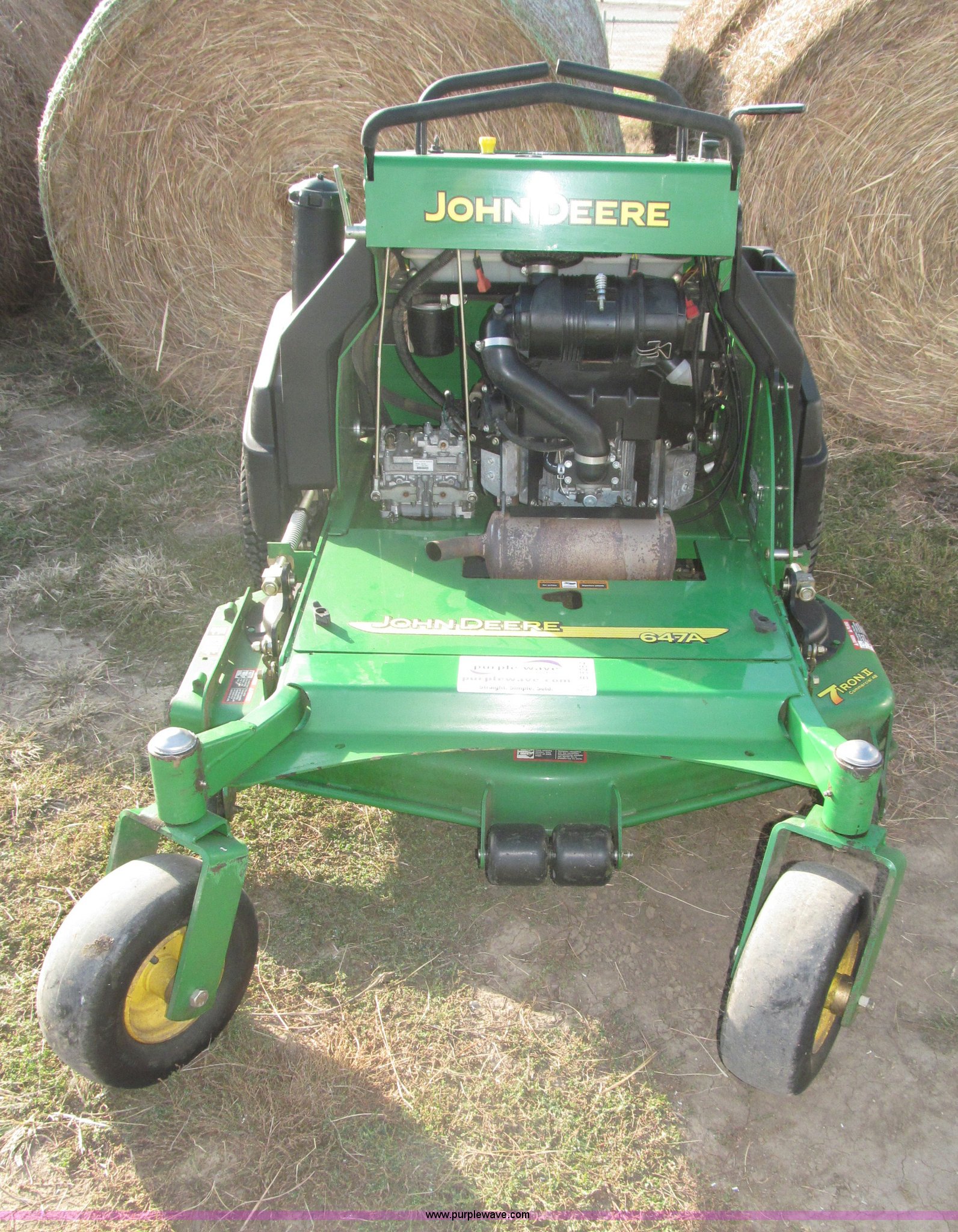Purple Wave is selling a used Commercial Turf Mower in Nebraska. This item is a 2009 John Deere 647A ZTR commercial lawn mower with the following: 185 hours on meter, 48" cut, Kawasaki 19 HP OHV gas engine, Hydrostatic transmission, Quick track, Top mount steering levers, Tuff Torq DUP105 hydraulic valve body, Serial 105115904, Removable padded plate for engine and oil tank access, Parking brake, Left side deck height adjustment, Removable deck plate for belt access, Serial TC647AX050037