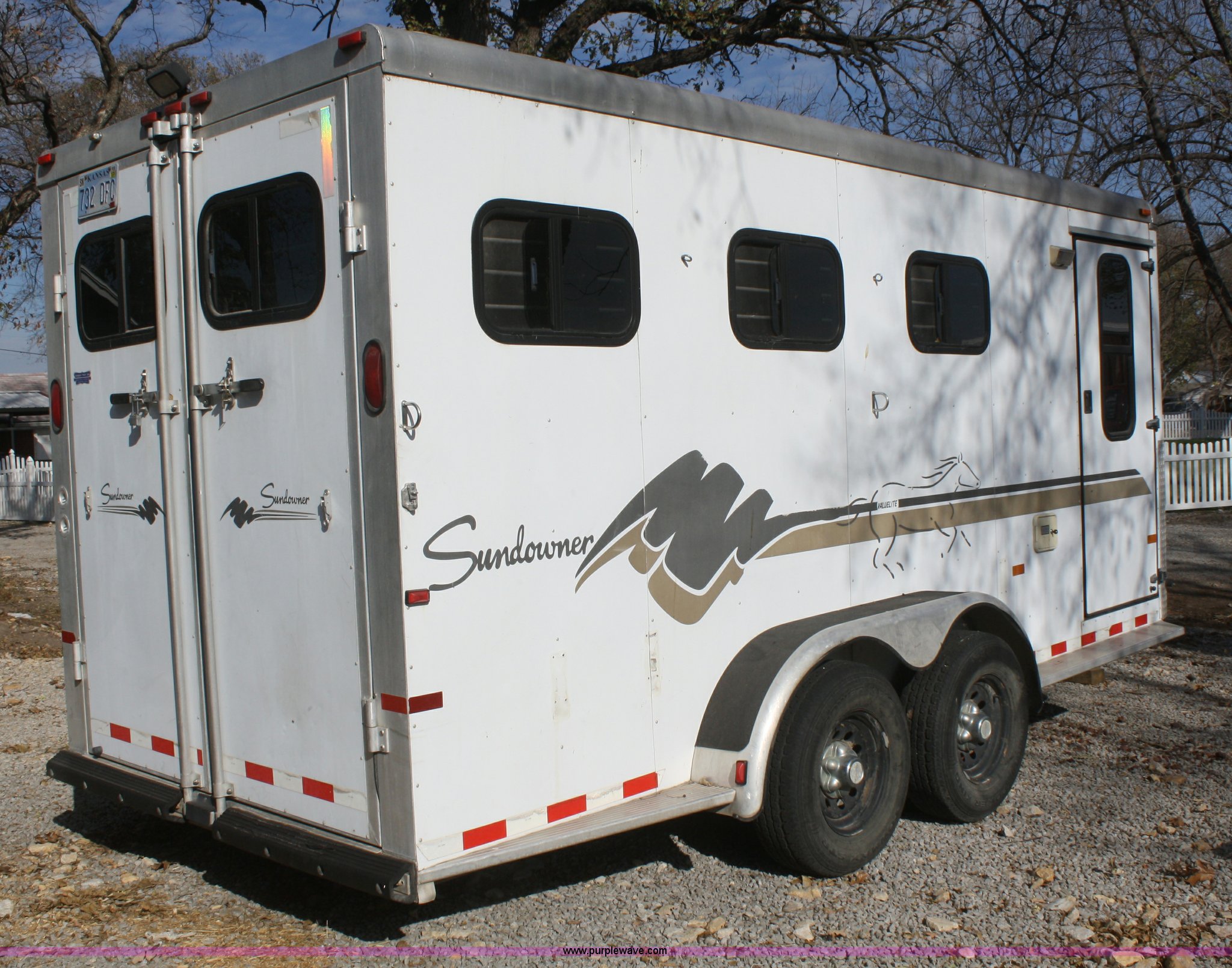 Purple Wave is selling a used Livestock Trailer in Kansas. This item is a 1999 Sundowner Valuelight 3 horse trailer with the following: Front and rear tack rooms, Floor mats, Cargo lights, Electric trailer jack, 2 5/16" ball, 228/75R15, GVWR 5,300 lbs, Tack is not included