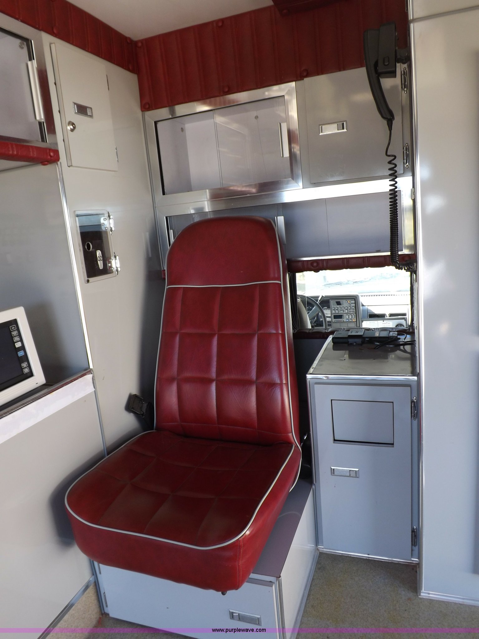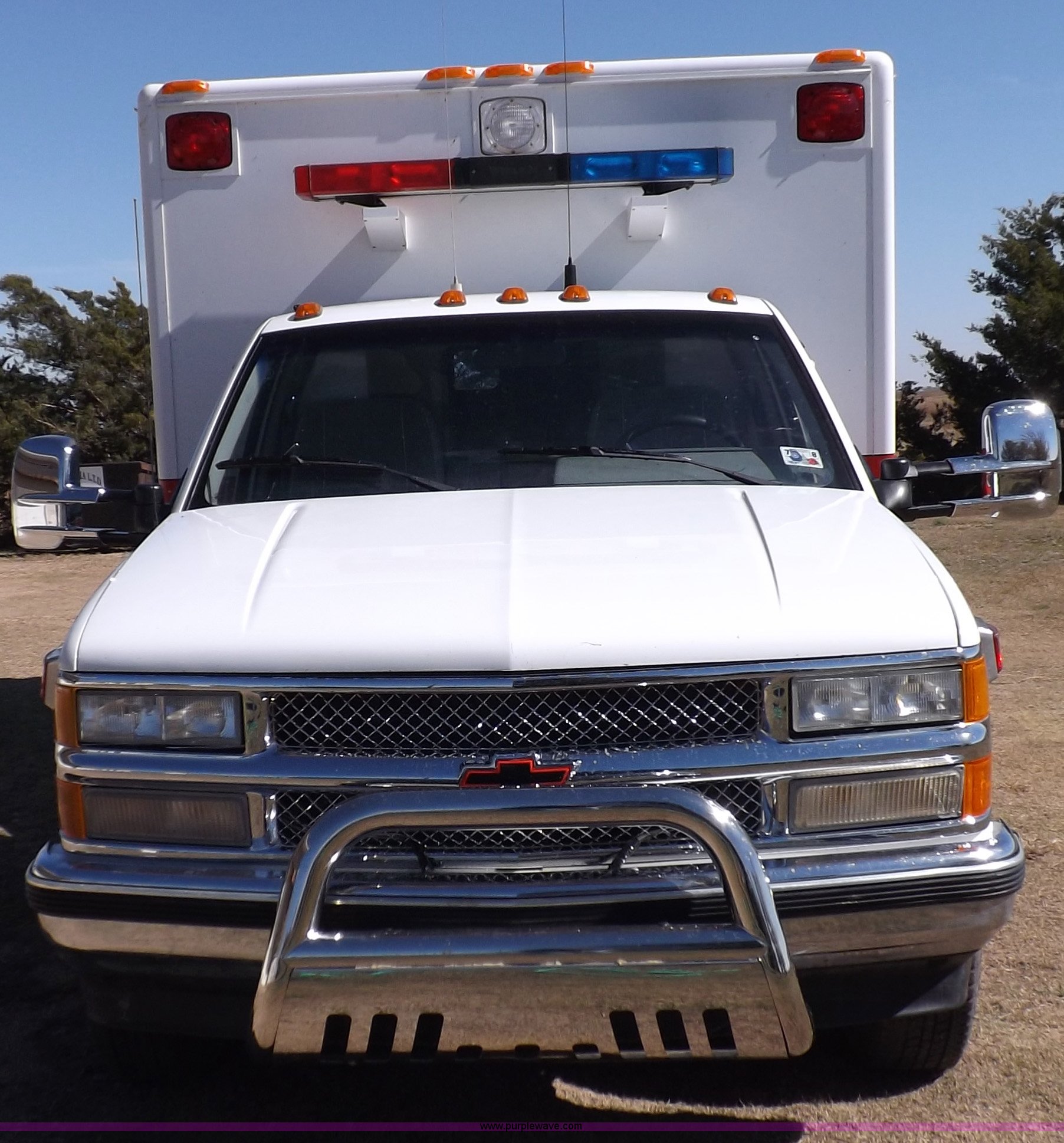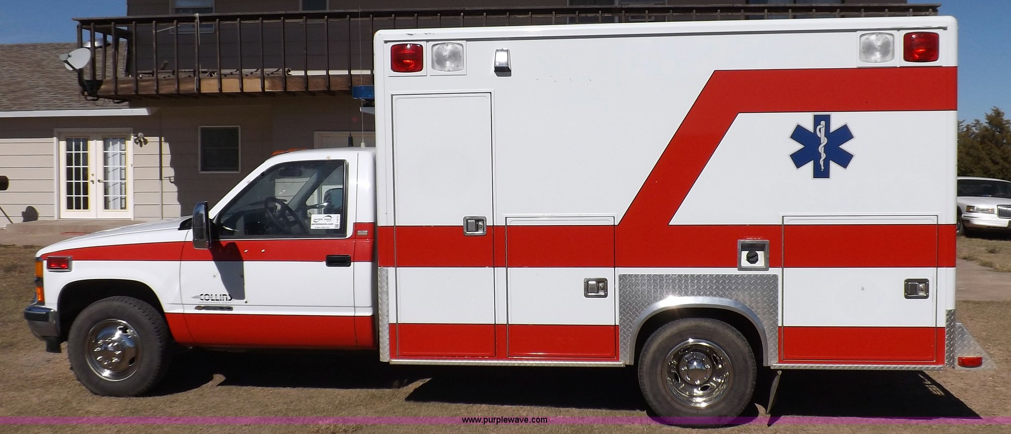 Purple Wave is selling a used Fire Truck or Emergency Vehicle in Kansas. This item is a 1991 Chevrolet Silverado C3500 ambulance with the following: 55,463 actual miles, 7.4L V8 gas engine, Automatic transmission, AC and heat, Tilt, Cruise, AM/FM, Manual windows and locks, Cloth interior, Wired 120V AC, Block heater, Heavy duty alternator, Grill guard, Mirror extensions, Whelen light package, Oxygen storage compartment, Turn signals in mirrors, Not wired, Rear folding step, Compressor, Striker Easy Pro 2 gurney, Space Lab Medical patient monitor, LifePac 10 Physio-Control defibrillator, Bedside storage compartments, 225/75R16 tires