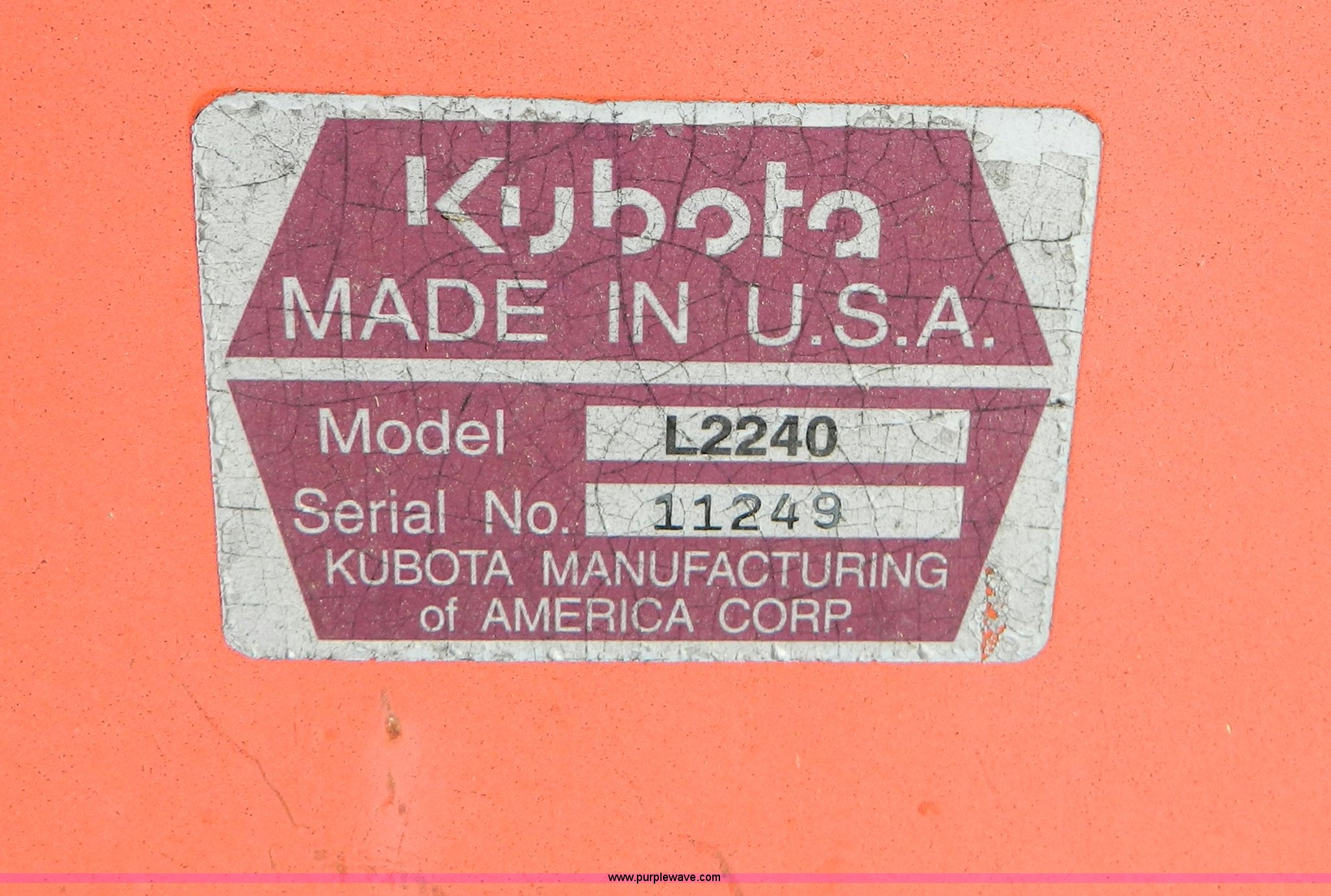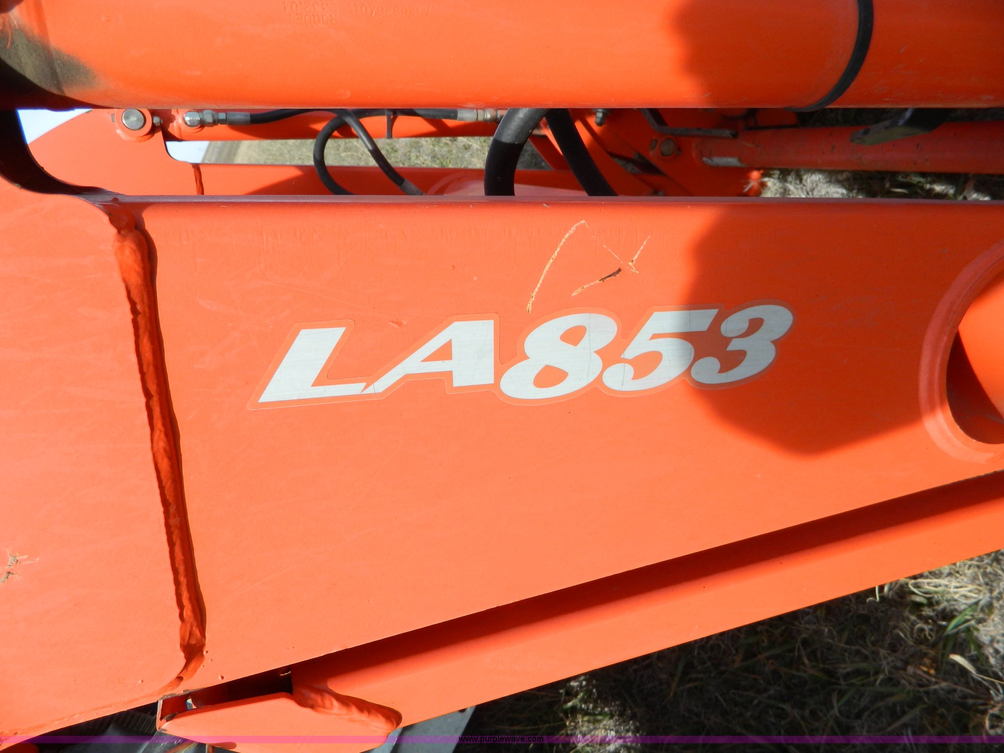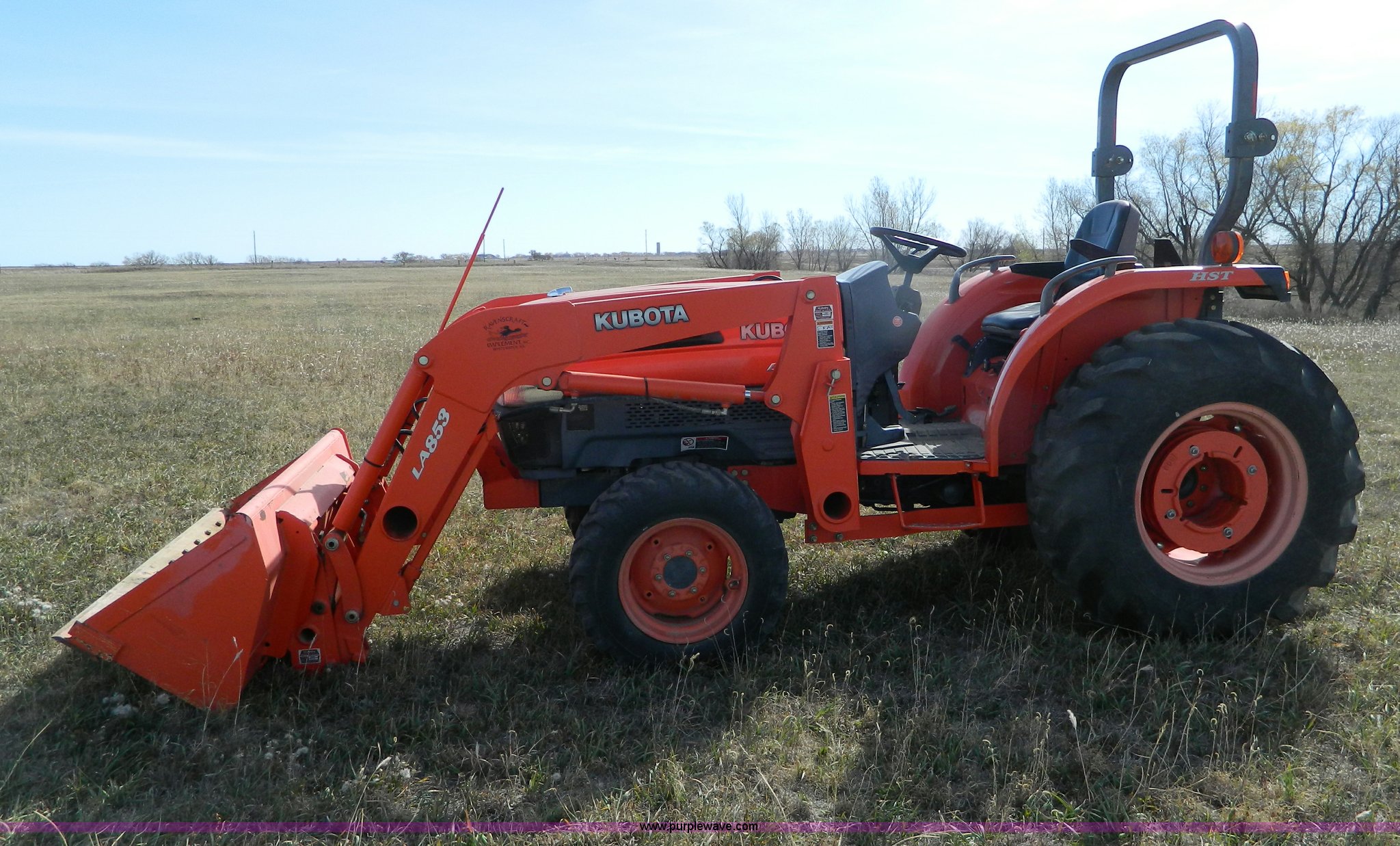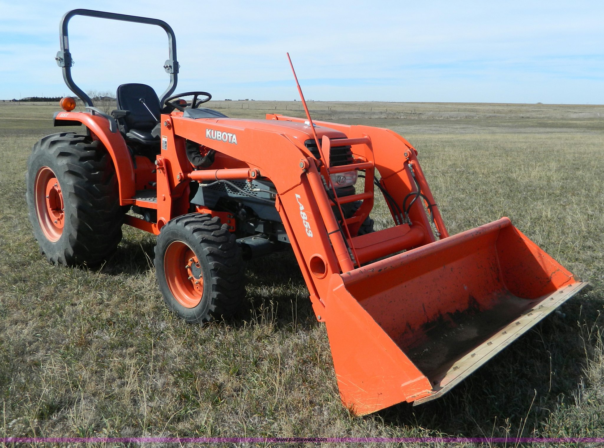 Purple Wave is selling a used Tractor in Kansas. This item is a Kubota L5030 MFWD tractor with the following: 260 hours on meter, Kubota four-cylinder diesel engine, 50 HP, Hydrostatic transmission, Loader, Model LA853, 72" smooth bucket, Quick attach, Joystick control, Tilt steering, Spring seat, Three point, Draw bar, (3) rear wheel weights, Front tires 10/16.5, Rear tires 7.52-24, 3,975 lbs. base operating weight, Front light and lower hood damage, Serial 31027