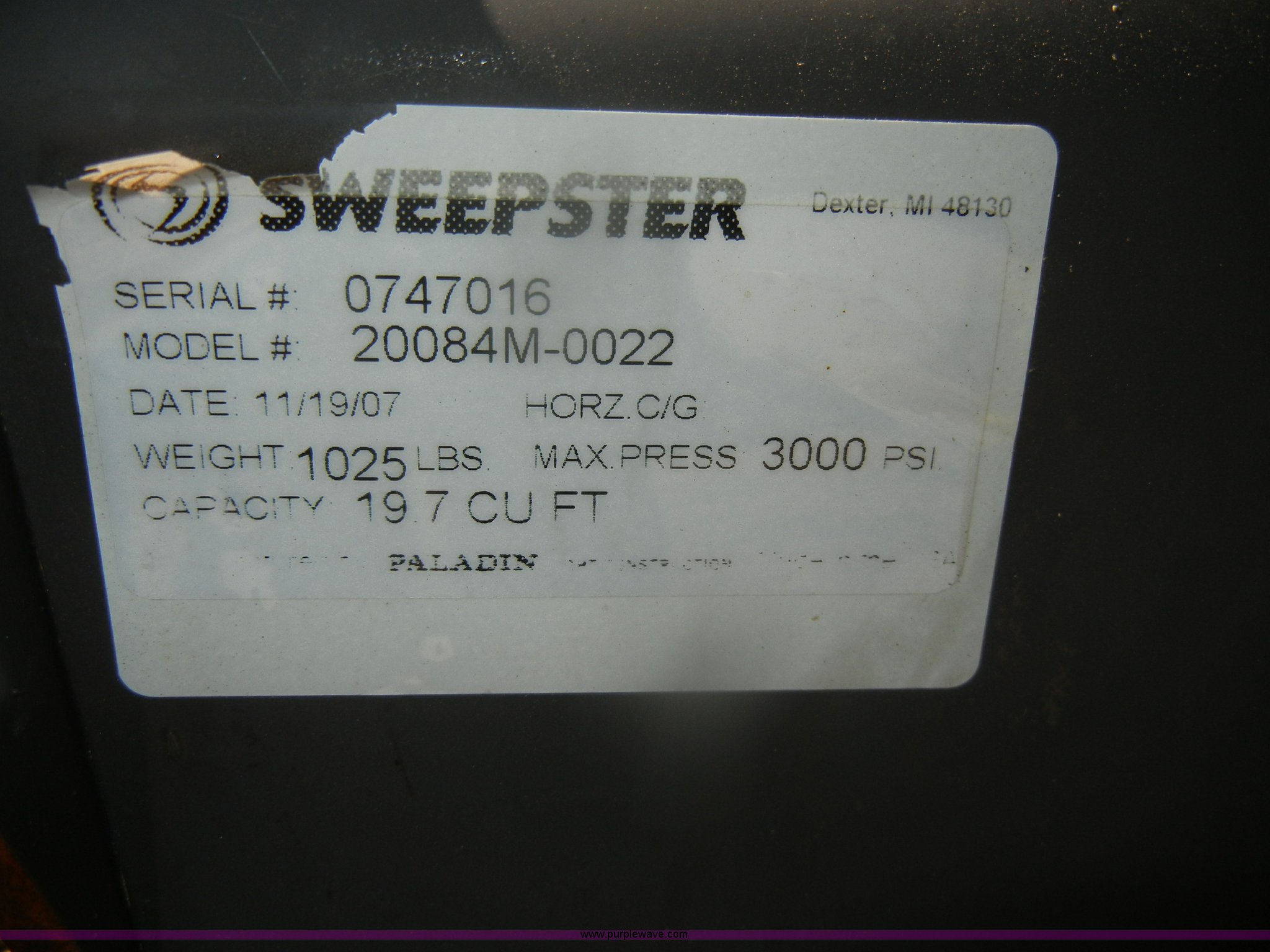 Purple Wave is selling a used Other Attach. or Equip. in Missouri. This item is a 2007 Sweepster skid steer attachment with the following: Model 20084M-0022, 3,000 psi, 19.7 cu. ft. capacity, Hydraulic hookups, 7'W x 4'D, Serial 0747016