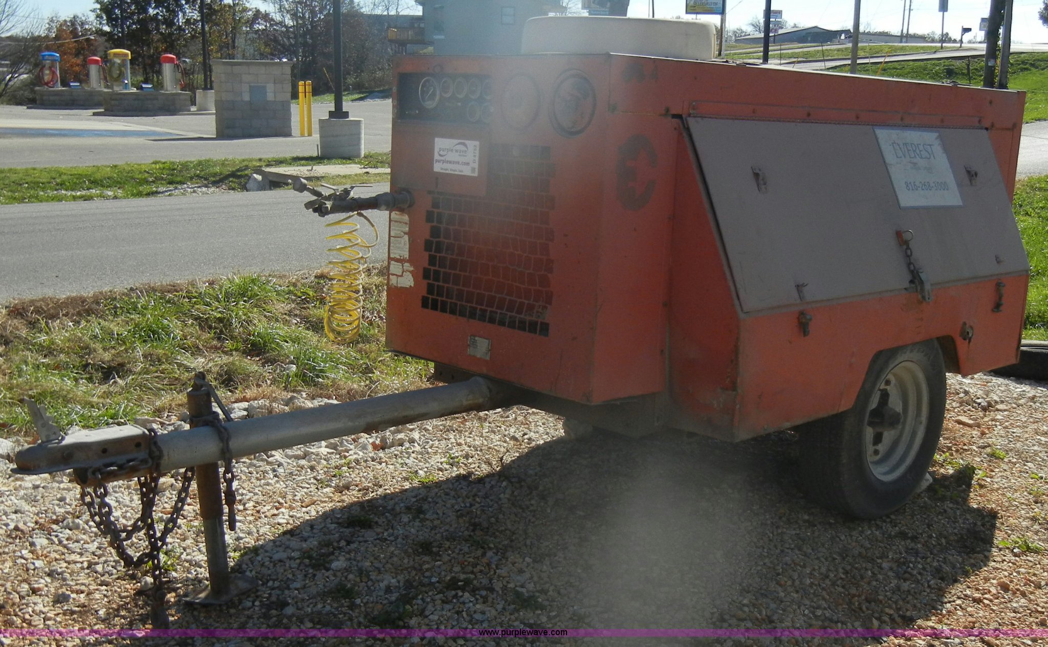 Purple Wave is selling a used Air Compressor in Missouri. This item is a 1986 Sullivan air compressor with the following: 3,014 hours on meter, Model D0185Q421C1EA, John Deere diesel engine, Serial CD4239D673971, Type 4239DF, 185 CFM, 175 psi, 2" ball, Chains and jack, 215/75R15 tires, Rust, Serial 204085