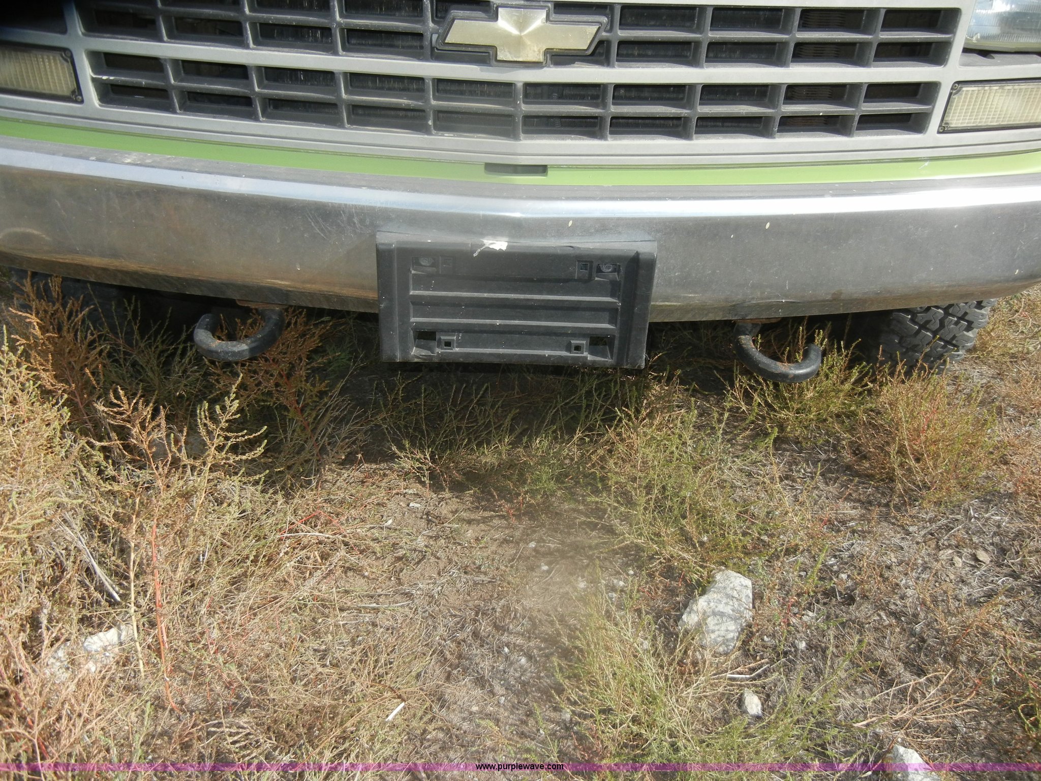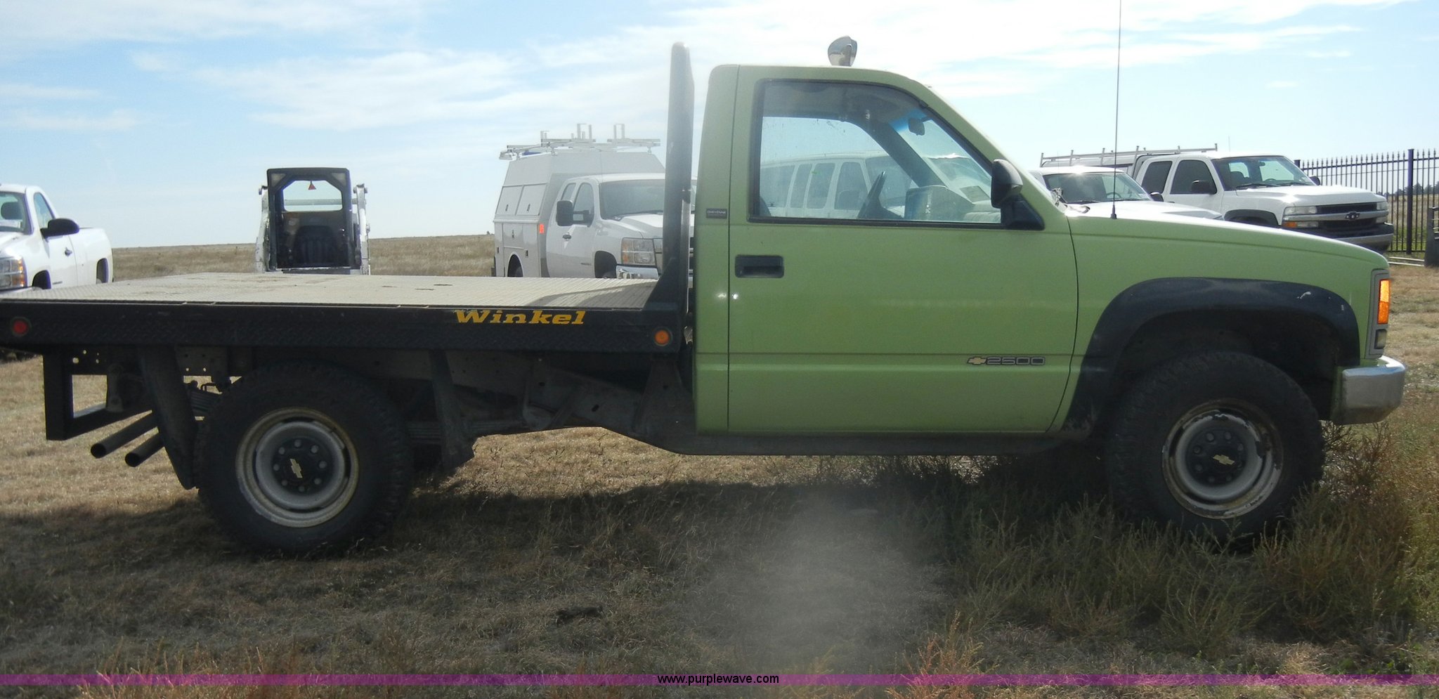 Purple Wave is selling a used Passenger Vehicle in Kansas. This item is a 1992 Chevrolet Cheyenne K2500 flatbed pickup truck with the following: 93,246 miles on odometer, 5.7L V8 gas engine, Five speed manual transmission, Four wheel drive, AC and heat, AM/FM, Manual windows and locks, Vinyl interior, Seat cover, Winkel flatbed, 8' x 80", Side slots for rails, Front tow hooks, Spotlight on hood, Trailer wiring, 245/75R16 tires, Exterior cosmetic damage, Unit# 40