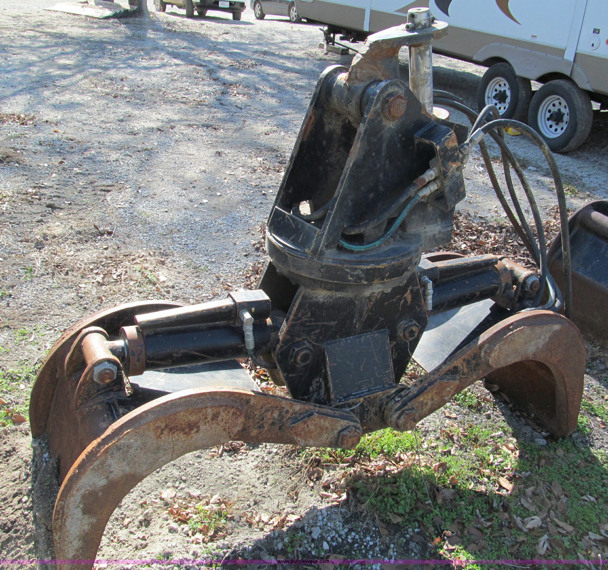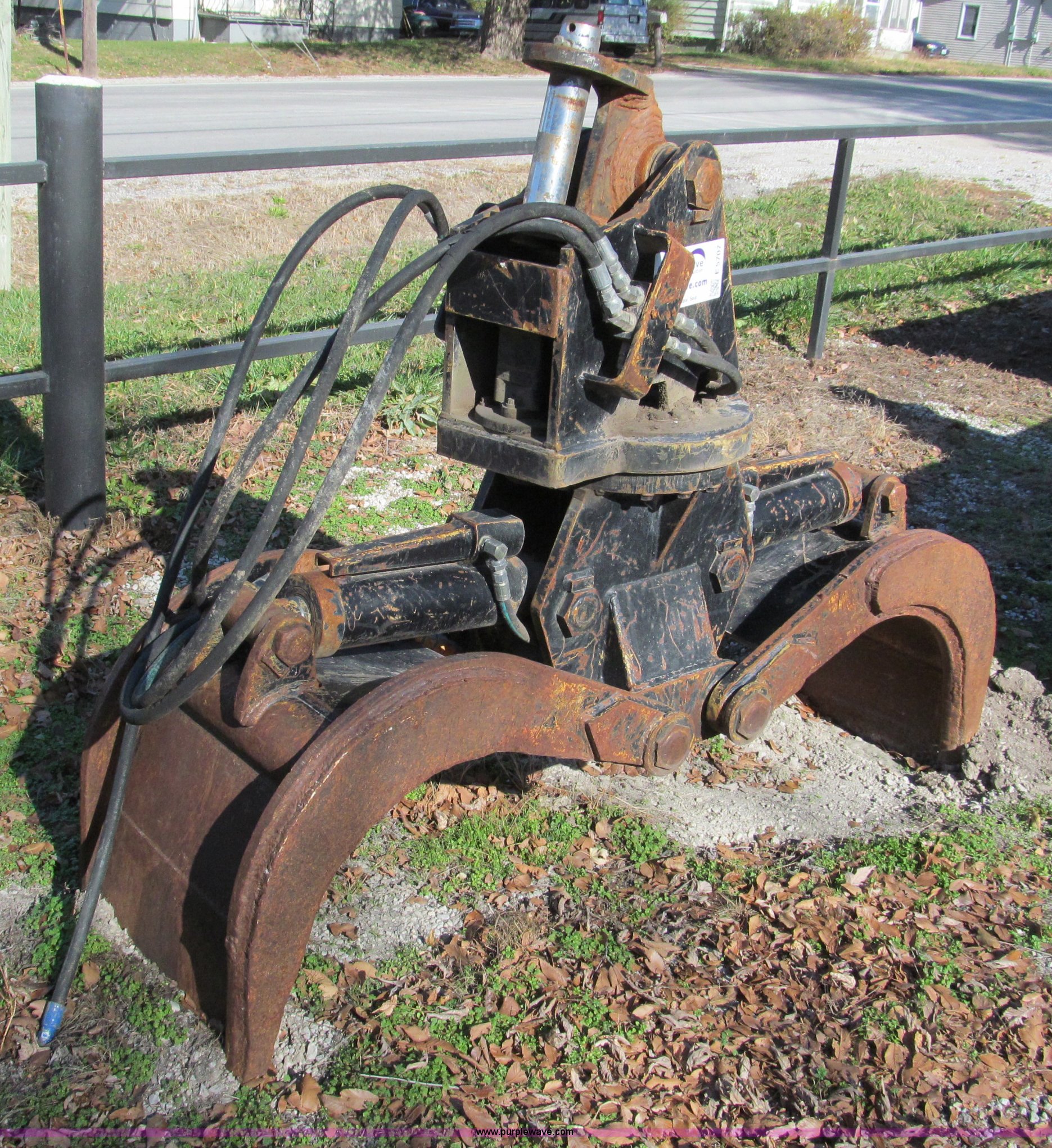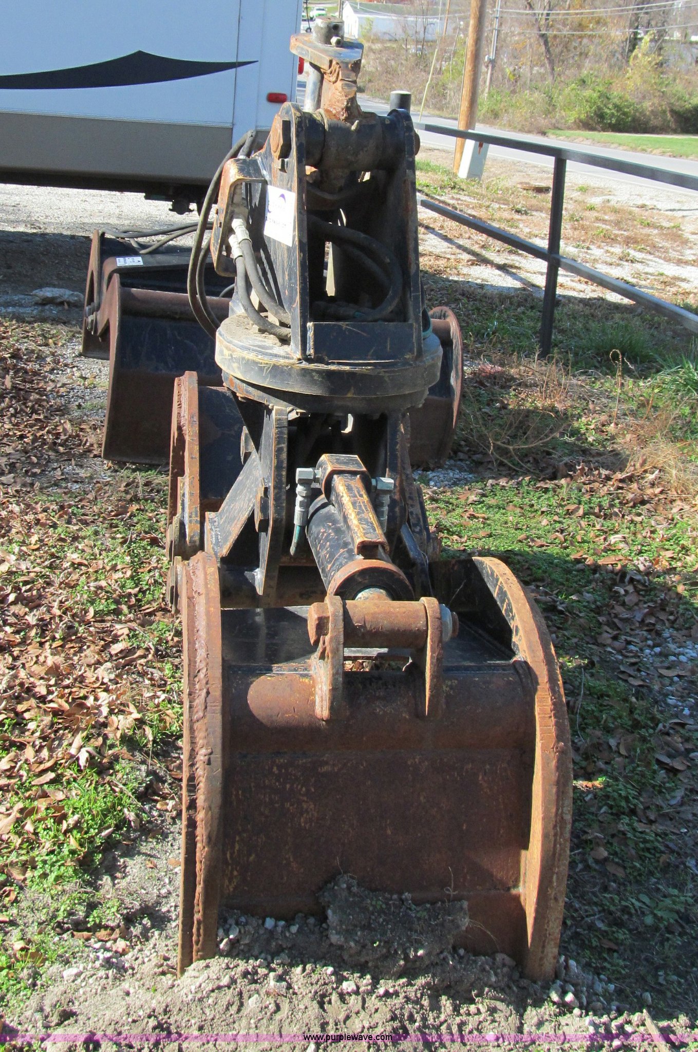 Purple Wave is selling a used Excavator Attach. in Missouri. This item is a 24" hood butt type grapple with the following: Continuous rotation, Flat faced fittings, Last used on Caterpillar 312 excavator