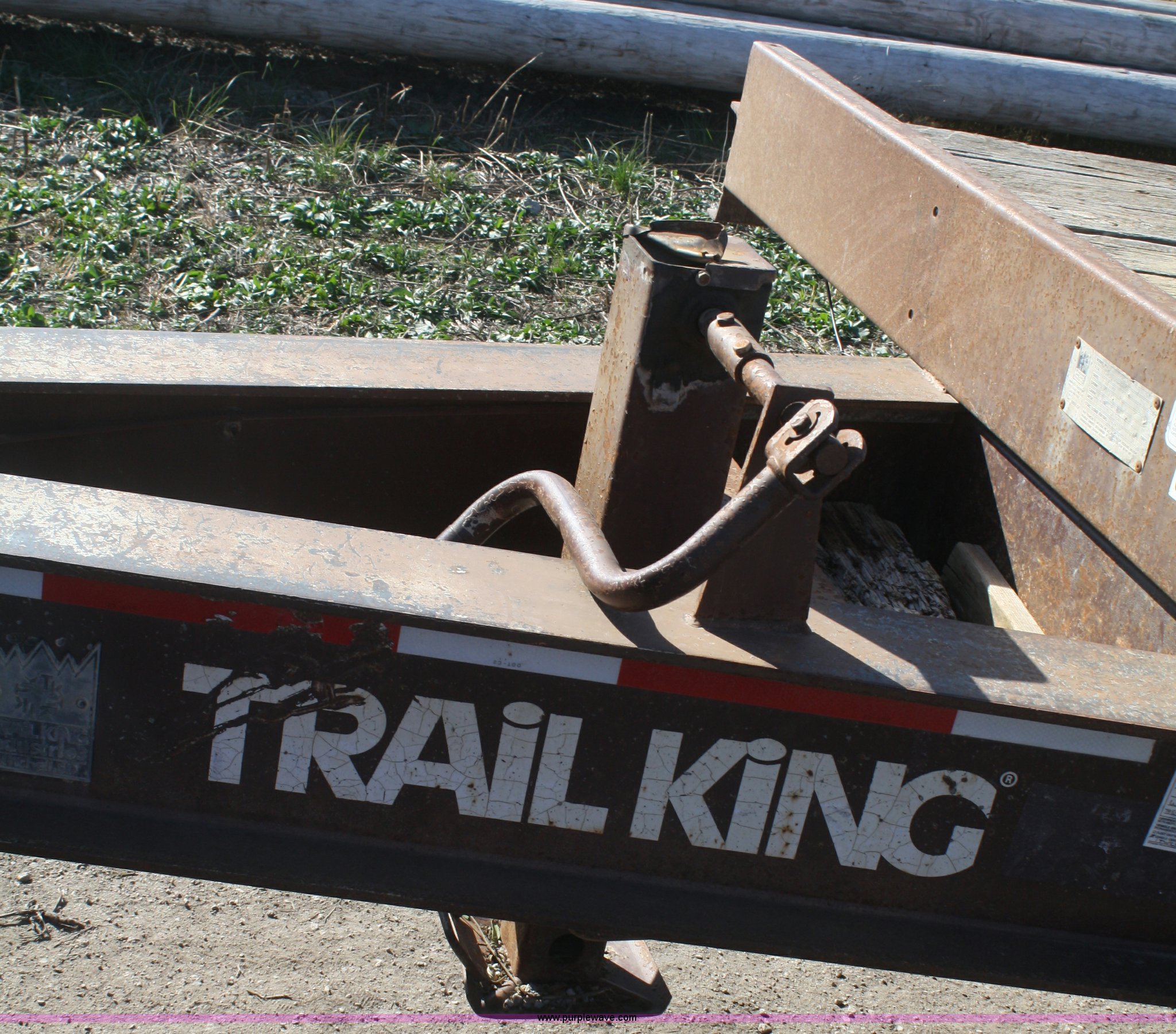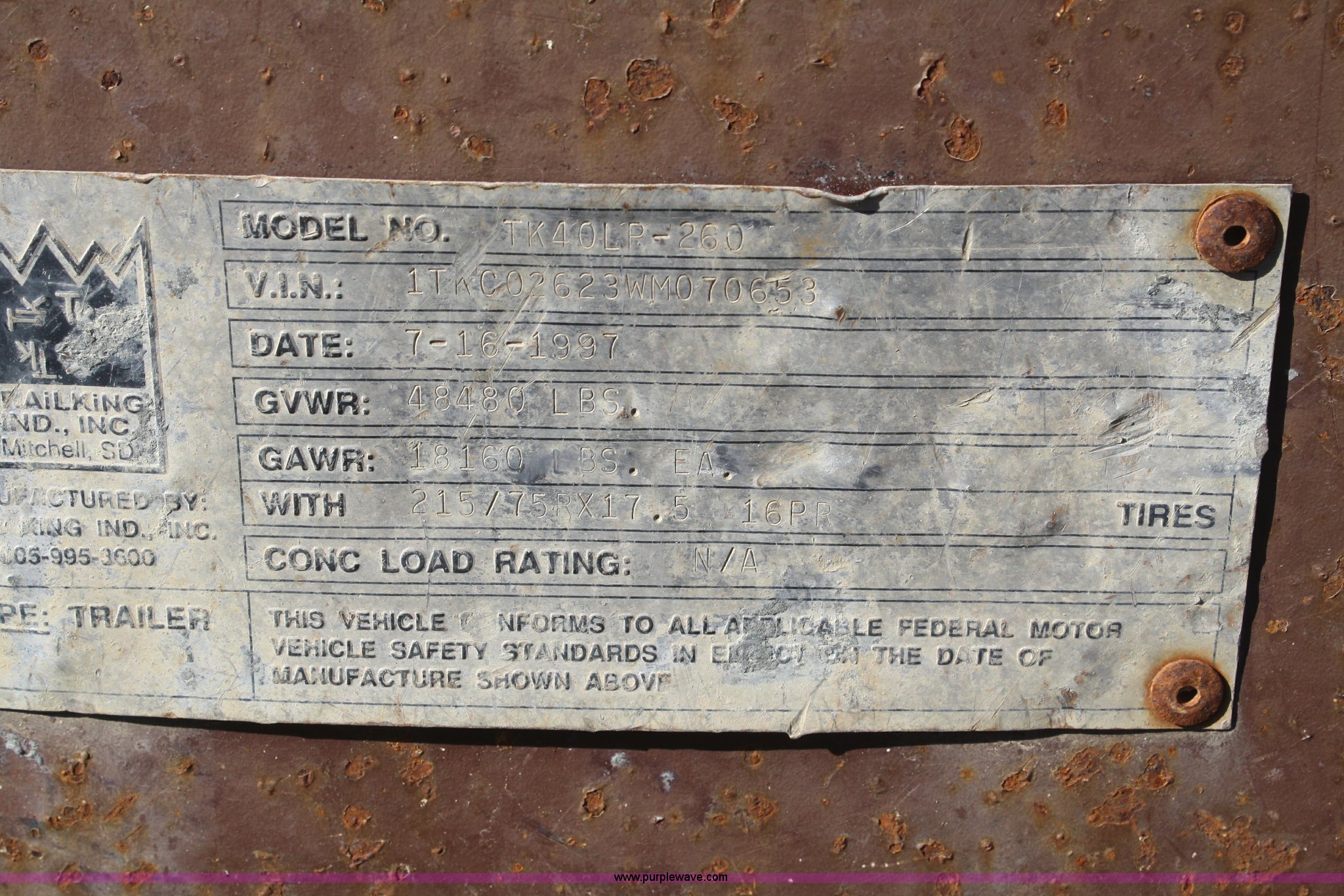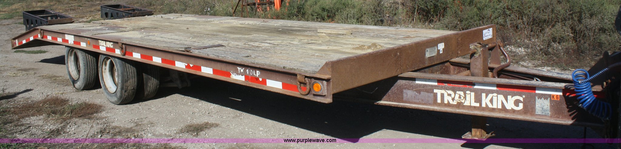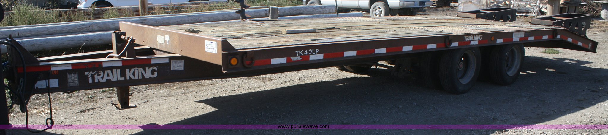Purple Wave is selling a used Flat or Drop Deck Trailer in Kansas. This item is a 1998 Trail King TK40LP-260 flatbed trailer with the following: 26'L overall, 21'L x 102"W deck, 5' dovetail, 5' ramps, Air brakes, Pintle hitch, Single pedestal jack stand, 215/75R17.5 tires, GVWR 48,480 lbs, GAWR 18,160 lbs