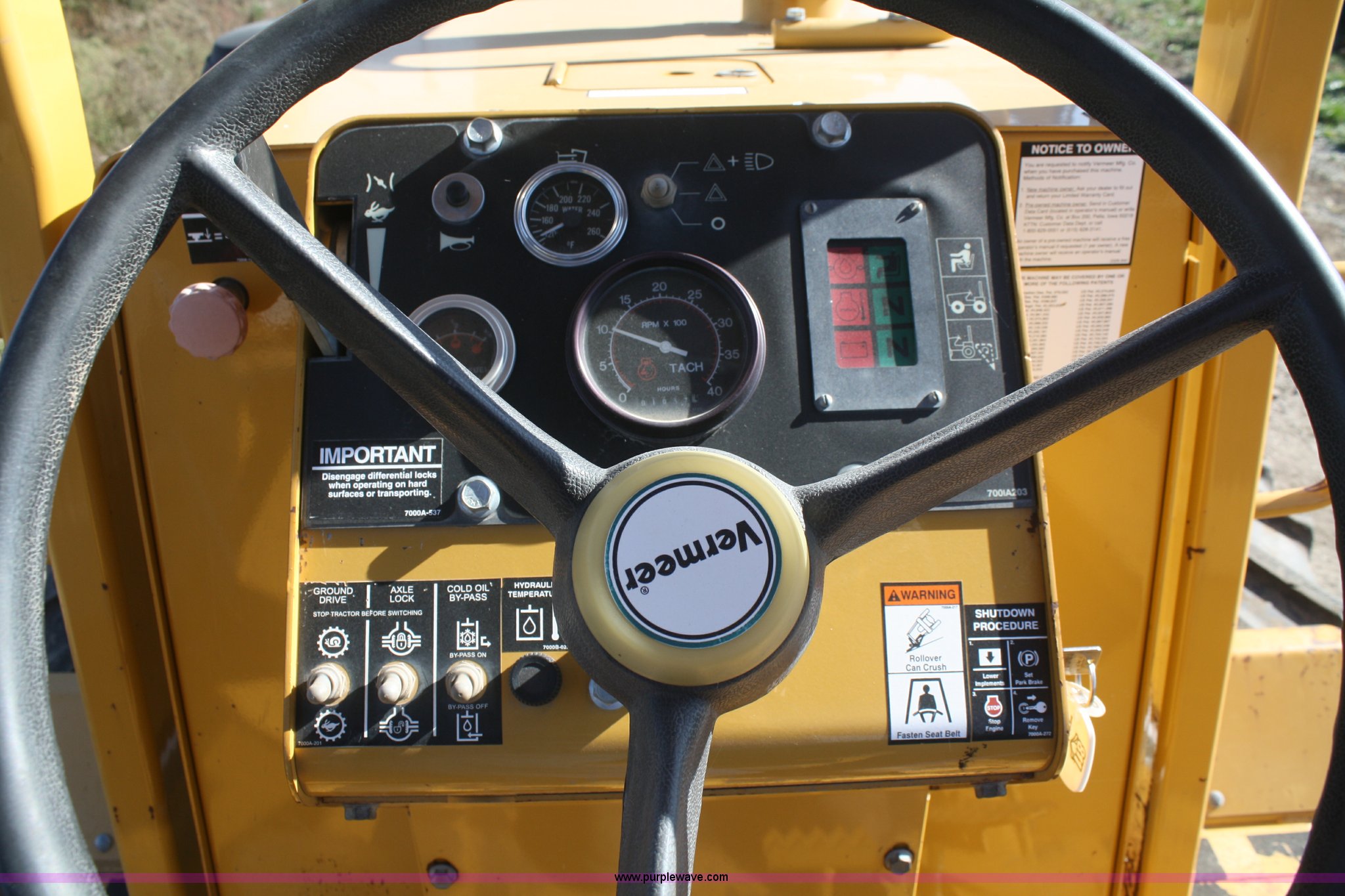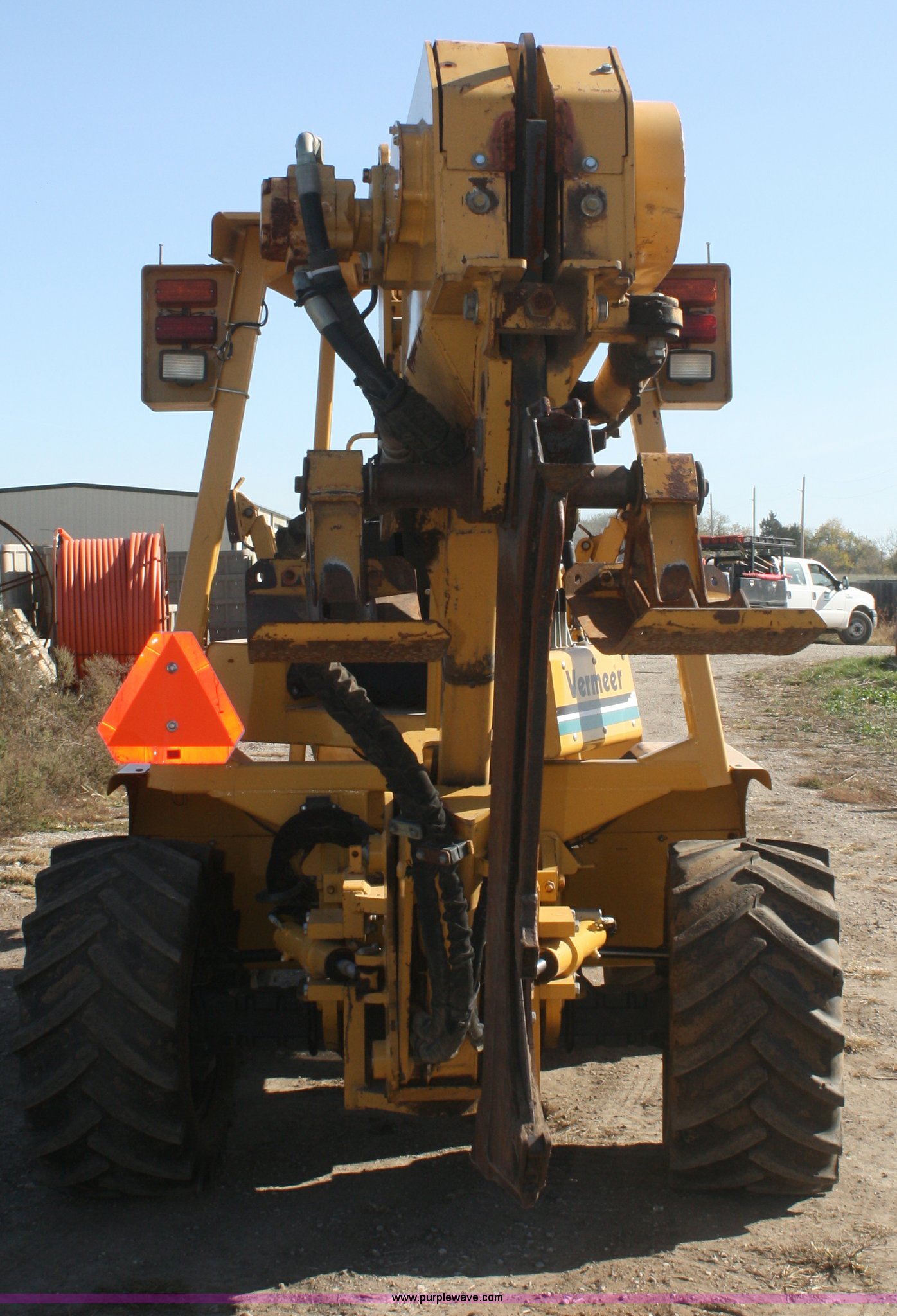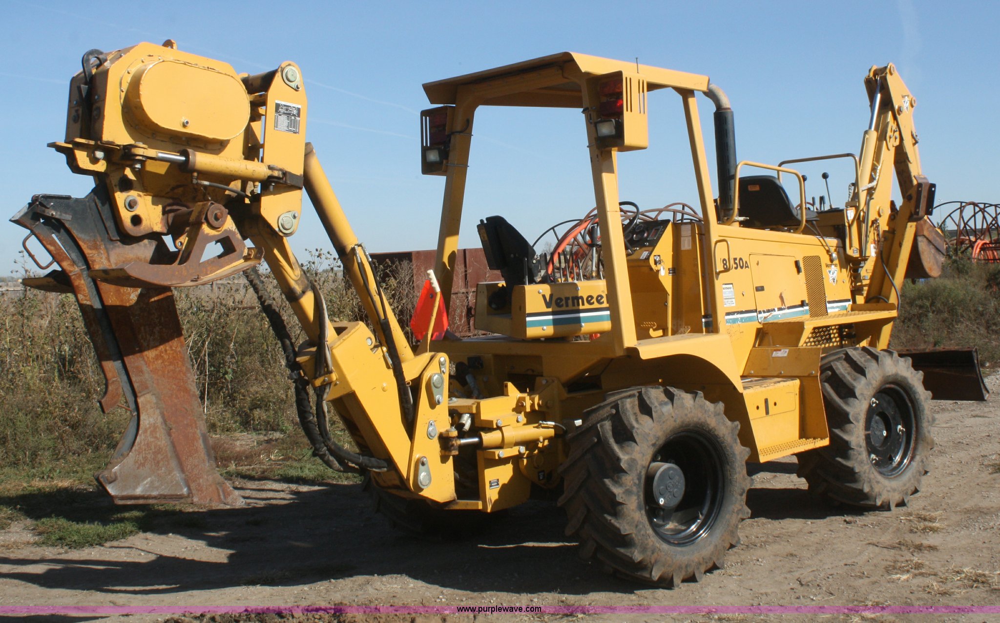 Purple Wave is selling a used Cable Plow in Kansas. This item is a Vermeer V8550A cable plow with the following: 1,937 hours on meter, Cummins 4BT55 four cylinder 95 HP diesel engine, Two speed ground drive, Four wheel drive, Canopy, Power seat swivel, Four wheel steering, VP8550 vibratory plow, Serial 1VPS060A721000398, 36" plow depth, Hydraulic swing, angle, steer, and lift, B930 backhoe, Serial 1VRS1005121000751, 48" stick, 18" four tooth bucket, Out riggers, Remote throttle and ground control, 80" six way blade, Joystick control, Serial 1VRT112P321000906