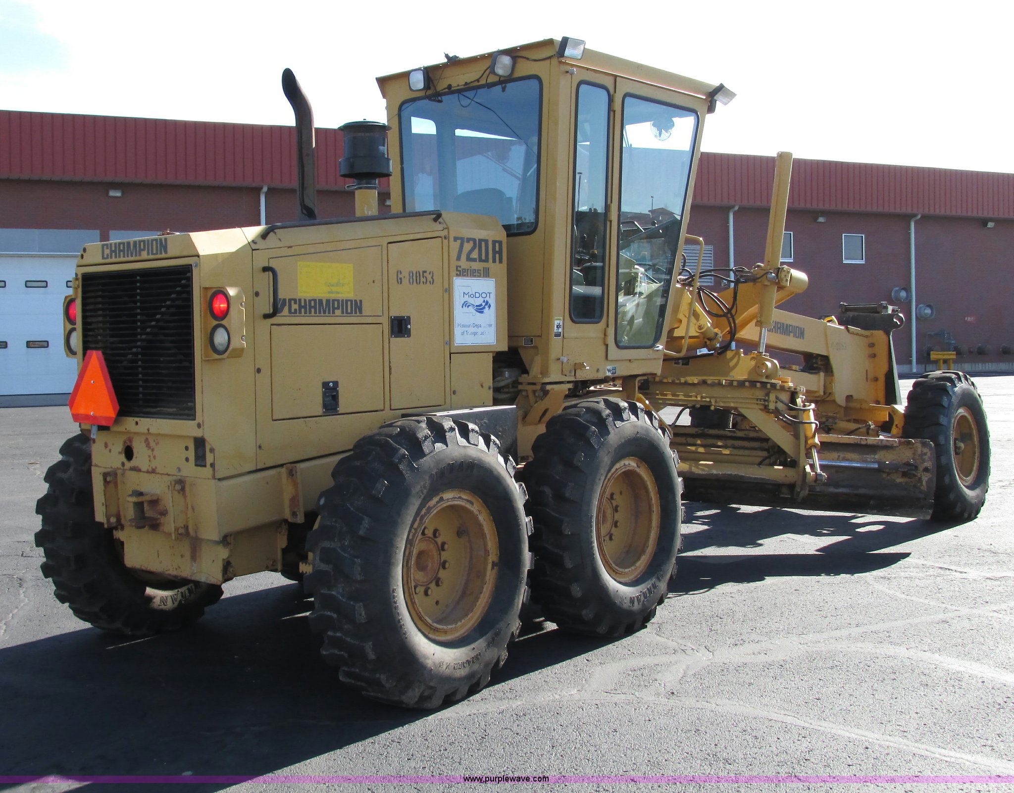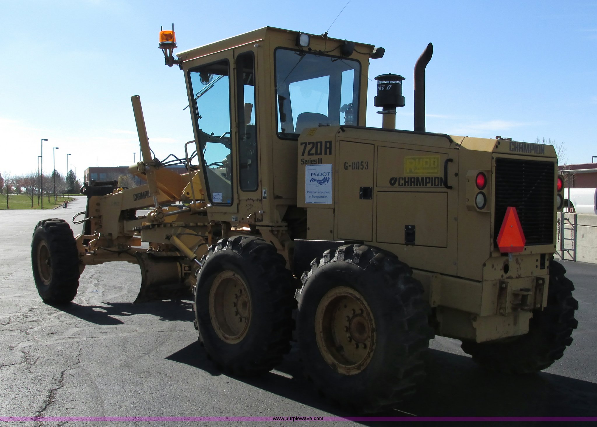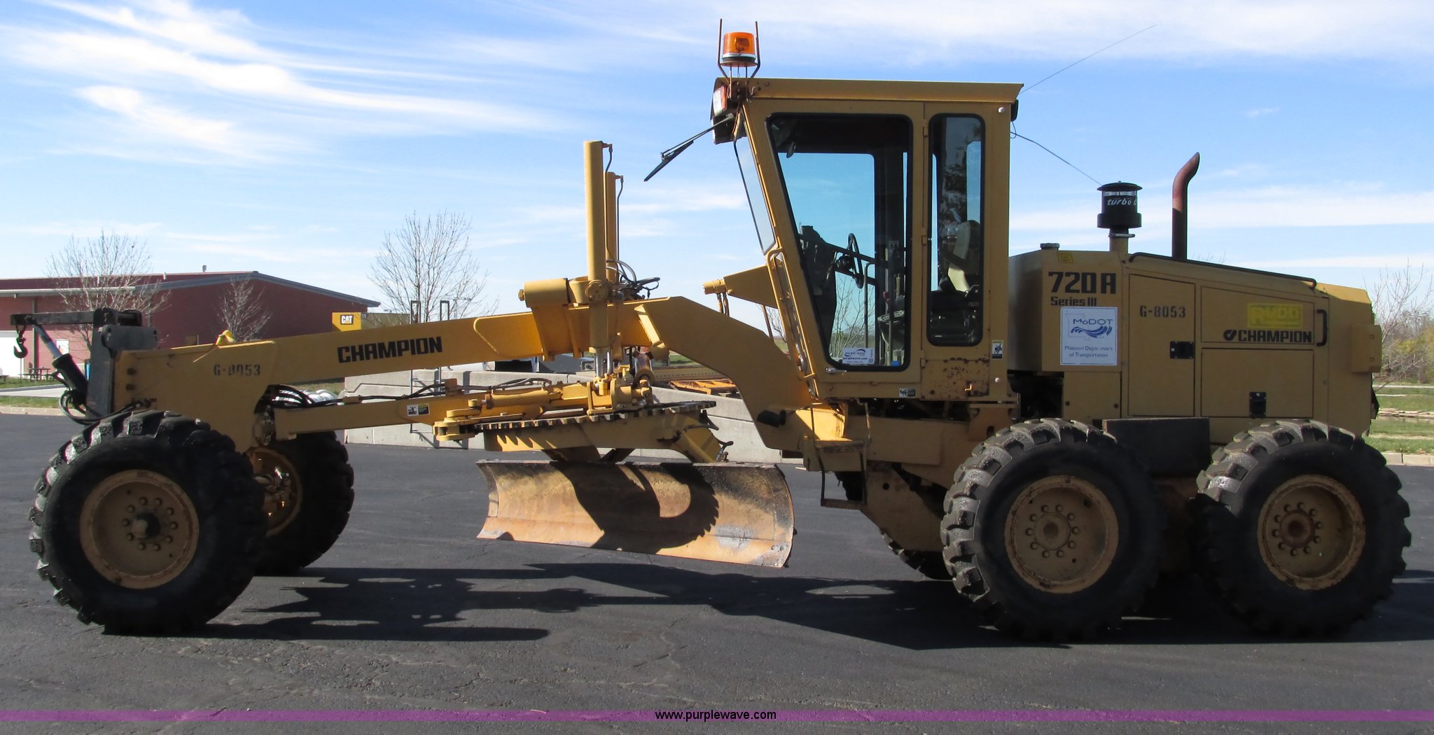 Purple Wave is selling a used Motor Grader in Missouri. This item is a 1994 Champion 720A Series III articulated motor grader with the following: 3,886 hours on meter, Cummins 8.3L six cylinder diesel engine, Powershift transmission, 8F-4R gears, Four wheel drive, Heat, Suspension seat, EROPS, High cab profile, Front and rear work lights, 12' moldboard, Side shift, Tip control, 11' wing plow with mounting brackets and hydraulics, Front mounted lift group, (6) blade control valves, Roof mounted amber beacon light, Rear pin hitch, 14.00-24 tires