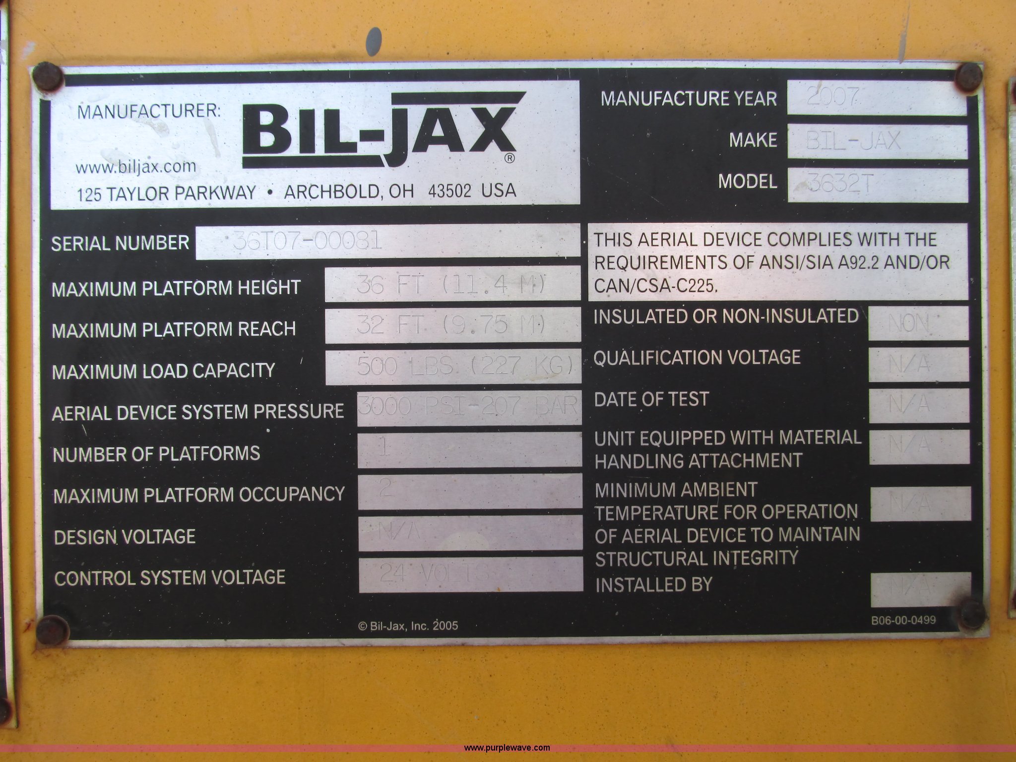 2007 Bil-jax 3632T pull behind man lift has sold in O'Fallen, Missouri for $14300. Item F4029 sold on November 29th, 2012.