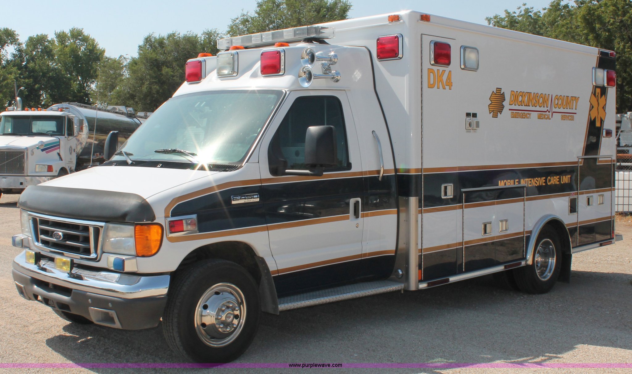Purple Wave is selling a used Fire Truck or Emergency Vehicle in Kansas. This item is a 2006 Ford Medtec E450 ambulance with the following: 78,080 actual miles, 6.0L V8 diesel engine, 325 HP, Automatic transmission, AC and heat, Tilt, Cruise, AM/FM/CD, Power windows, locks, and mirrors, Cloth interior, Medtec ambulance box, Medtec dash instruments, Auxiliary AC and heat, 215/85R16 tires, Engine blow-by
