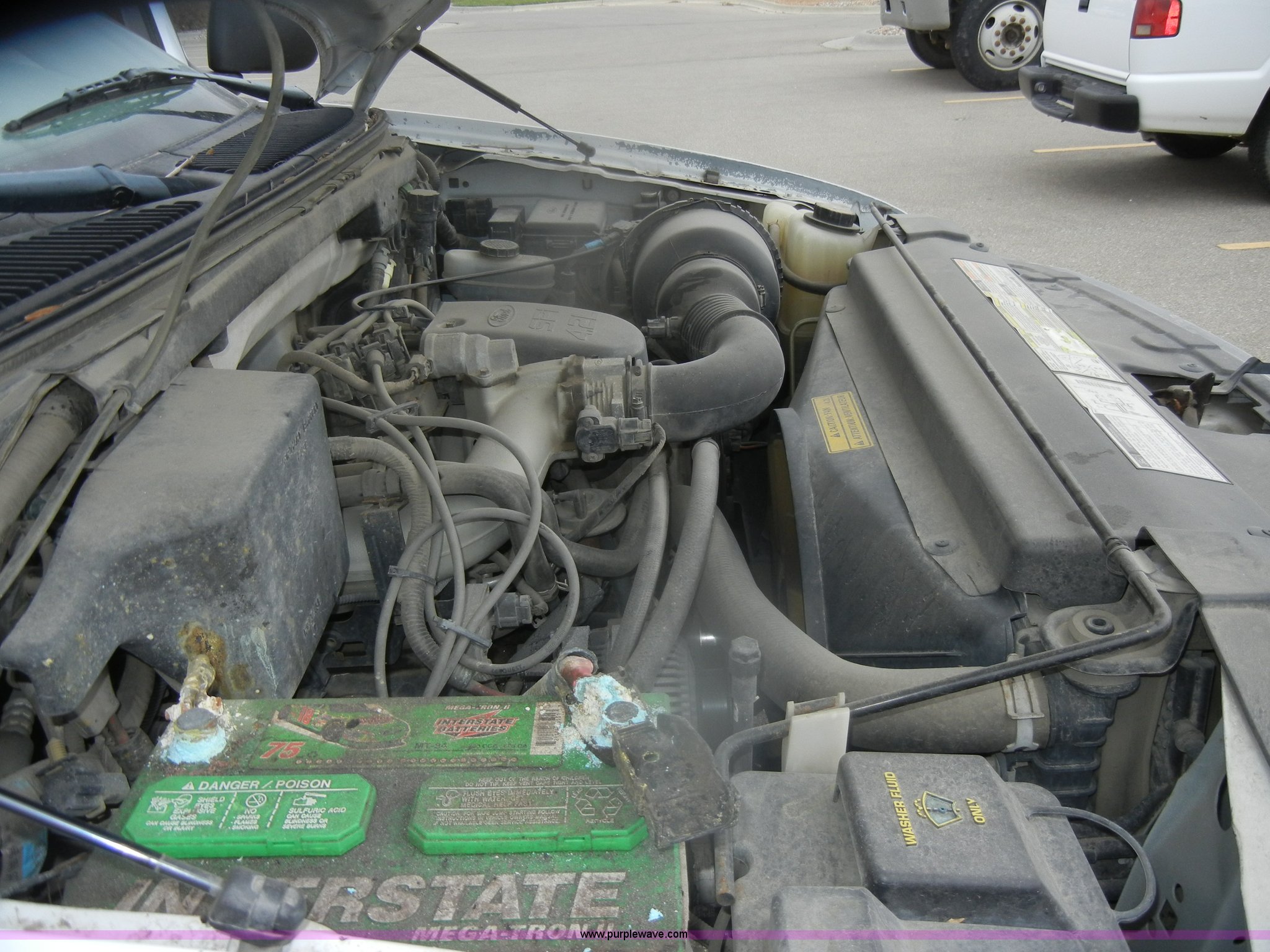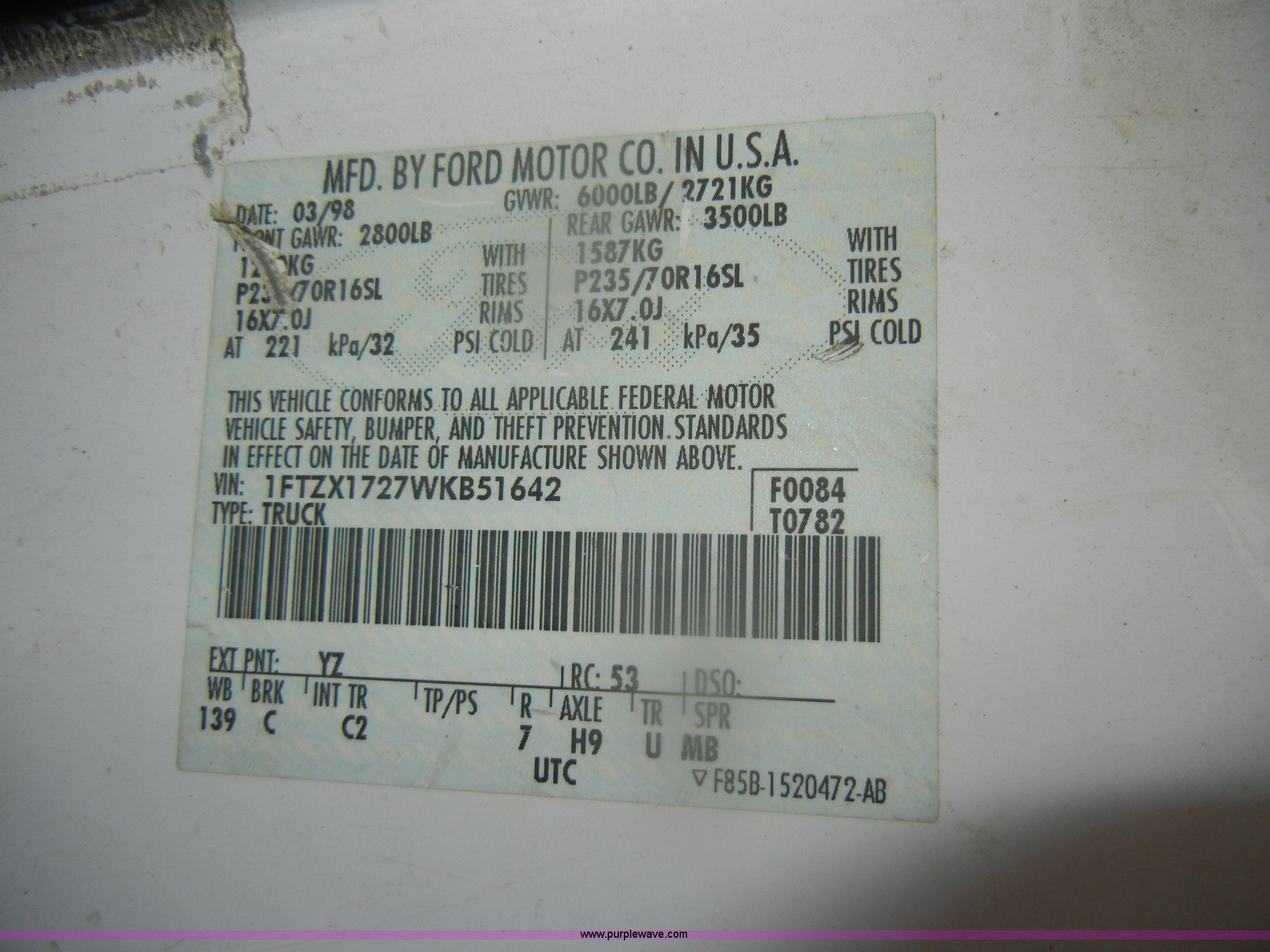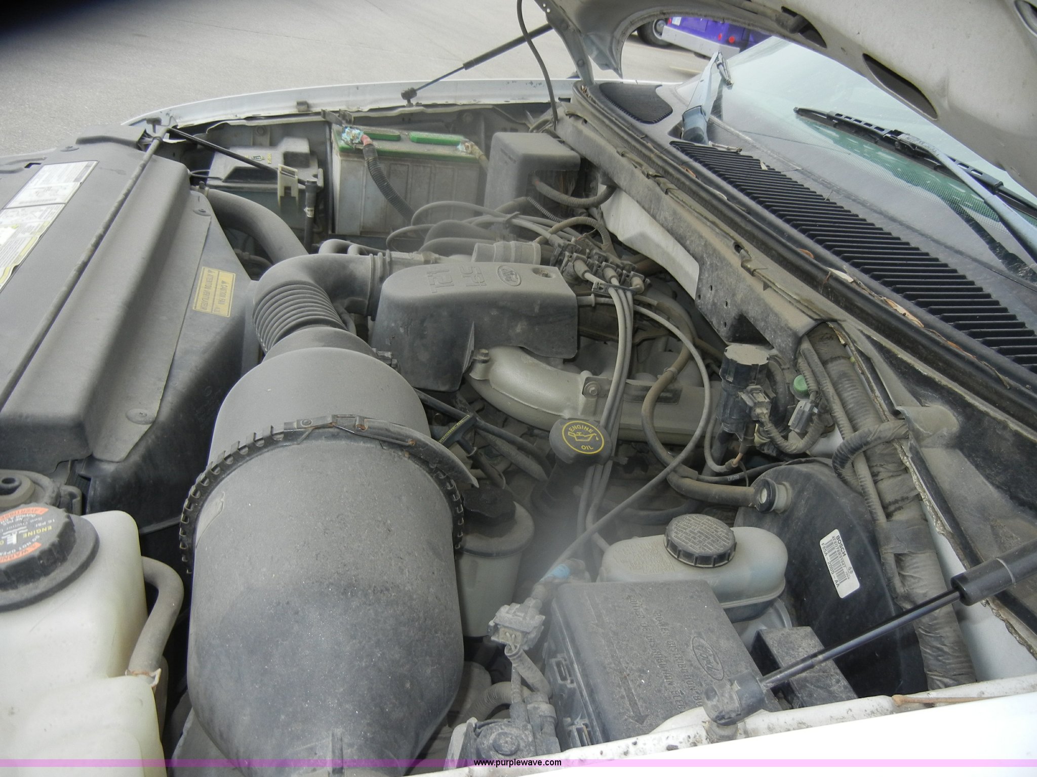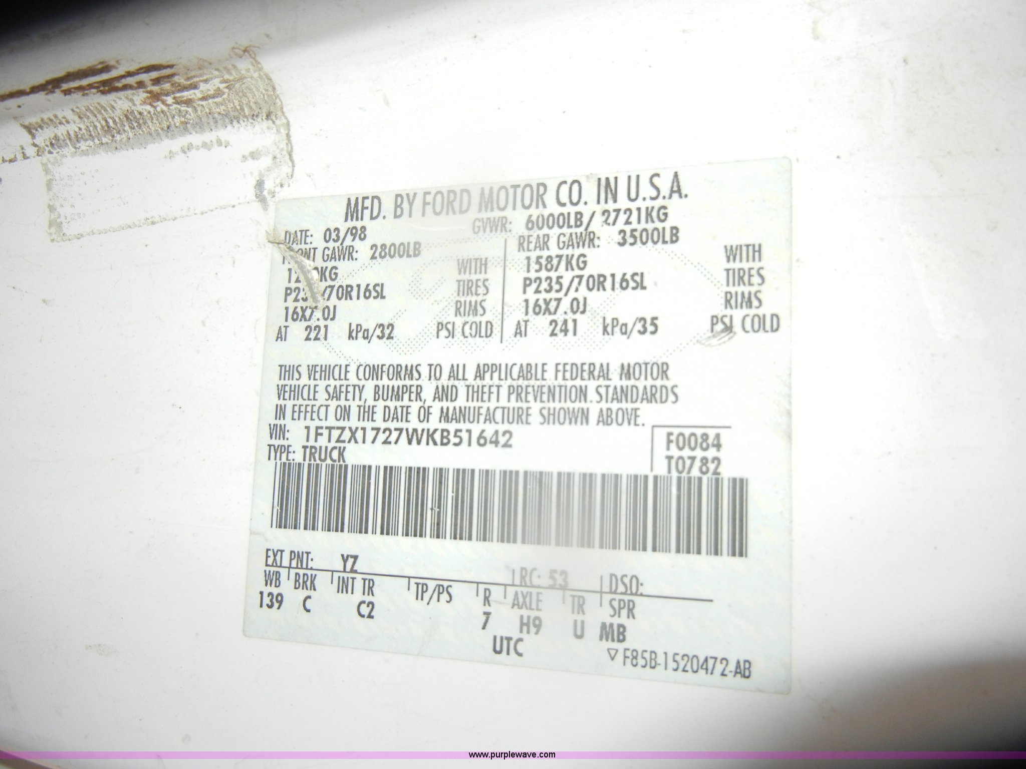 Purple Wave is selling a used Passenger Vehicle in Kansas. This item is a 1998 Ford F150 SuperCab pickup truck with the following: 148,501 miles on odometer, 4.2L V6 SPI gas engine, Automatic transmission, AC and heat, Tilt, Cruise, AM/FM, Manual windows and locks, Cloth interior, Ball hitch, 225/75R16 tires, Interior/exterior cosmetic damage, Rust, Dead battery, Check engine and ABS lights on