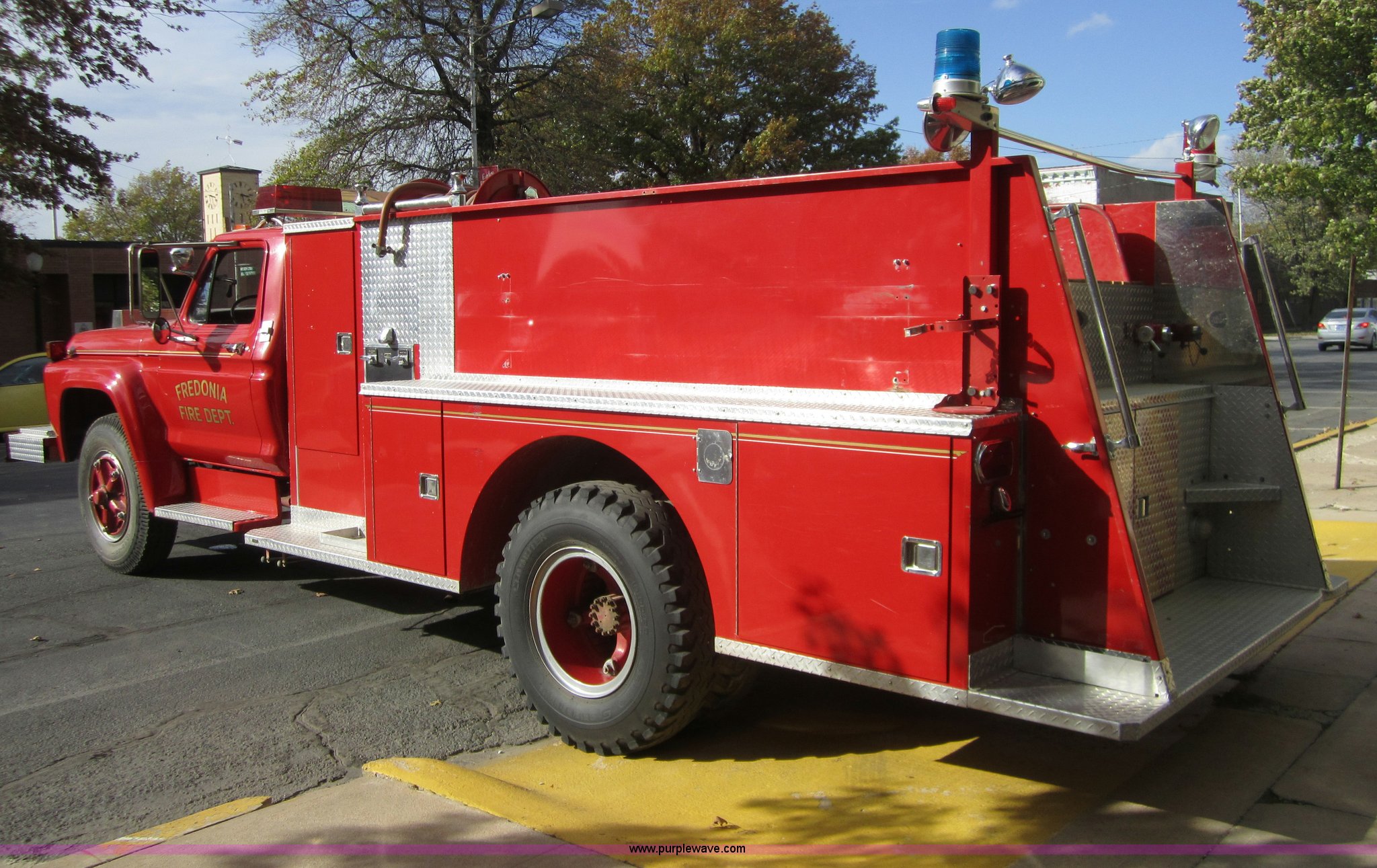 1977 Ford F756 fire truck. 8,032 miles on odometer Not Actual Mileage, Five speed manual transmission, Front mount pumper 750 GPM, 427 hours on meter, 750 gallon water tank, 4.5" intake, (3) 2.5" discharge lines, (2) rear discharge, 100' of 1" hose Hose reel, Plumbed for deck gun, Lights and siren included, 10.00-20 tires, Manufactured by Pierce. F75FV046096. Shipping quotes available. City of Fredonia. 422 N 7th. Fredonia, KS 66736