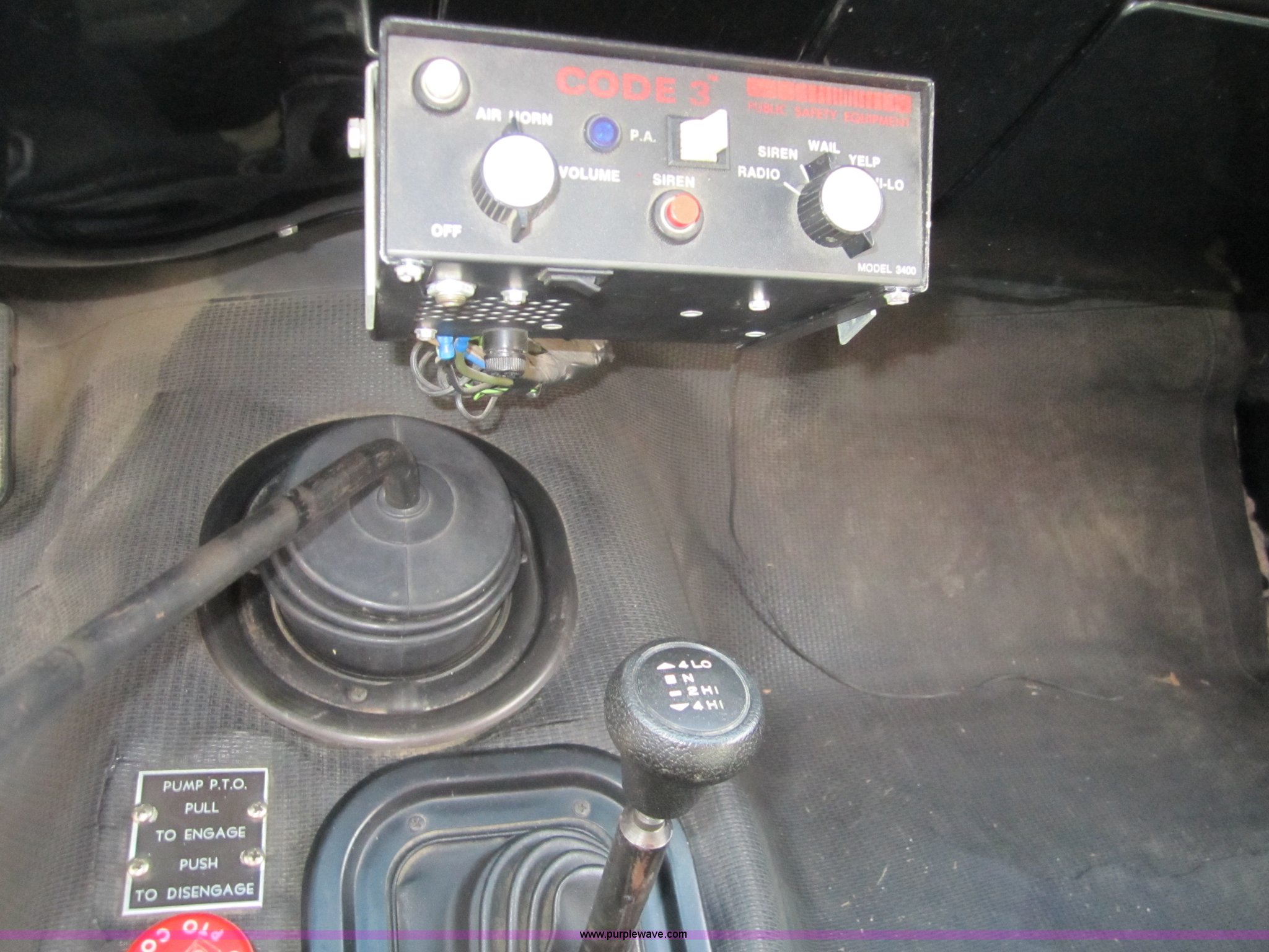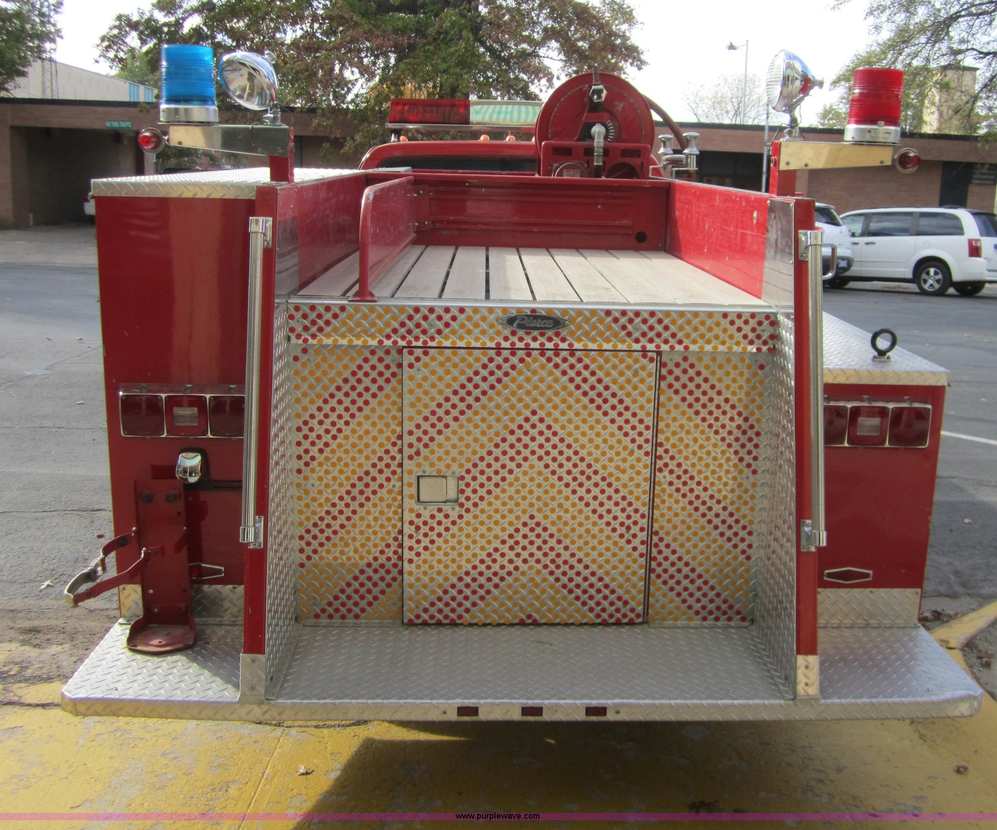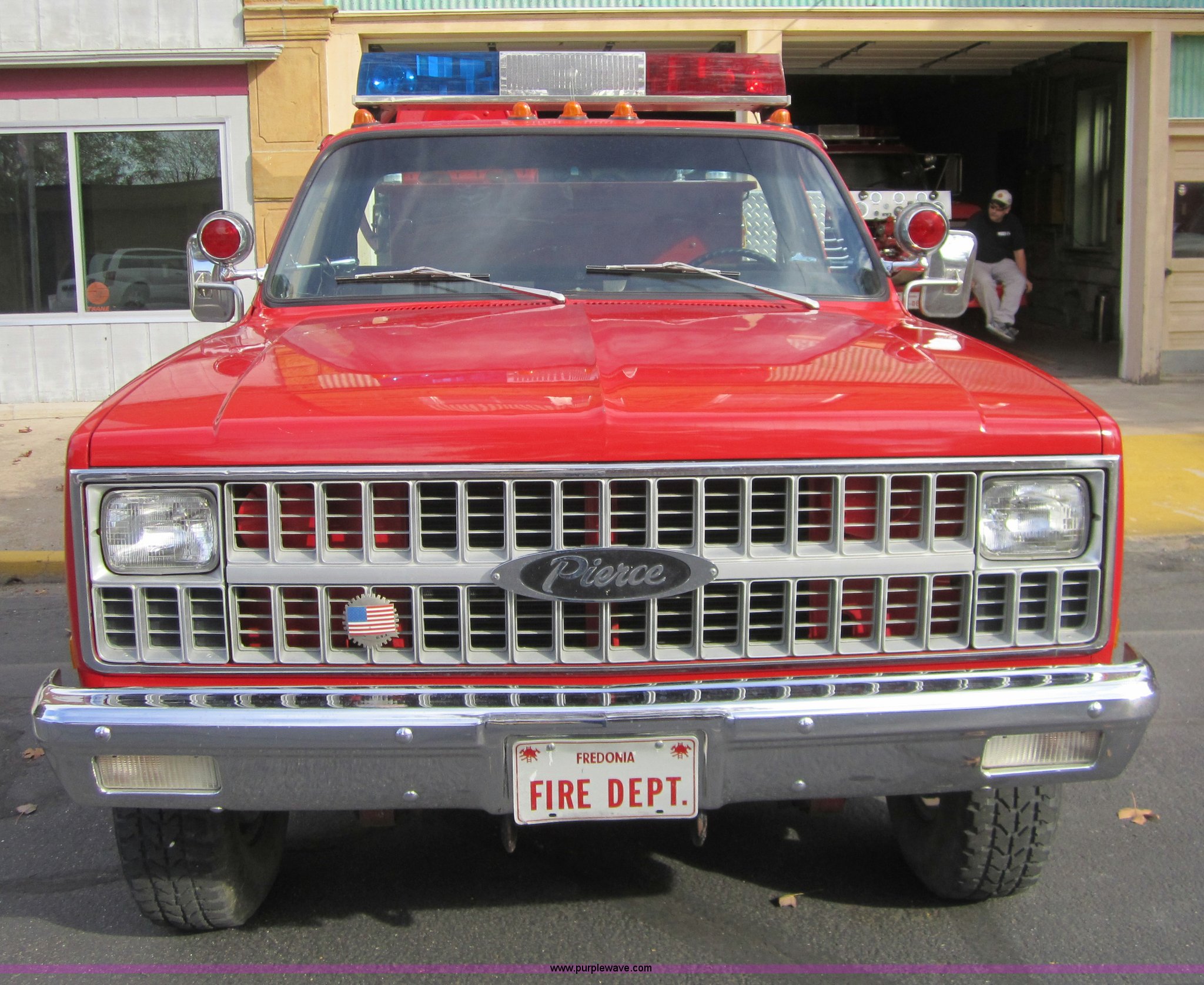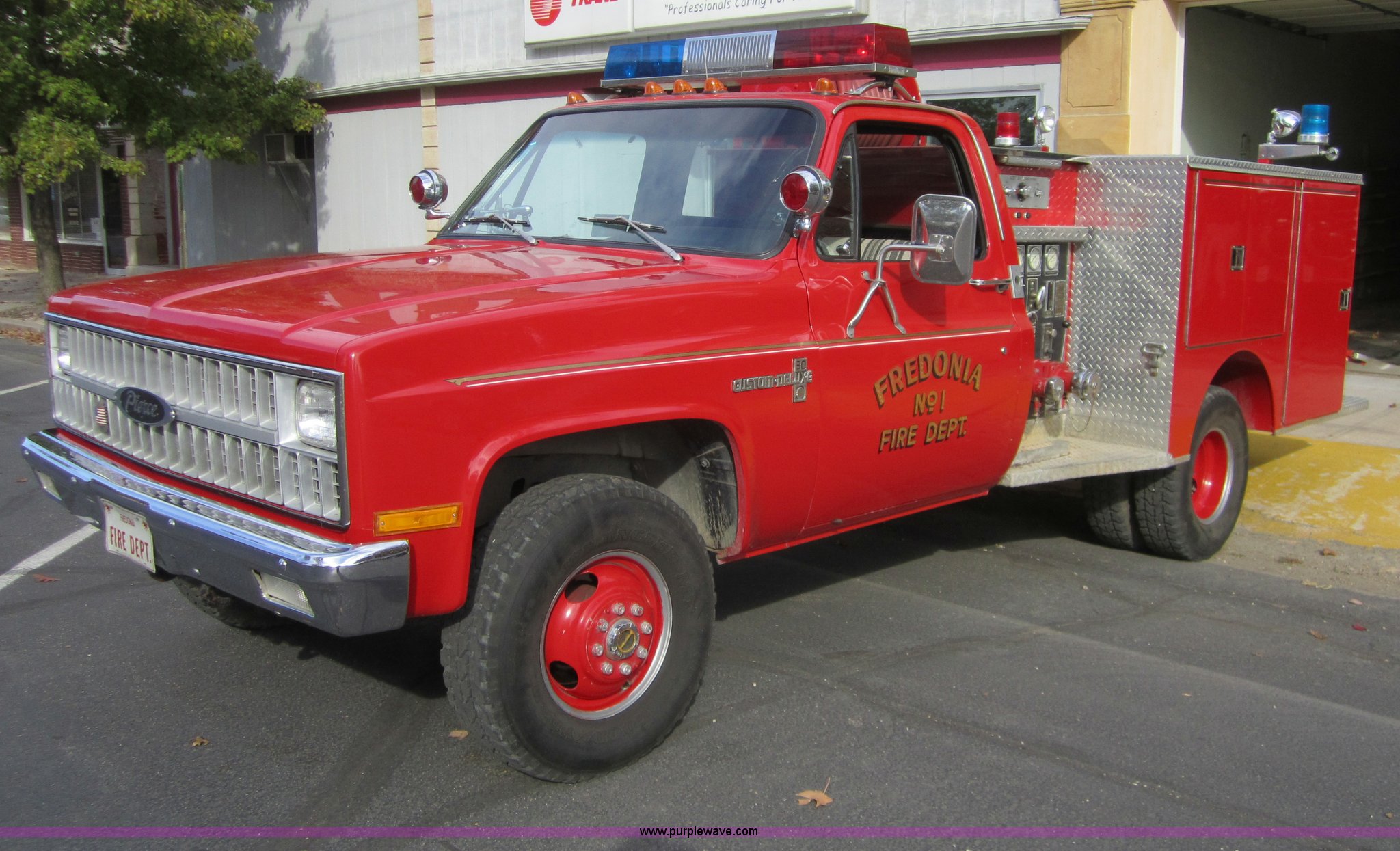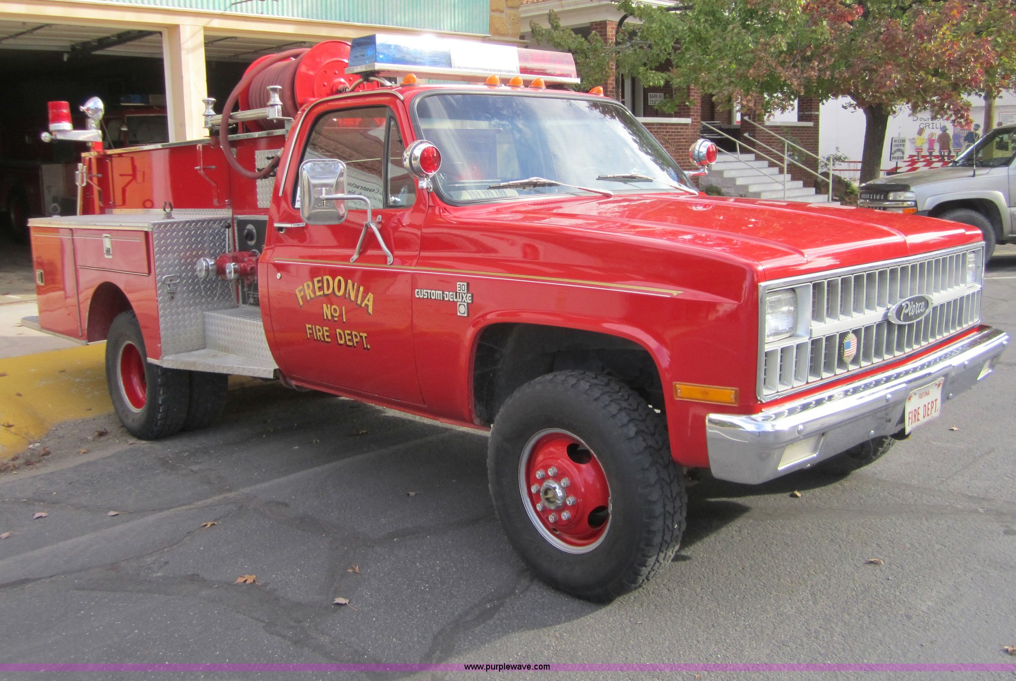Purple Wave is selling a used Fire Truck or Emergency Vehicle in Kansas. This item is a 1981 Chevrolet K30 fire truck with the following: 7,631 miles on odometer, V8 5.7L gas engine, Four wheel drive, PTO, Micro brake lock, Pierce body, 400 gpm pump, 250 gallon water tank, 3" intake, (2) 2.5" discharges, One rear, 100' of 1" hose, Hose reel, Lights and siren included, L235/85R16 tires, Cracked windshield