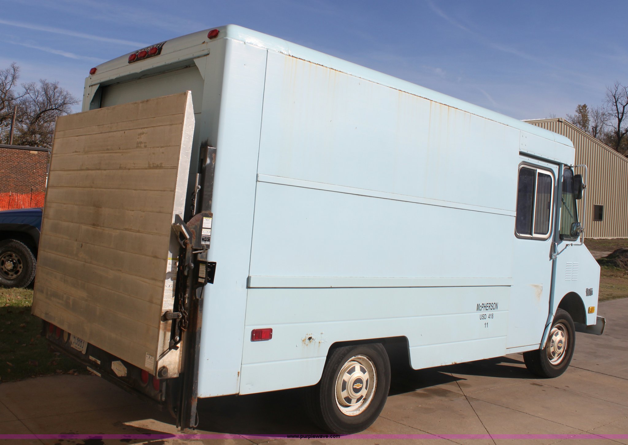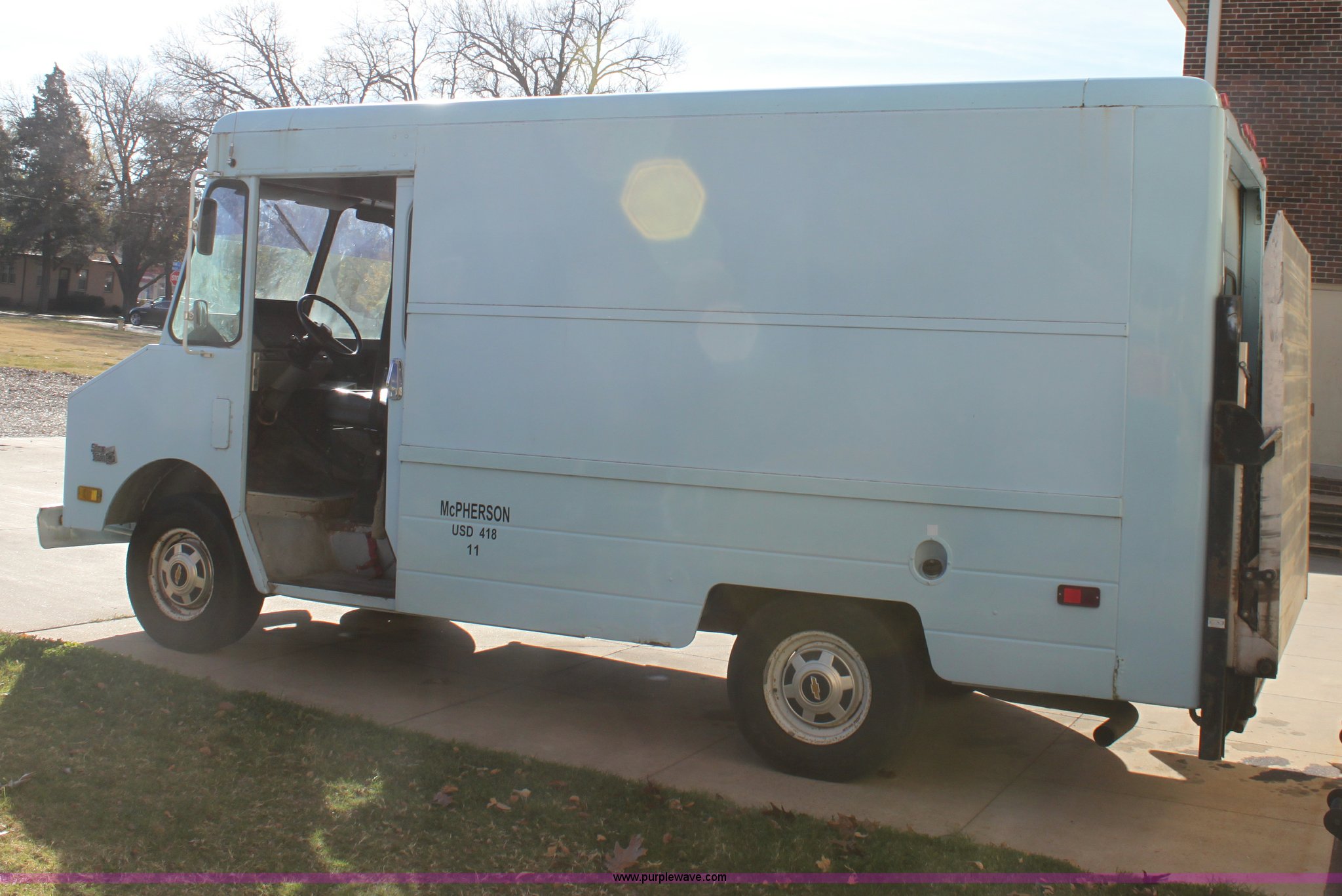 Purple Wave is selling a used Passenger Vehicle in Kansas. This item is a 1992 Chevrolet P30 step van with the following: 49,401 miles on odometer, 5.7L V8 gas engine, Automatic transmission, Heat, AM/FM/cassette, Manual windows and locks, Vinyl interior, Tommy gate 79A lift, Serial 17530R, 235/85R16 tires, Oil leaks, Needs exhaust and brakes