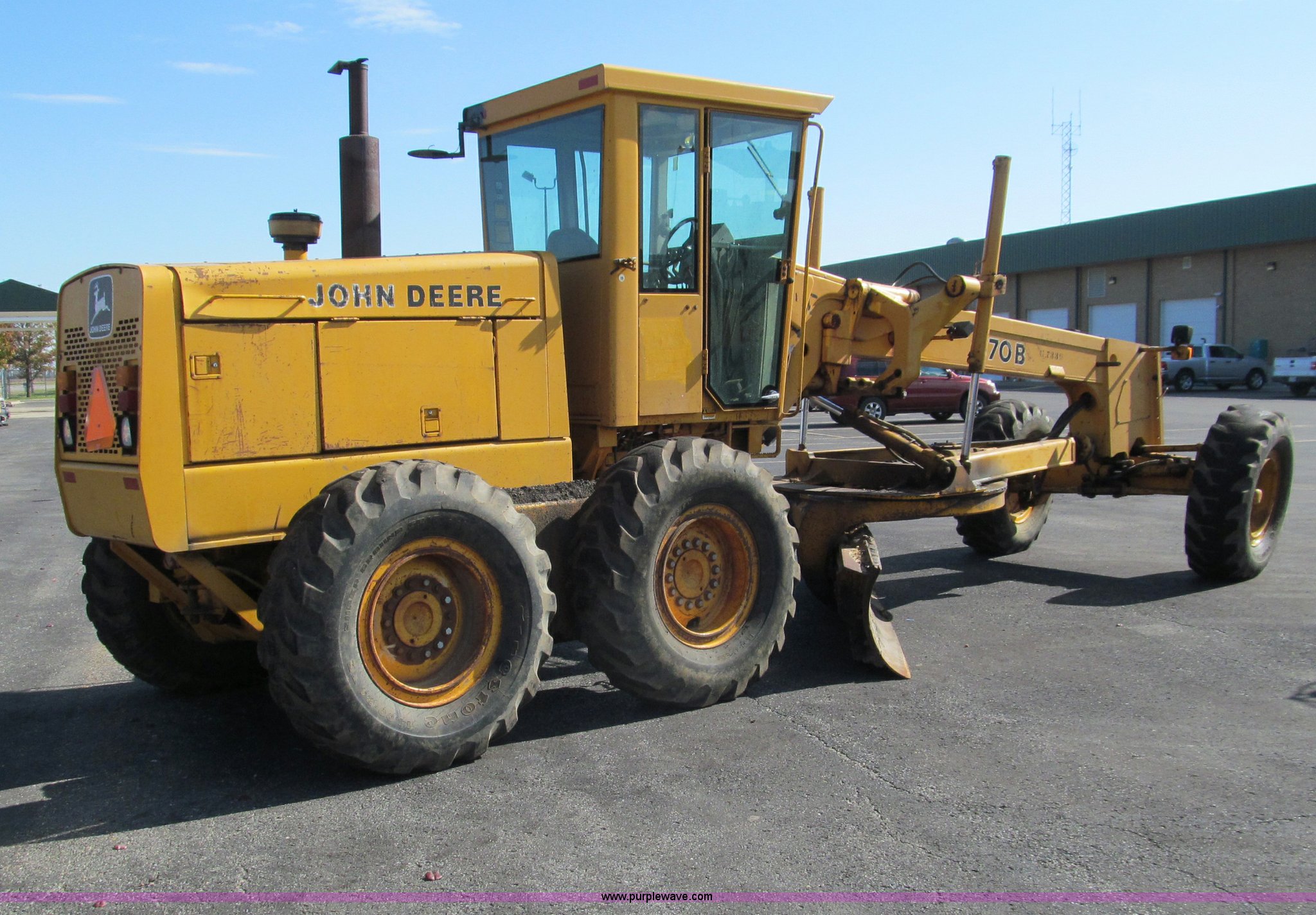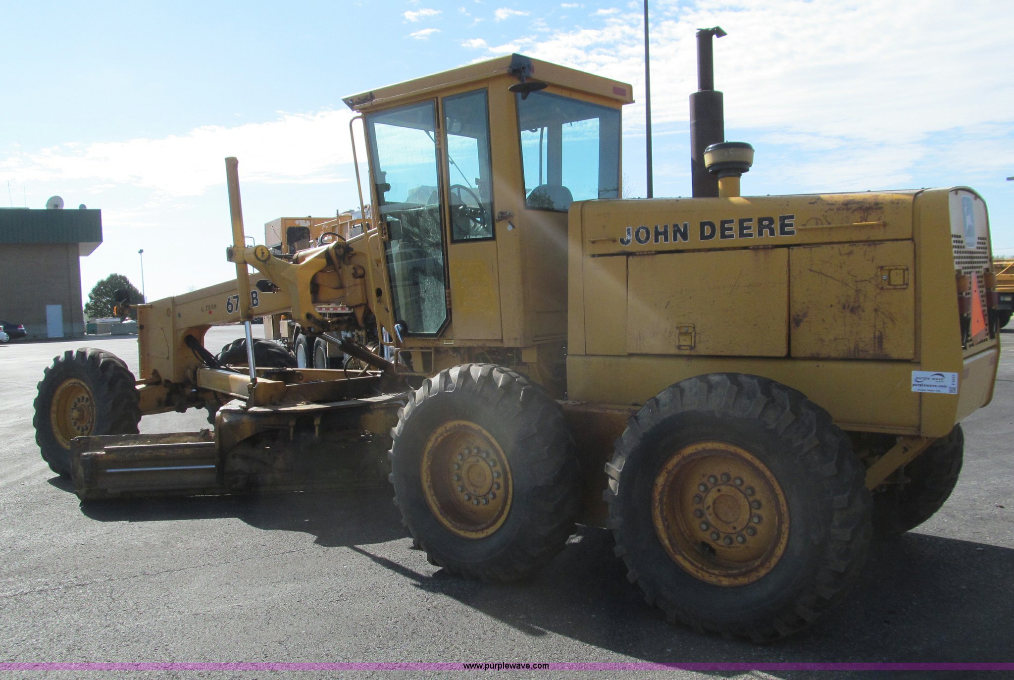 Purple Wave is selling a used Motor Grader in Missouri. This item is a 1989 John Deere 670B motor grader with the following: 11,090 hours on meter, John Deere six cylinder diesel engine, 8F-4R gears, Four wheel drive, Heat, Suspension seat, Front and rear work lights, High cab profile, Pin hitch, Articulated frame, 14'L moldboard, Tip control, Side shift, 14.00-24 tires, Front end needs work, Engine oil leak, Parking brake does not hold, Serial DW670BX522467, MoDOT ID G7339