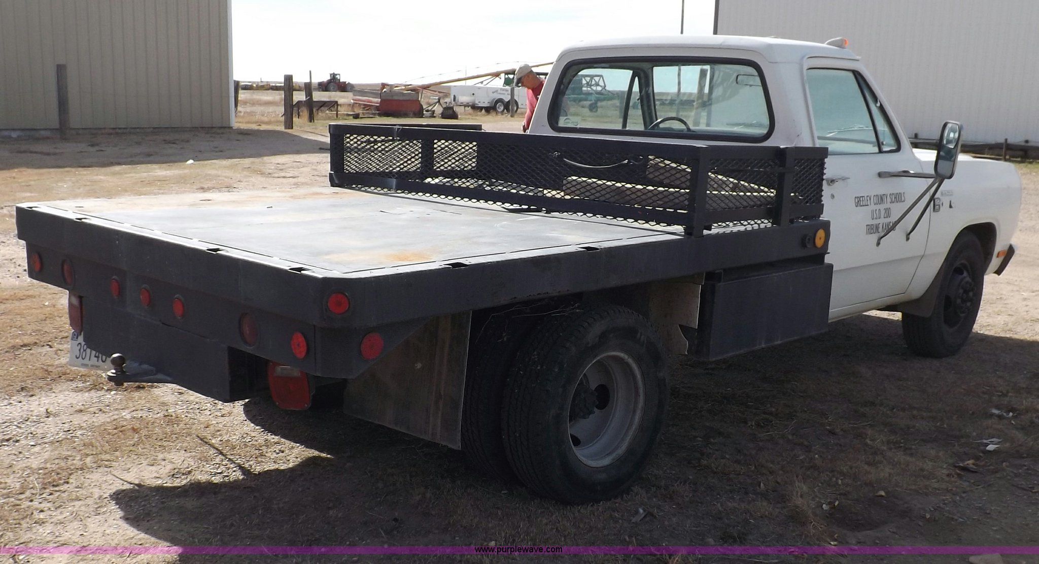Purple Wave is selling a used Passenger Vehicle in Kansas. This item is a 1982 Dodge Ram D350 custom flatbed truck with the following: 80,558 miles on odometer, 5.9L V8 gas engine, Four speed manual transmission, AC and heat, Manual windows and locks, Cloth interior, 9'L x 7.5'W stake bed, Livestock rails, Gooseneck receiver, Trailer wiring, 245/75R16 tires, Auxiliary fuel tank is not included